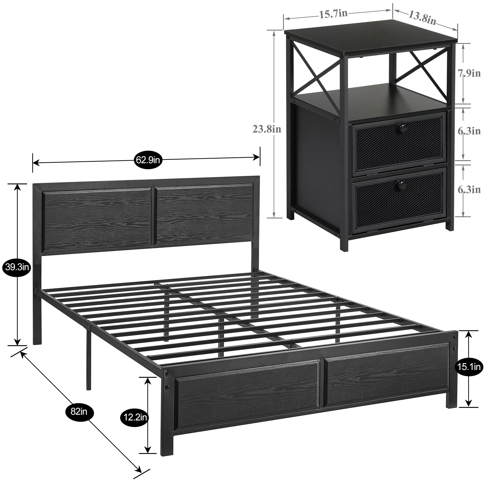 VECELO 3-Piece Bedroom Set Includes Queen Platform Bed Frame and Nightstands with 2-Drawer, Black