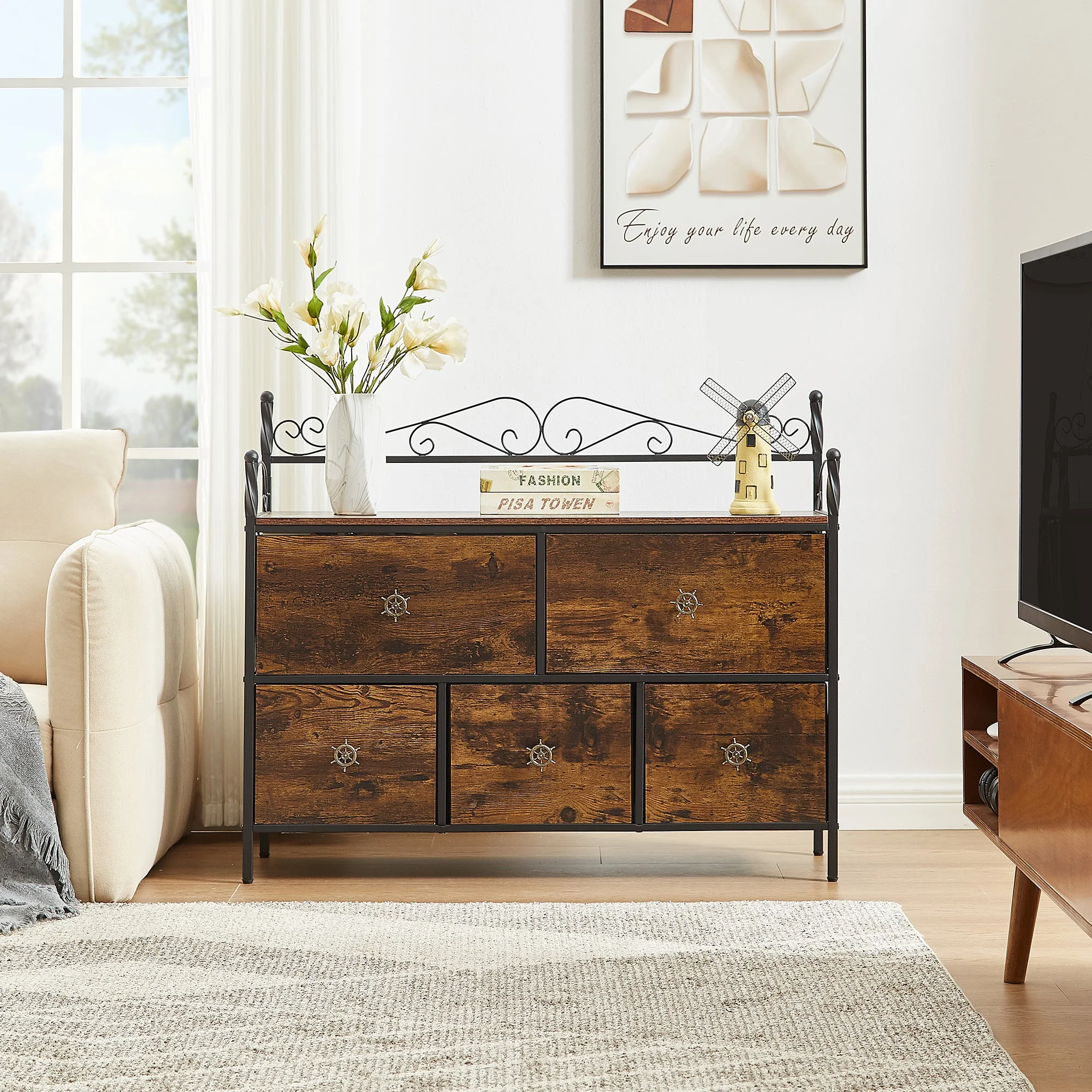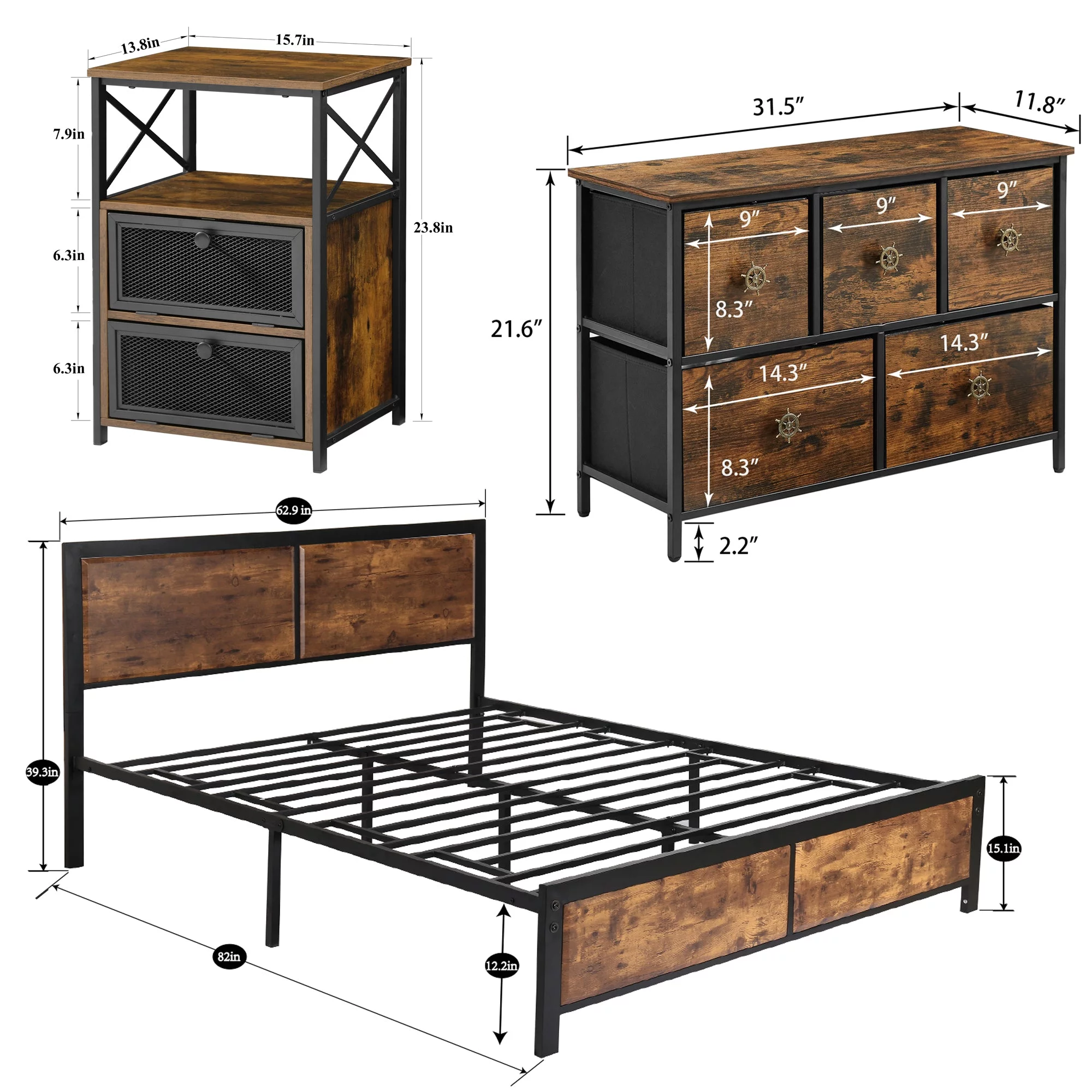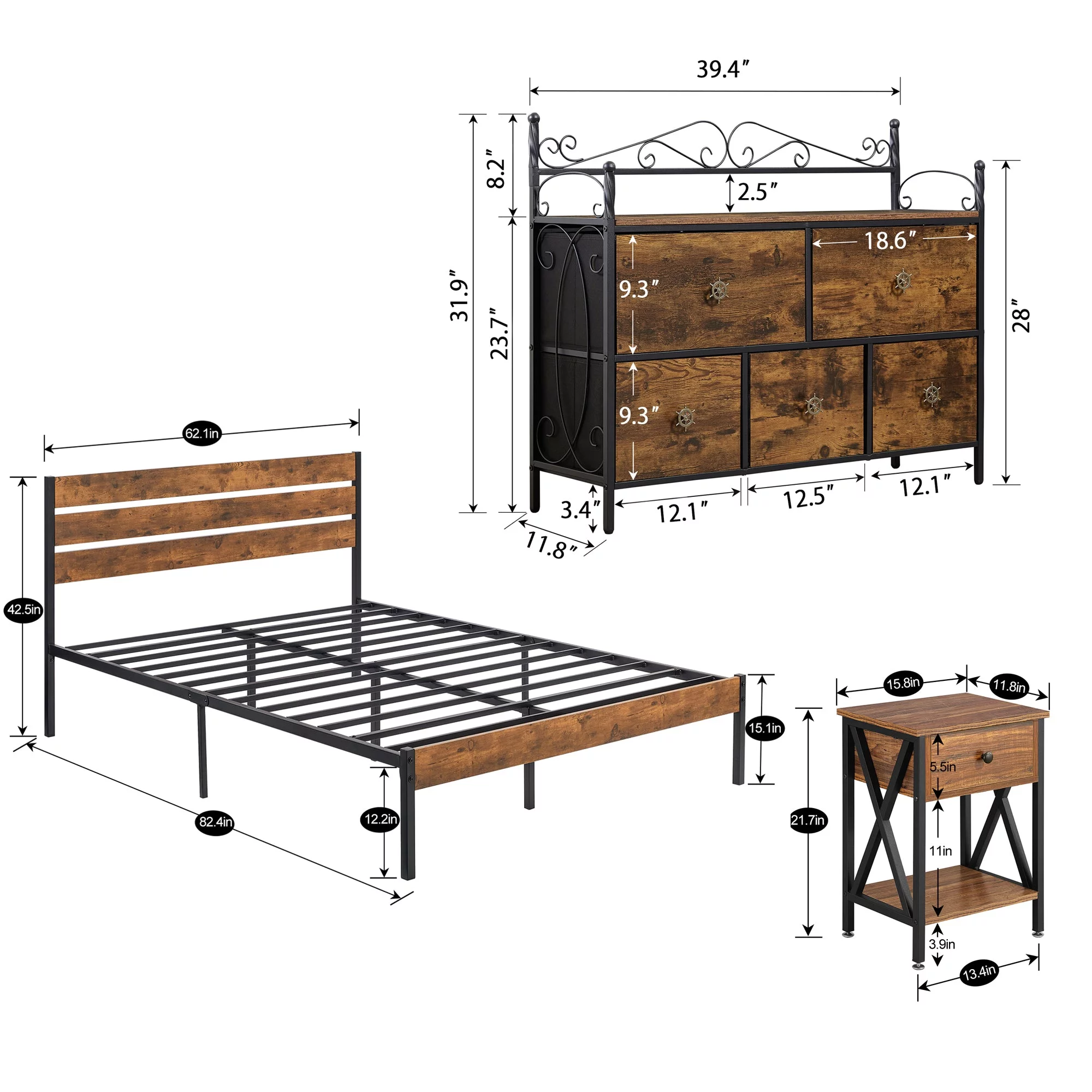 VECELO Juego de Dormitorio Tamaño Queen de 4 Piezas con Armazón de Cama, Tocador de 5 Cajones y Dos Mesitas de Noche, Marrón