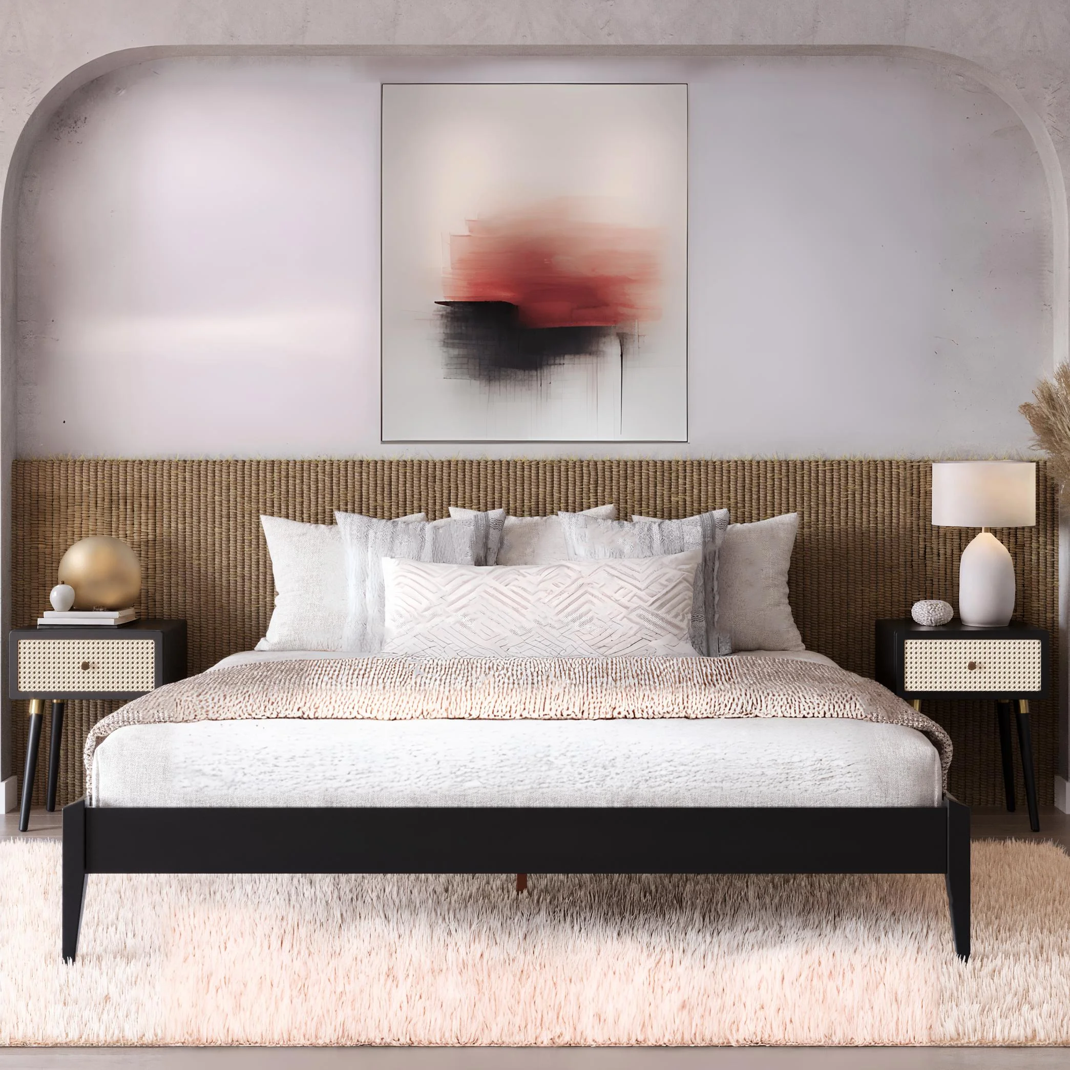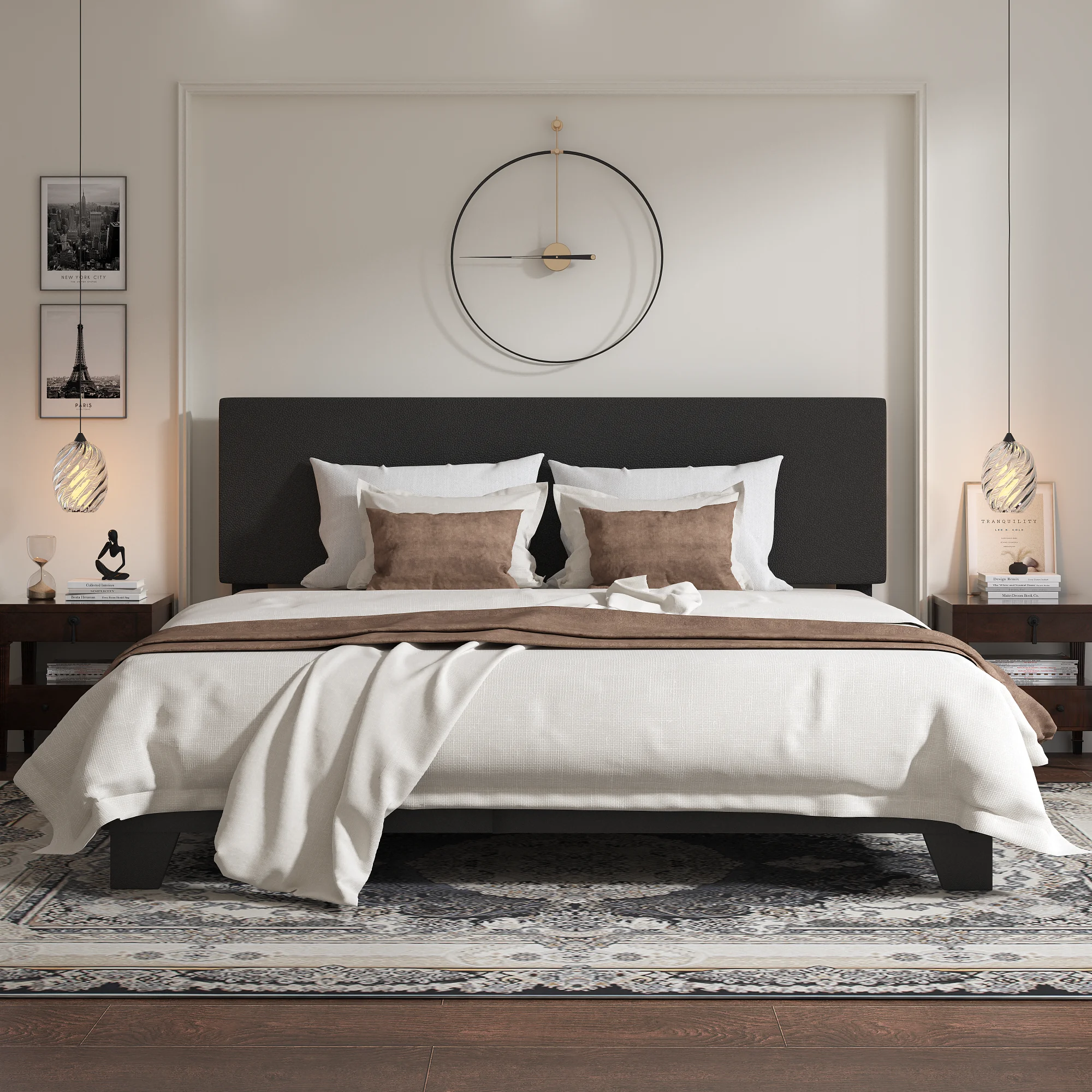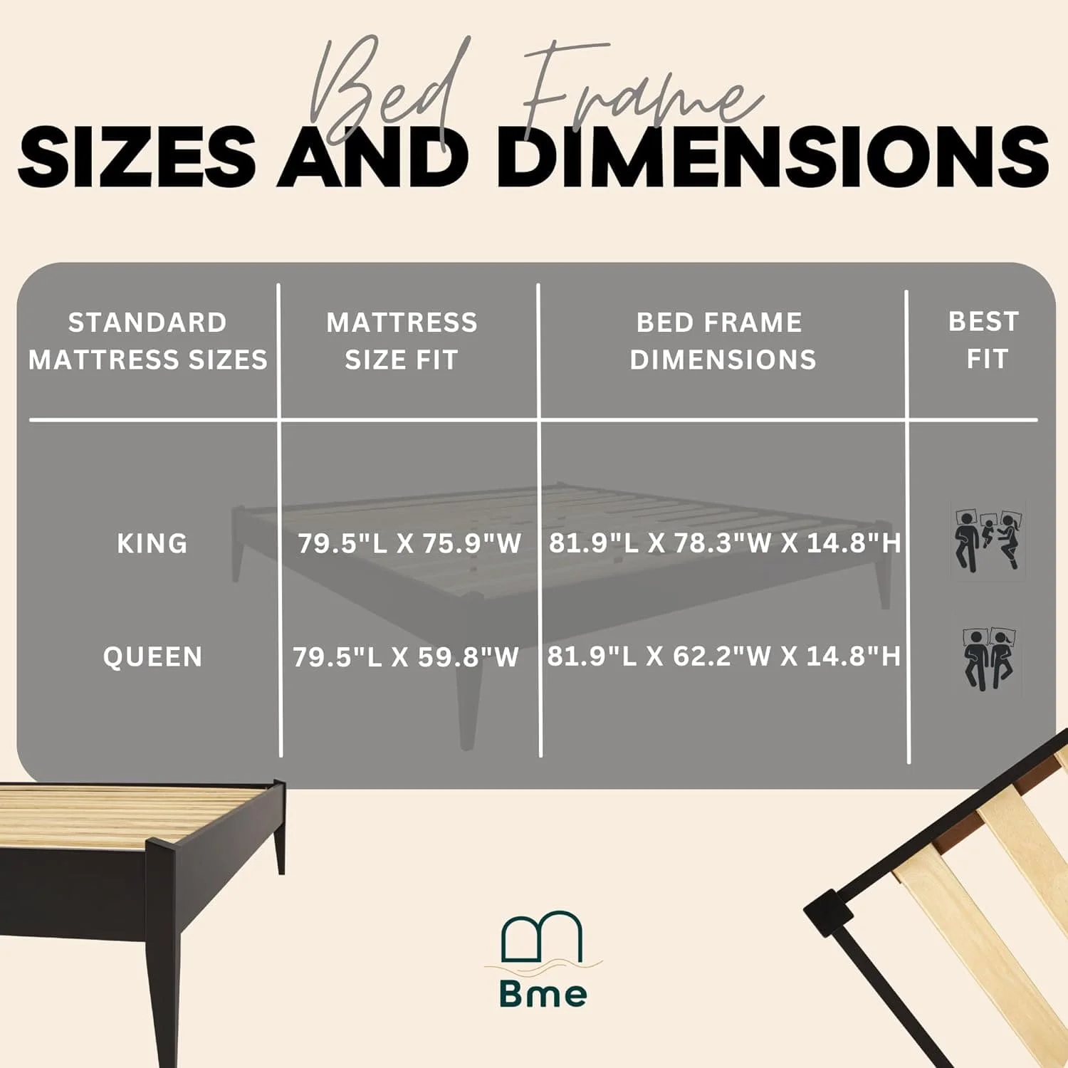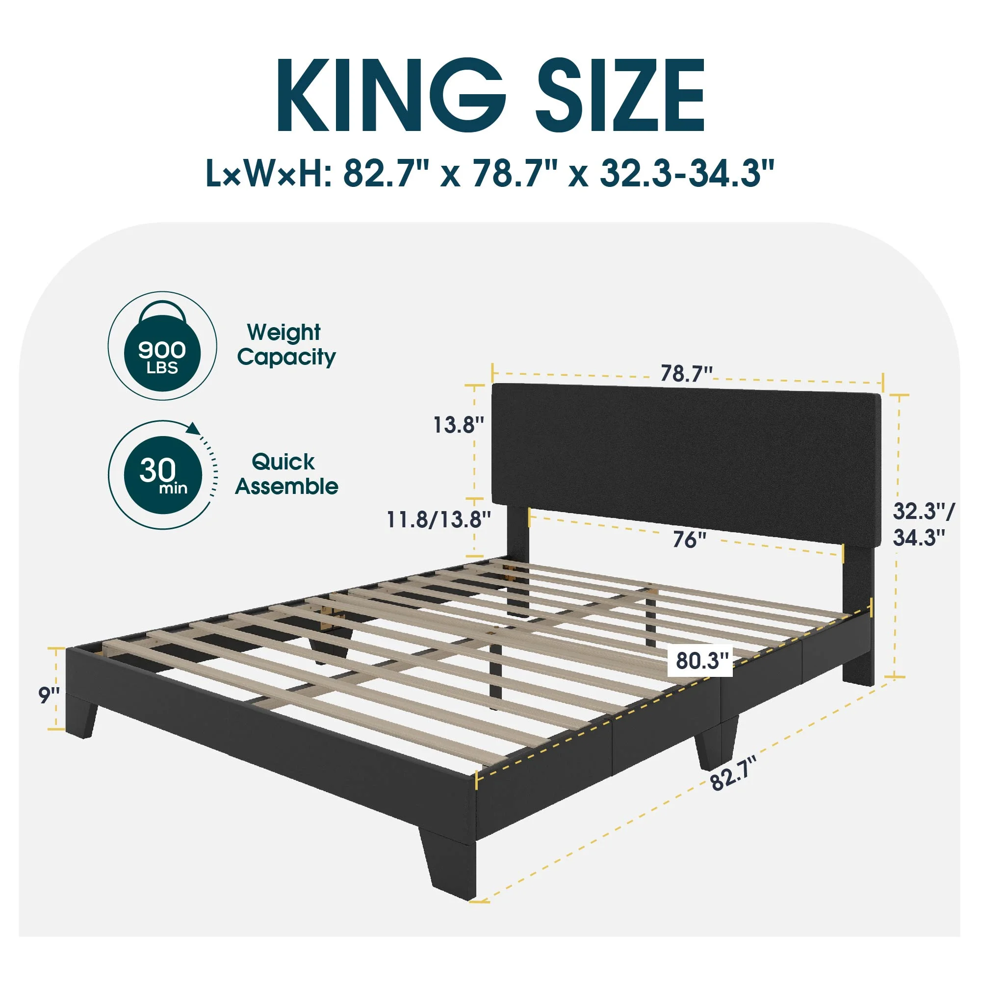 BME Keelin 15" King Size Platform Bed Frame, Modern, Solid Wood Bed, Ivory Black