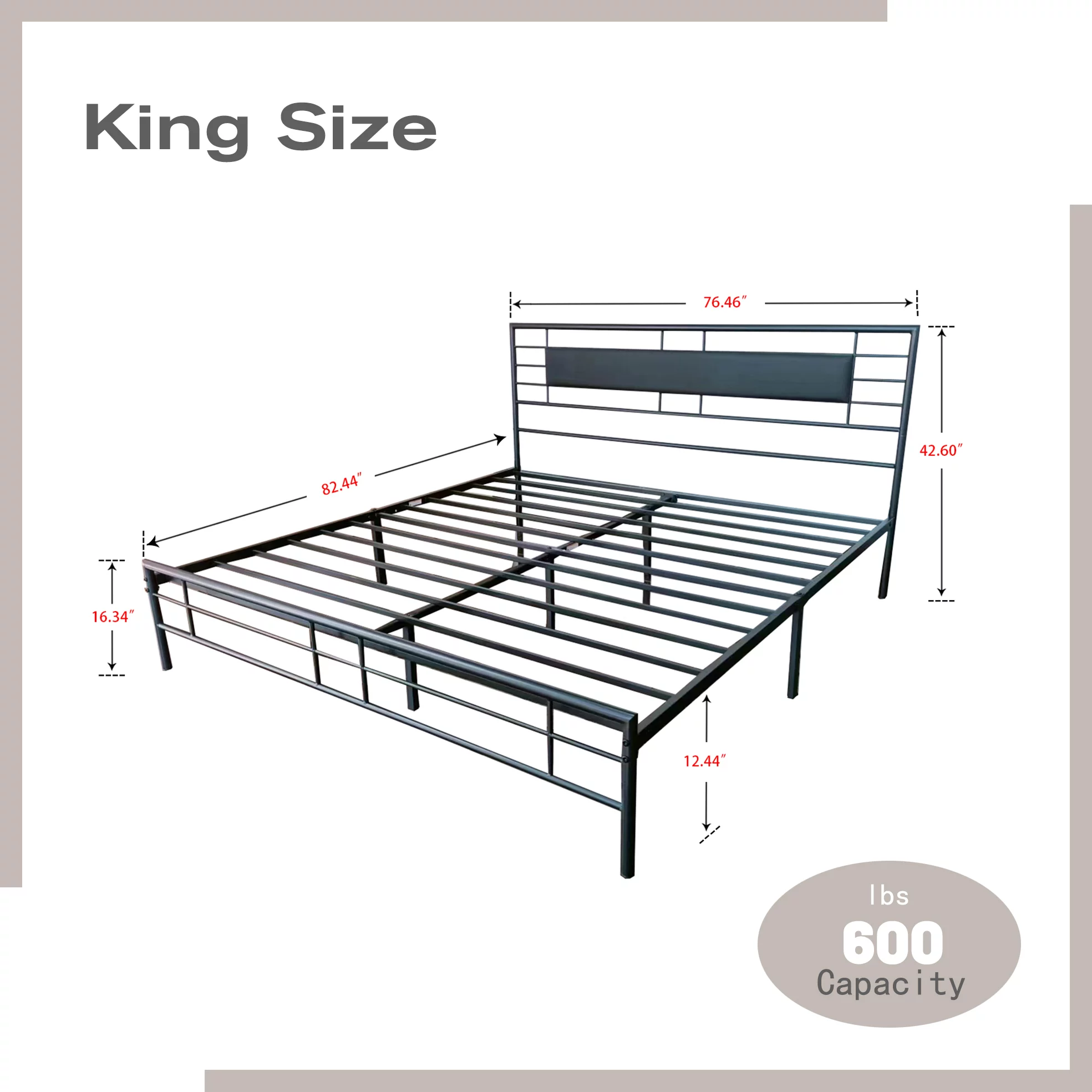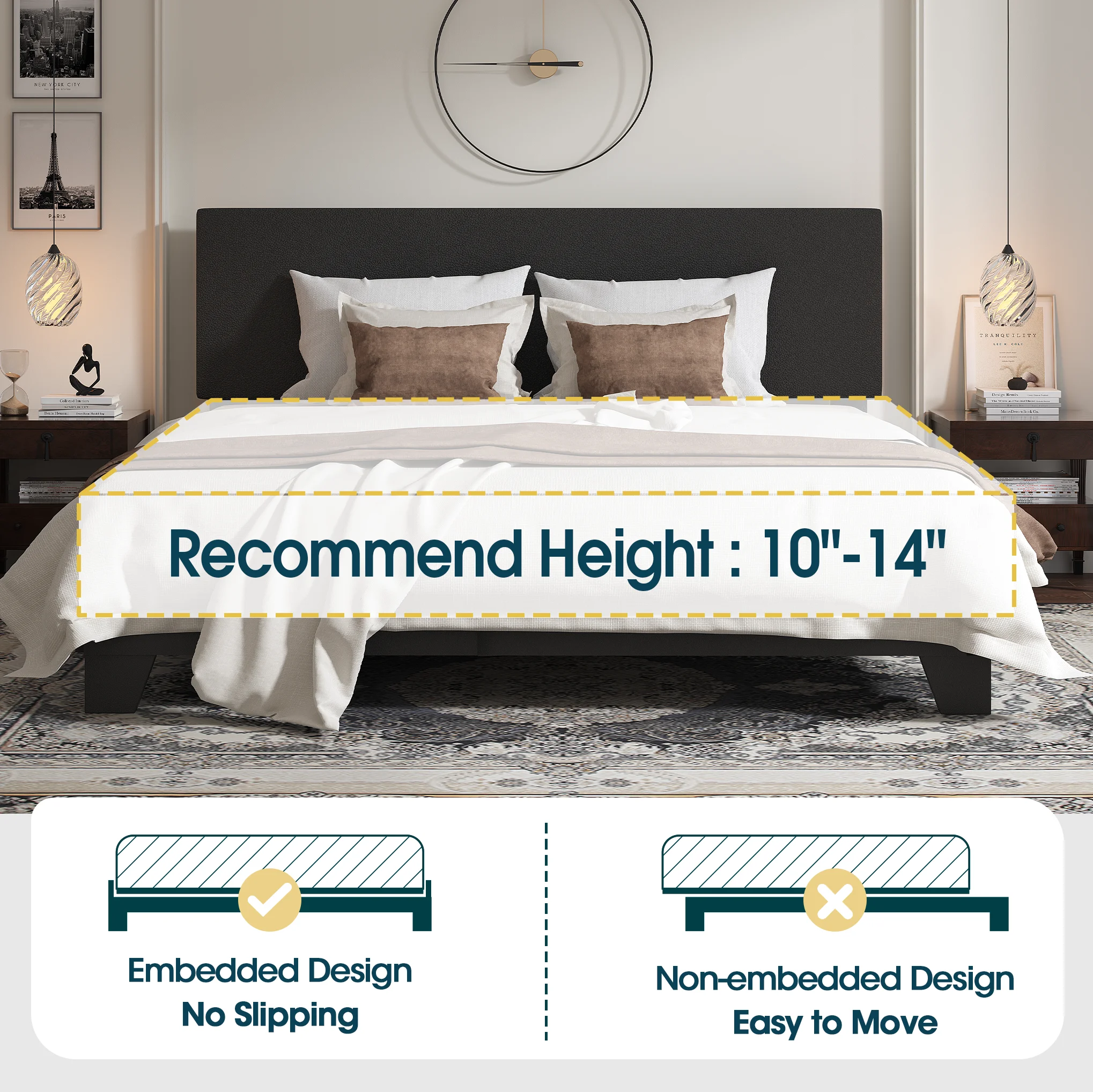 NNV King Size Platform Metal Bed Frame with Leather Upholstered Headboard, Black