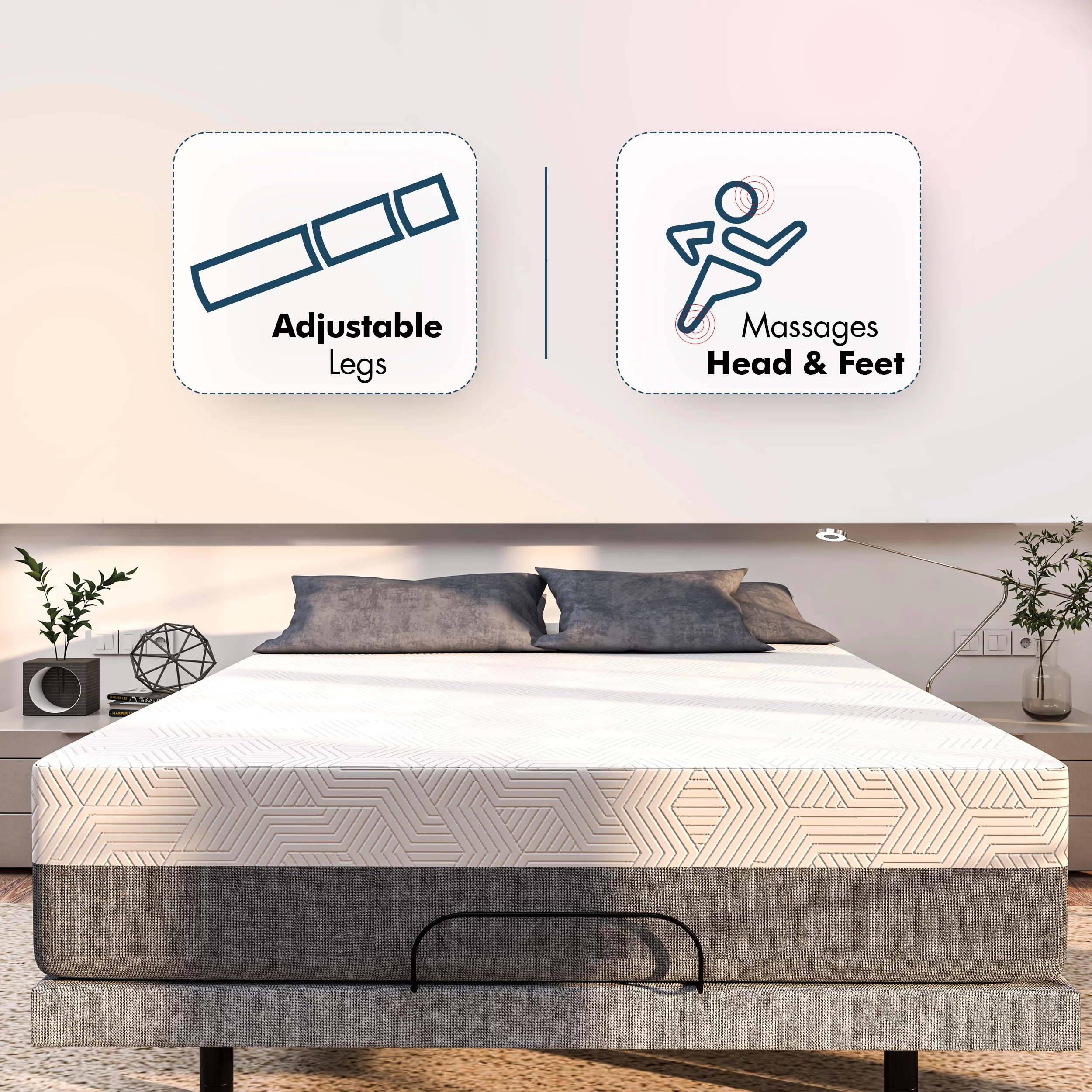 Smart Adjustable Queen Bed Base Dual Massage, Wireless Remote, App Control, 14" Hybrid Mattress Included