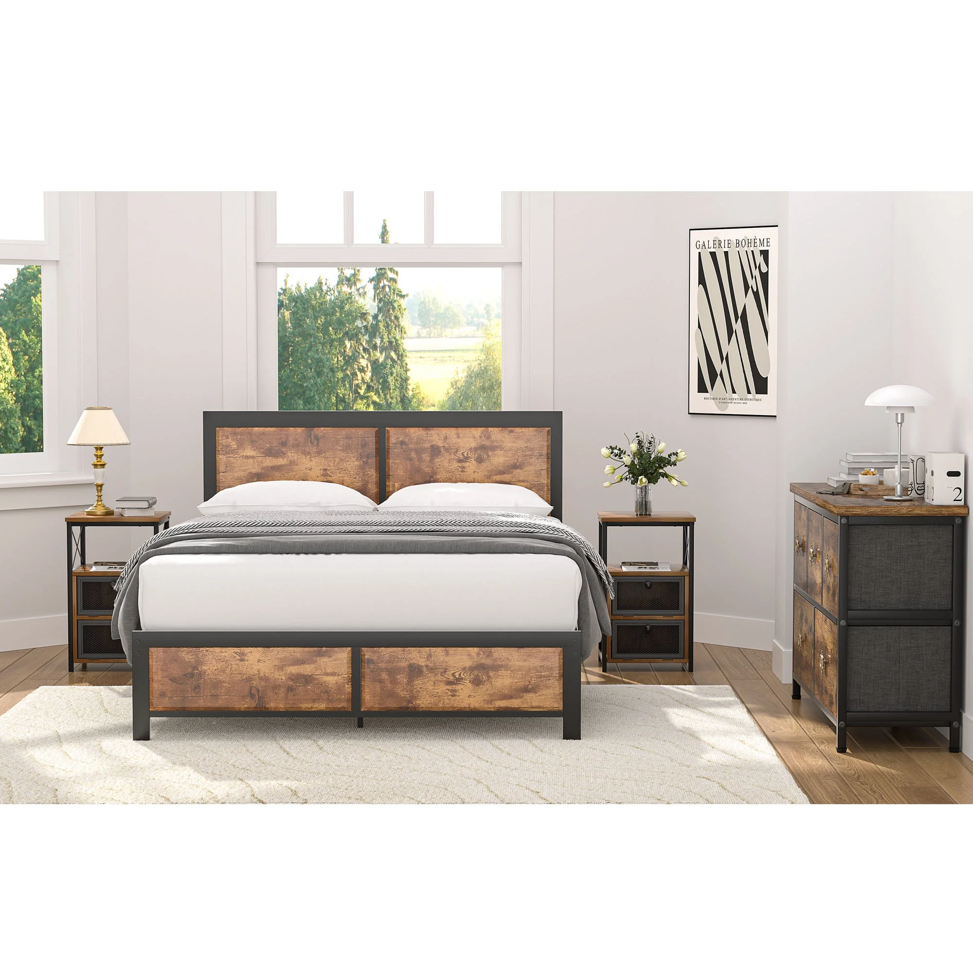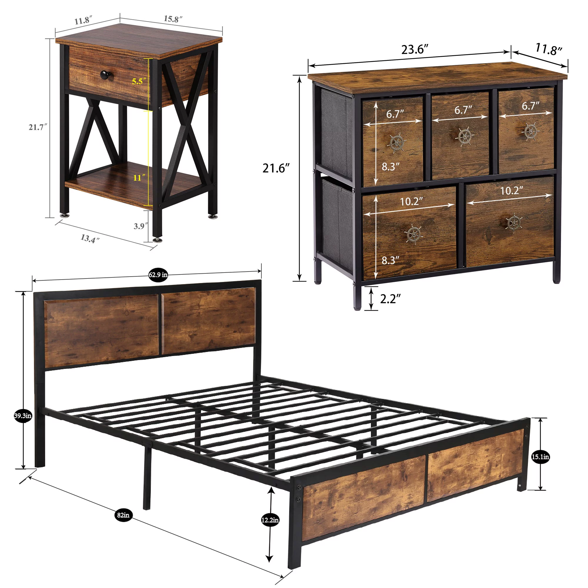 VECELO 4-Piece Bedroom Set with Queen Size Platform Bed Frame & 5-Drawer Dresser & Two Nightstands, Brown
