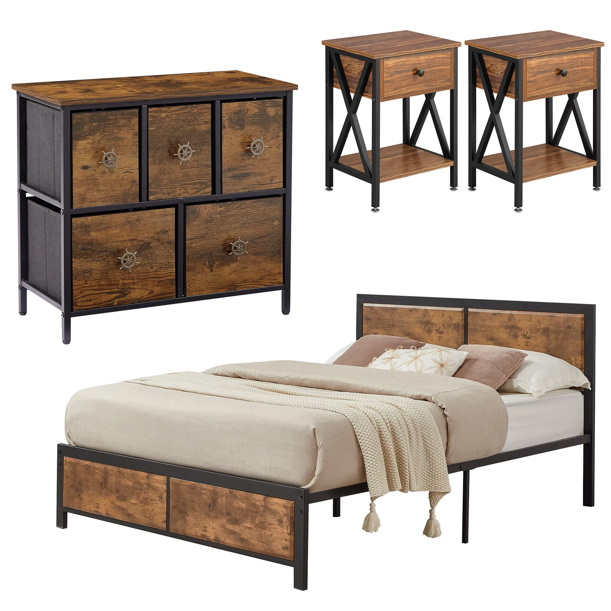 VECELO 4-Piece Bedroom Set Include Queen Size Bed Frame & Dresser & 2 Nightstand, Brown