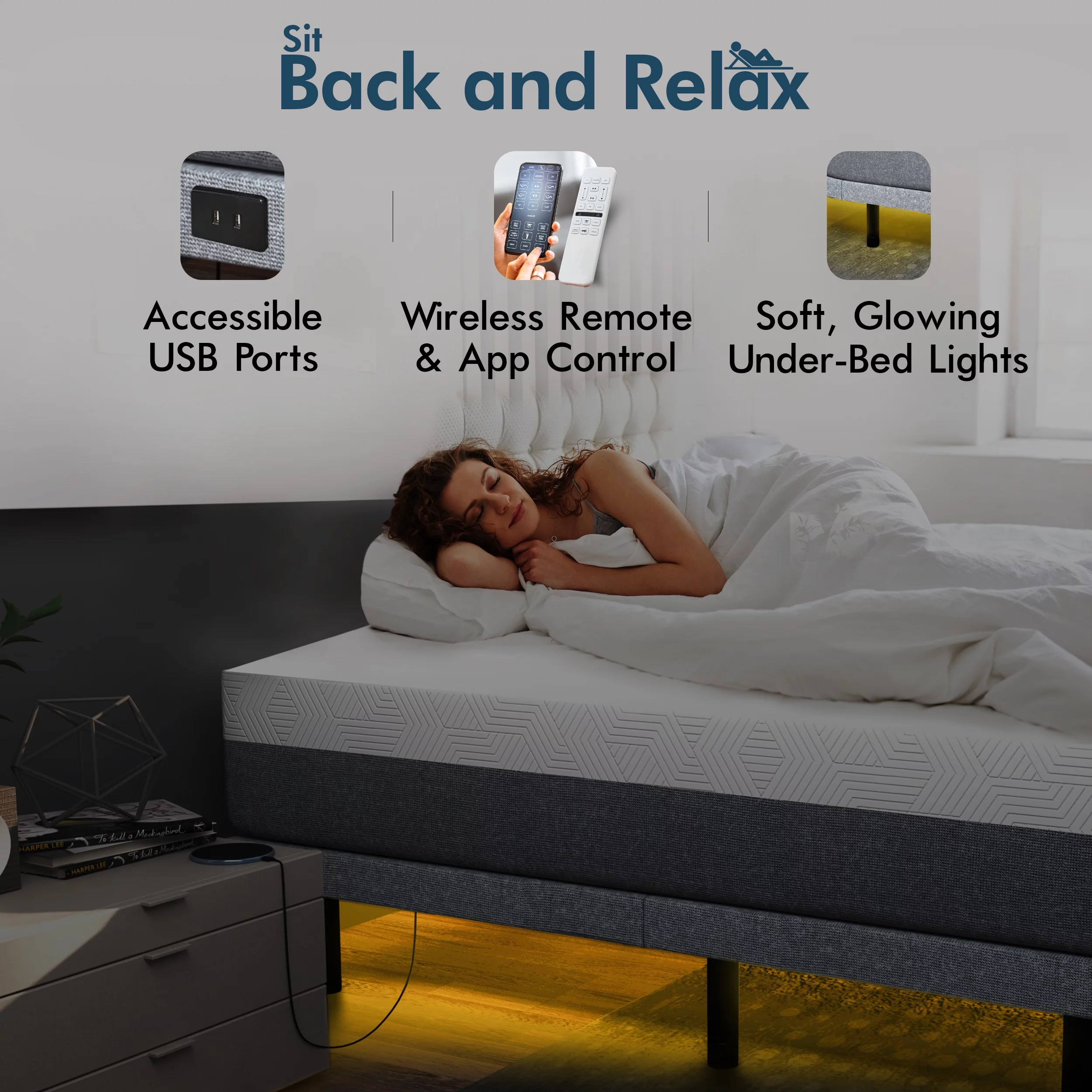 Motorized Bed Frame for Queen Size Mattress w Remote, USB Ports, & Massage