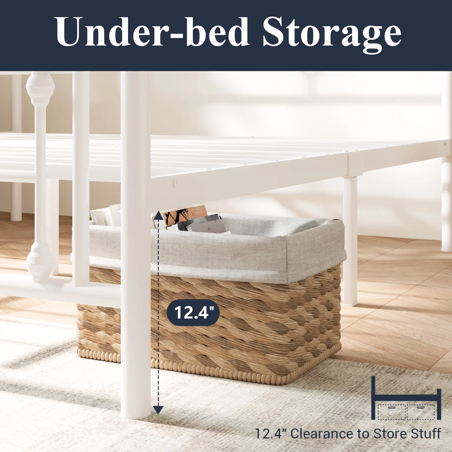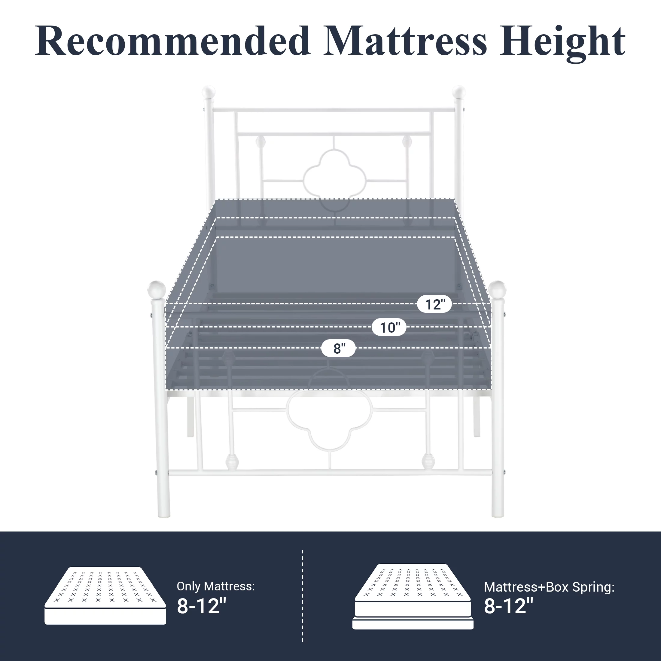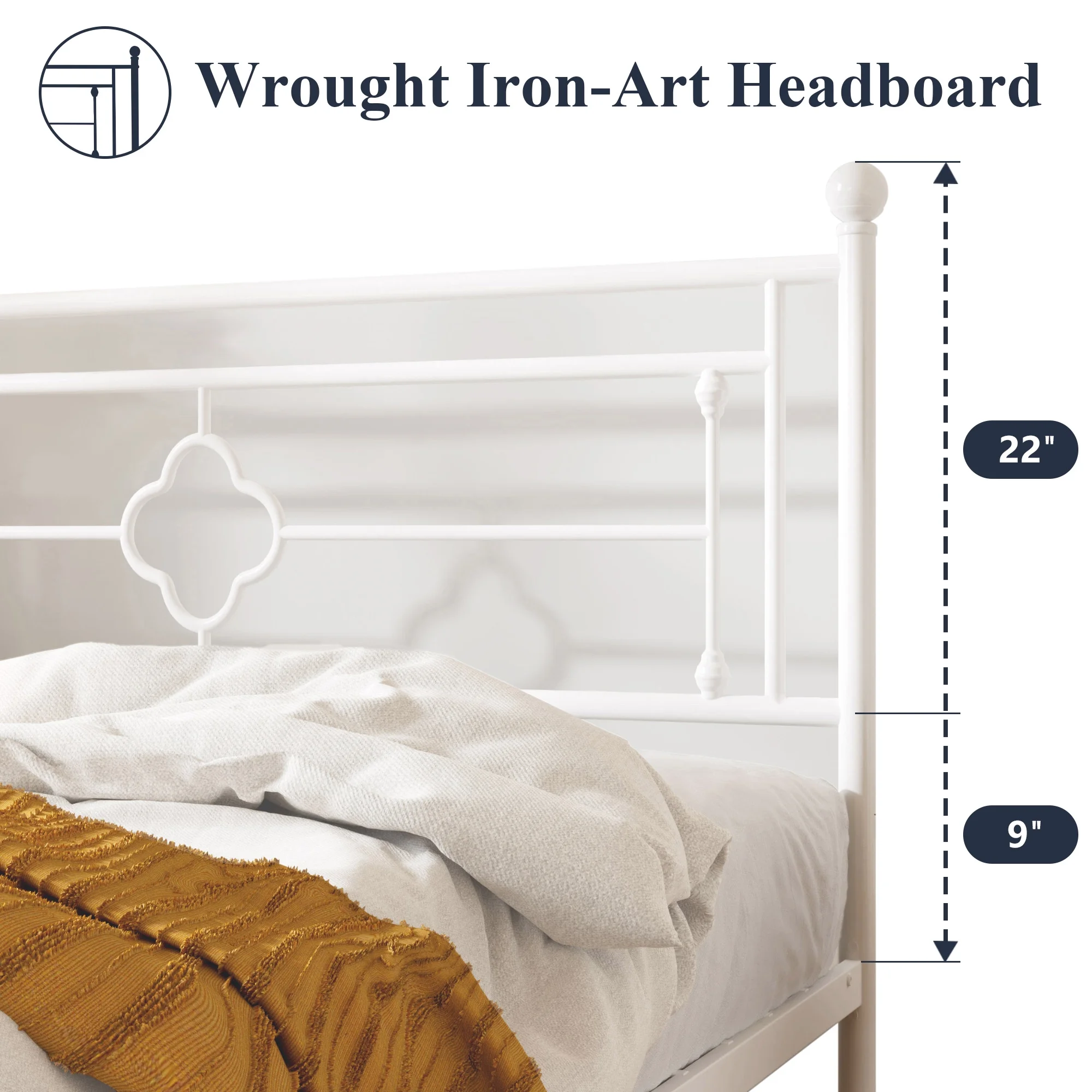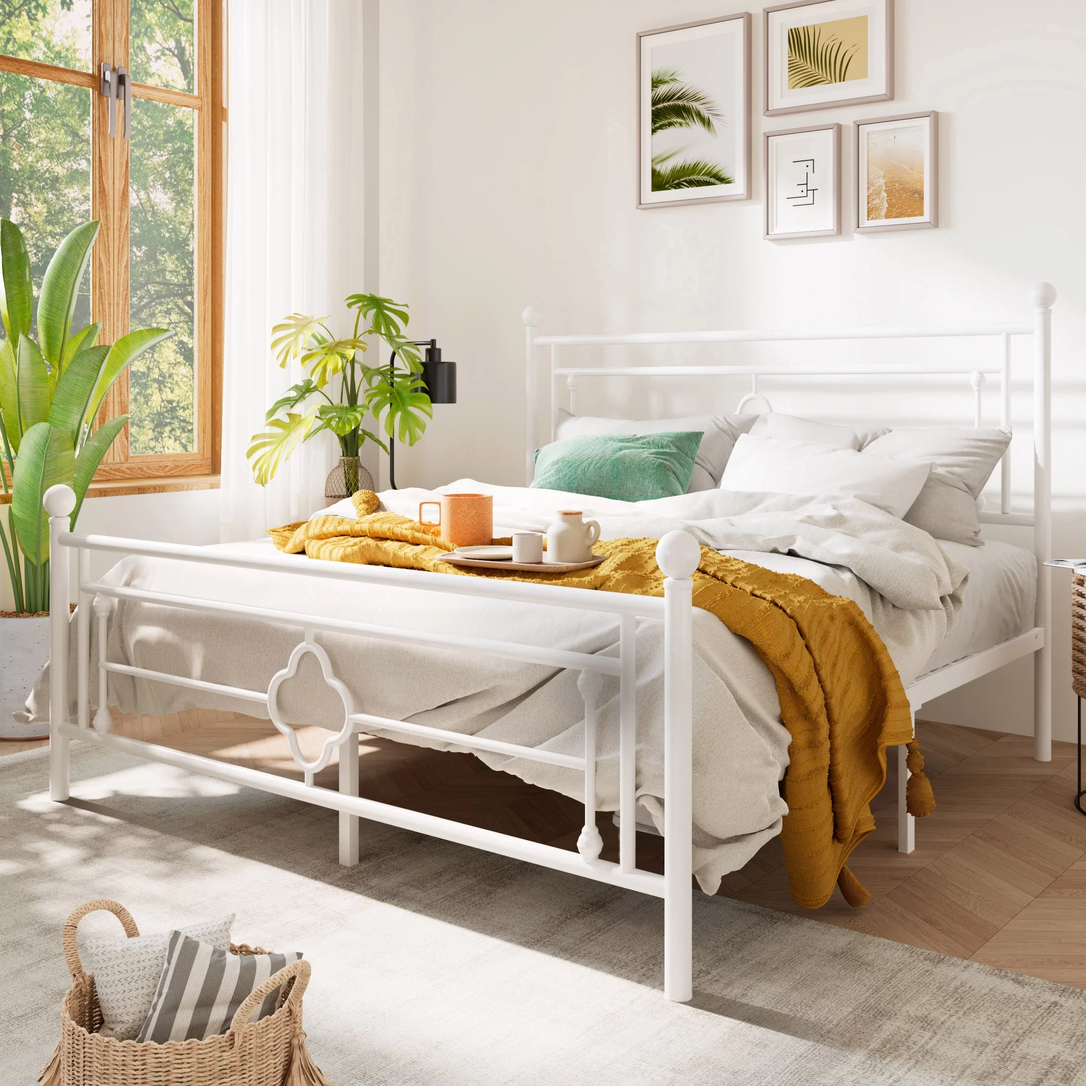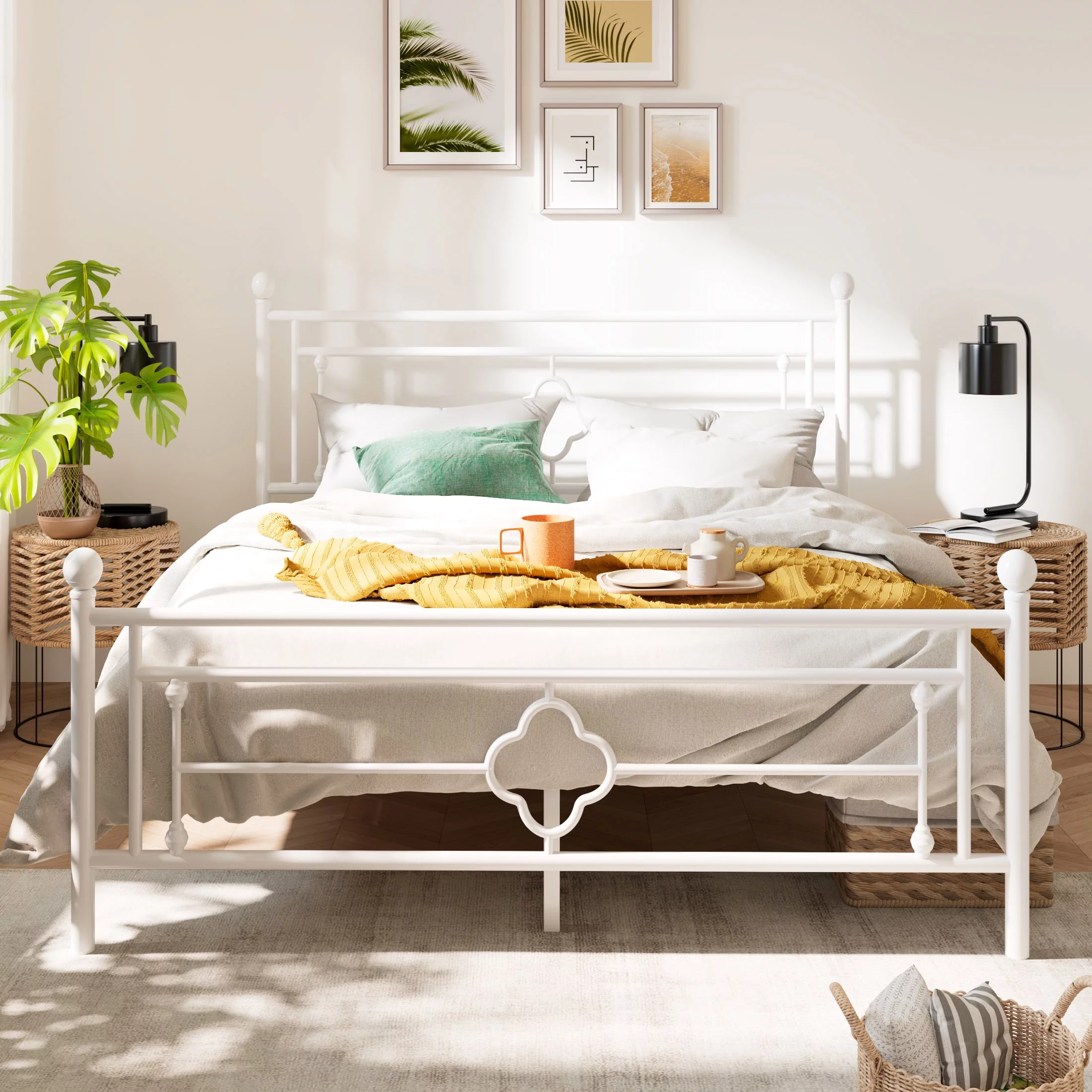 Sha Cerlin White Queen Size Metal Platform Bed Frame with Victorian Vintage Headboard