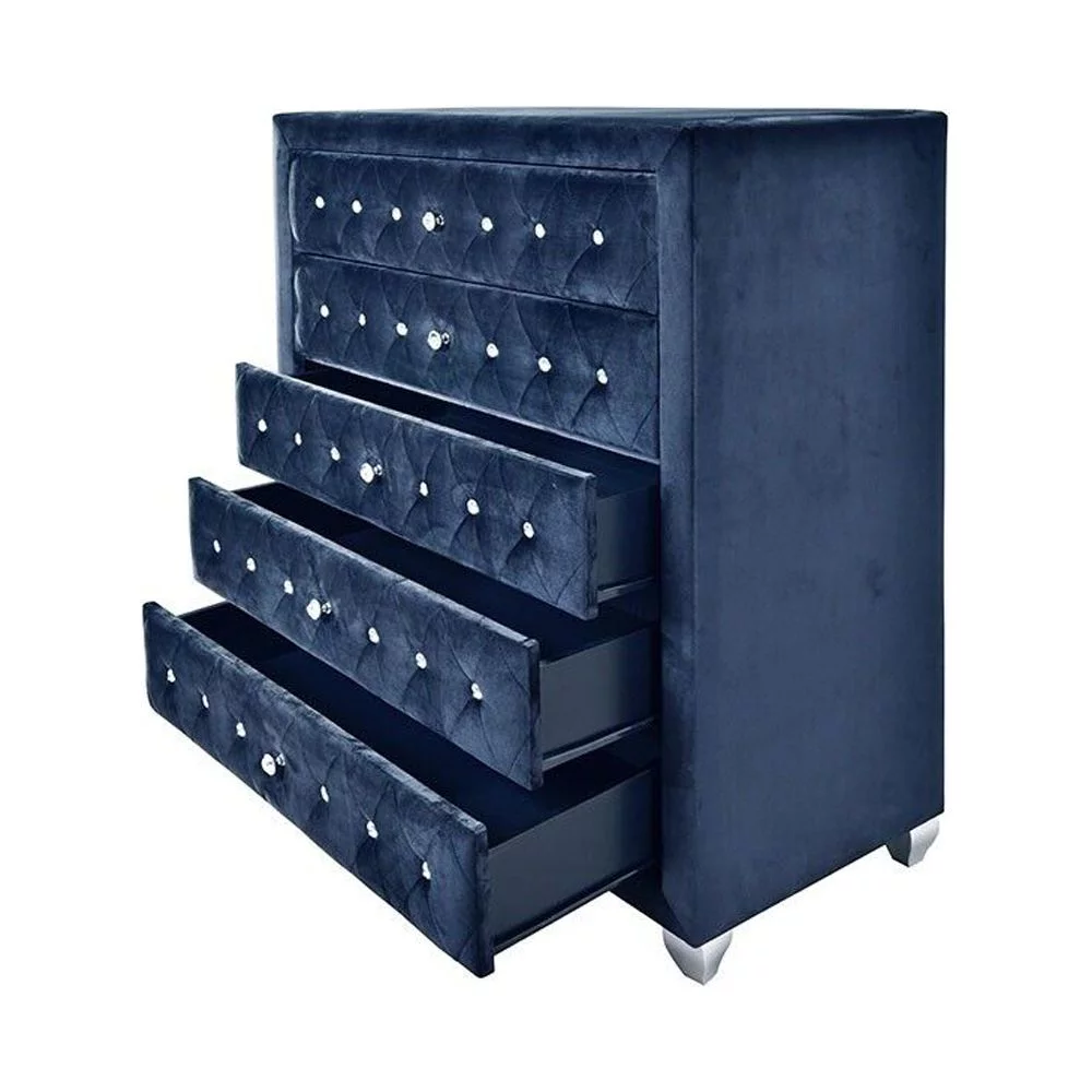 Modern 3Pc King Size Bed Chest Nightstand Set Master Bedroom Furniture Blue Velvet Upholstery