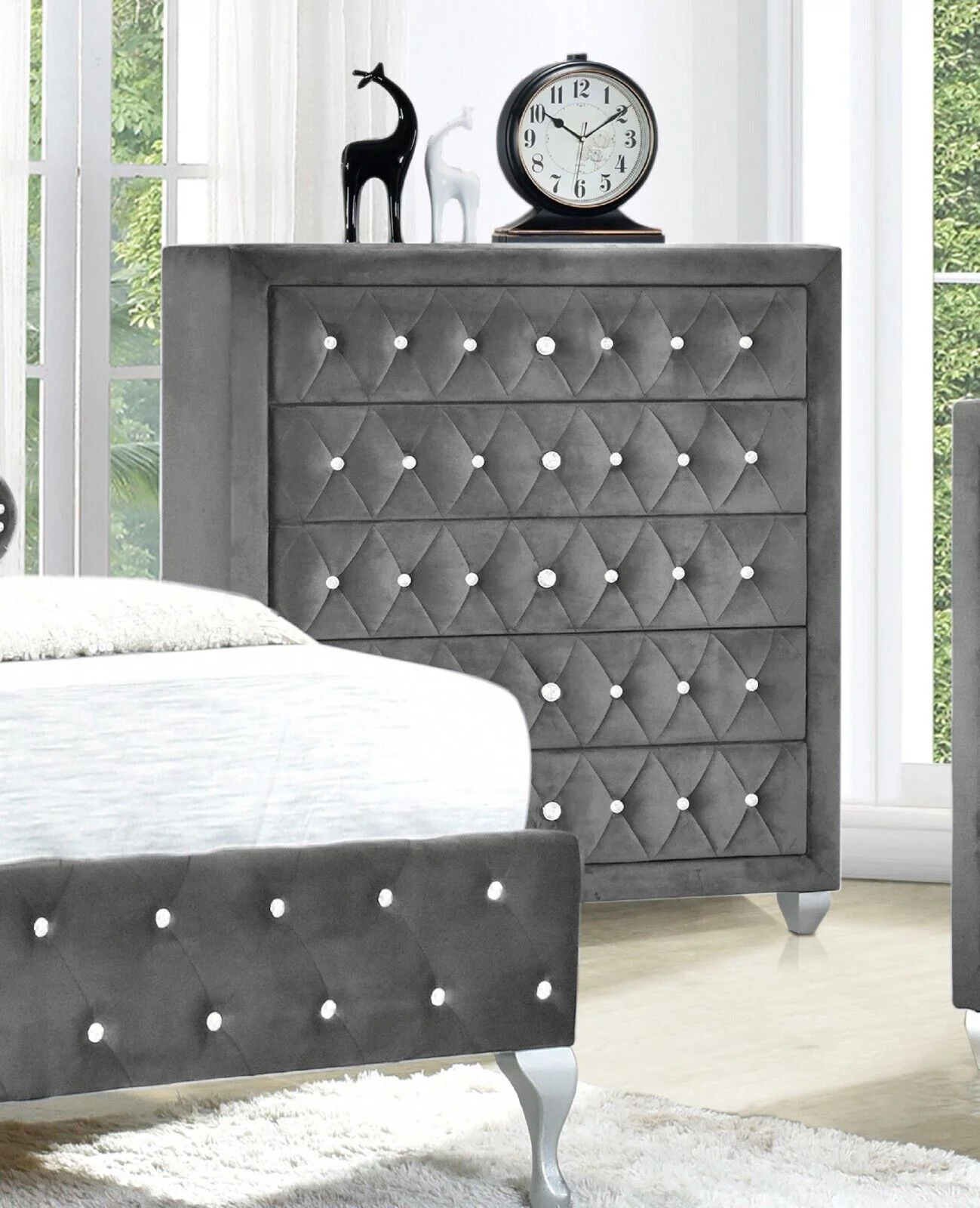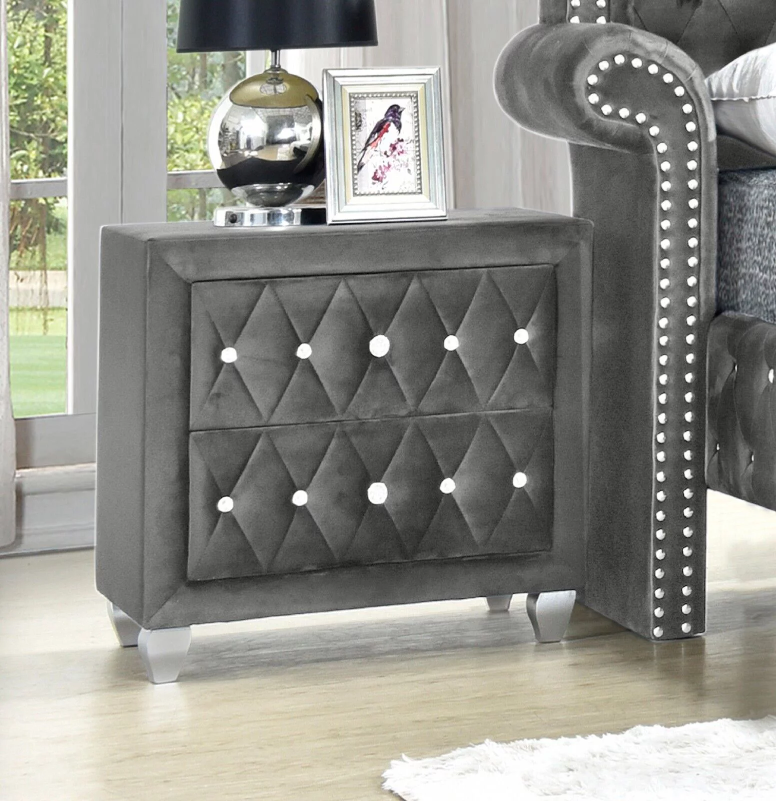 Modern 3Pc King Size Bed Chest Nightstand Set Master Bedroom Furniture Gray Velvet Upholstery