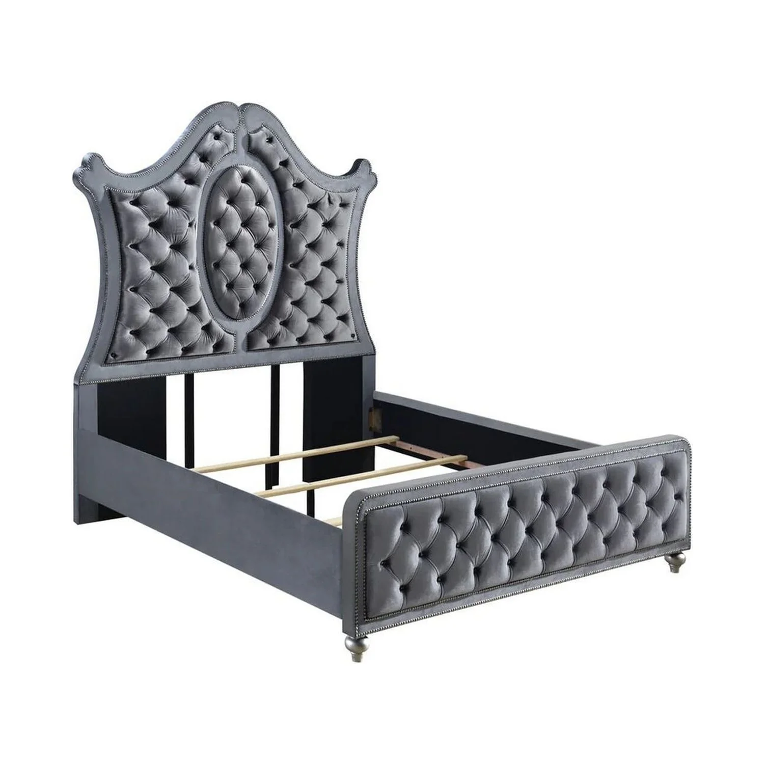 Benjara Rall Queen Size Bed, Curved Wood Headboard, Tufted Gray Fabric Upholstery