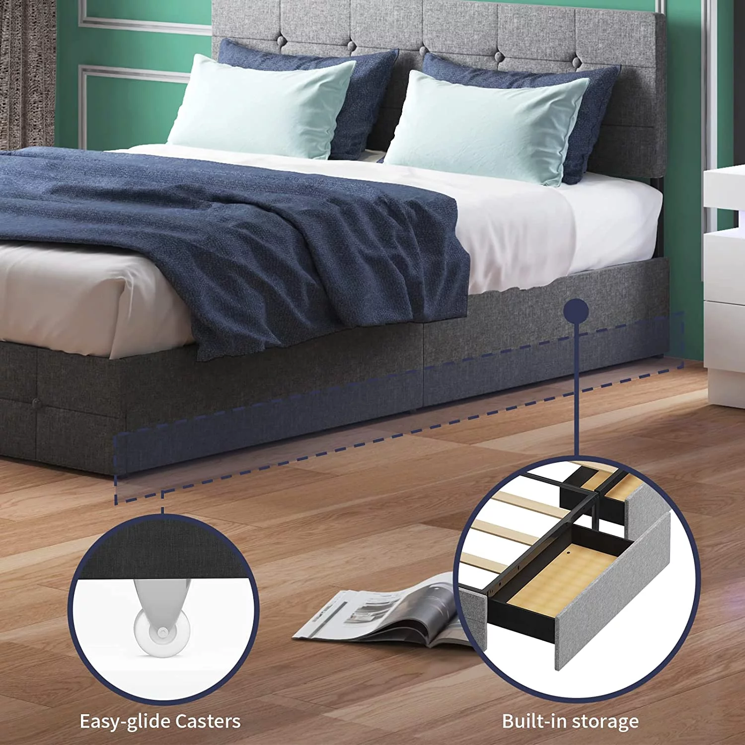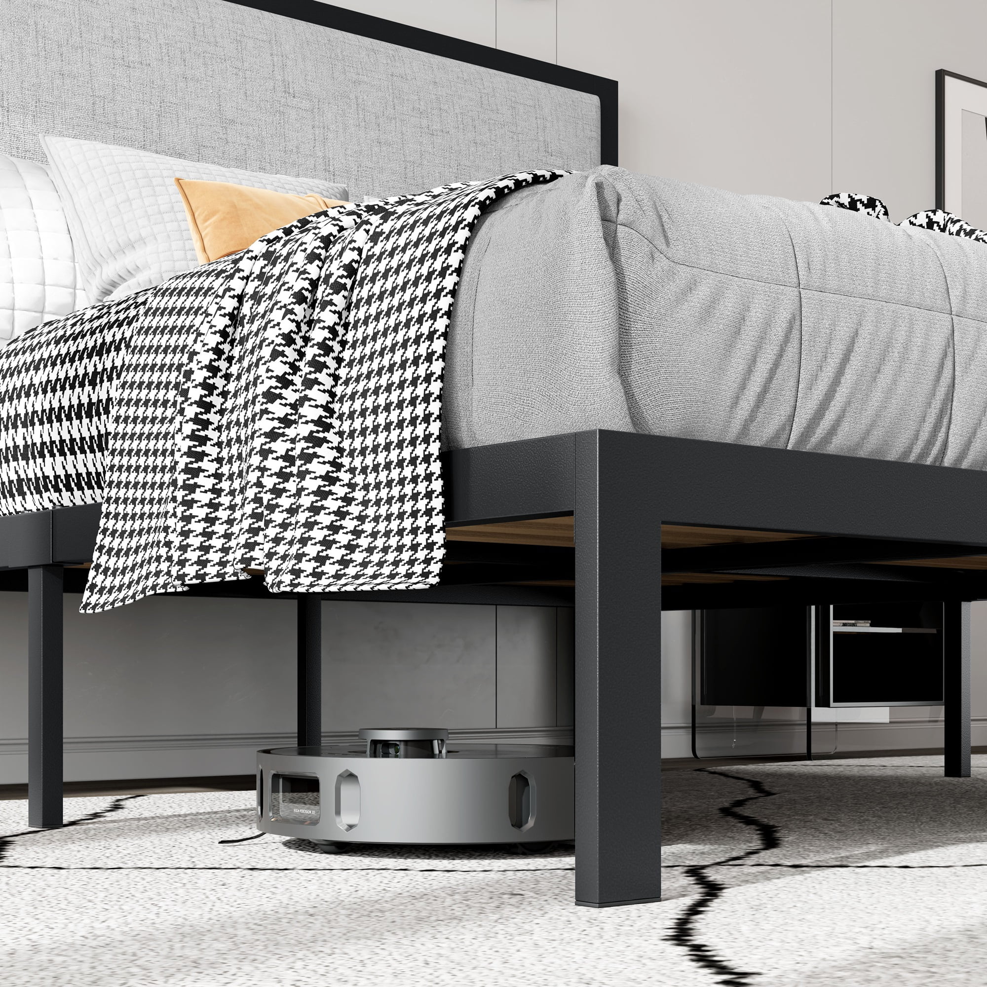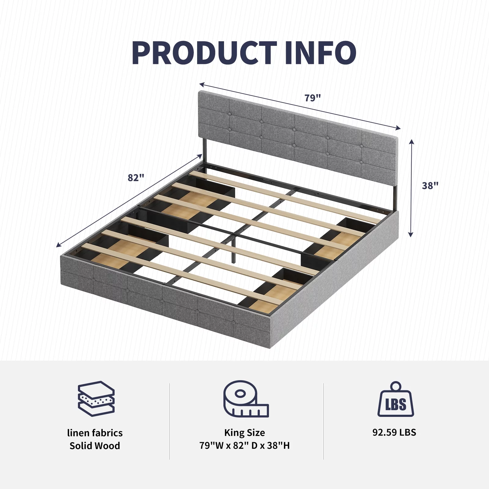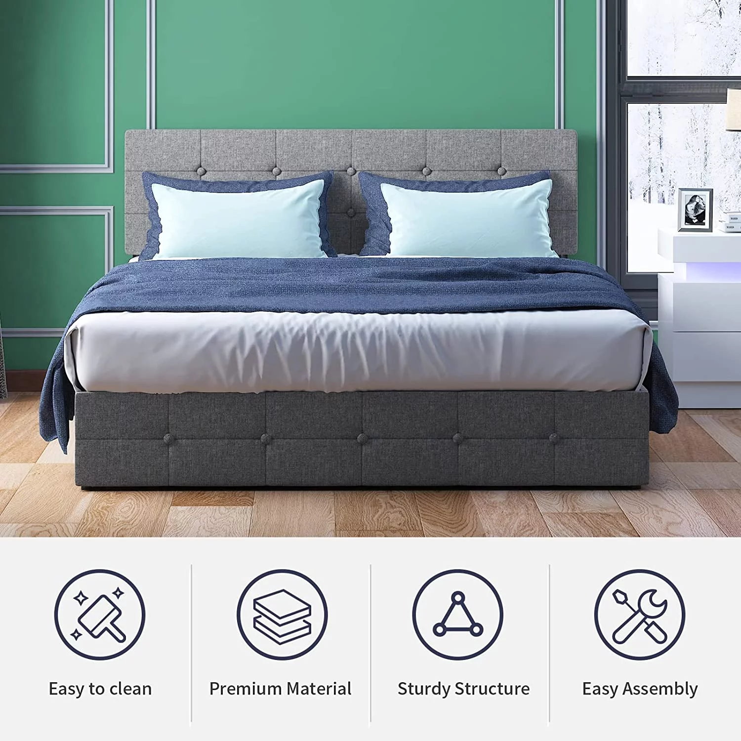 SHA CERLIN Grey King Size Platform Bed Frame with Fabric Headboard & Underbed Storage, Adult