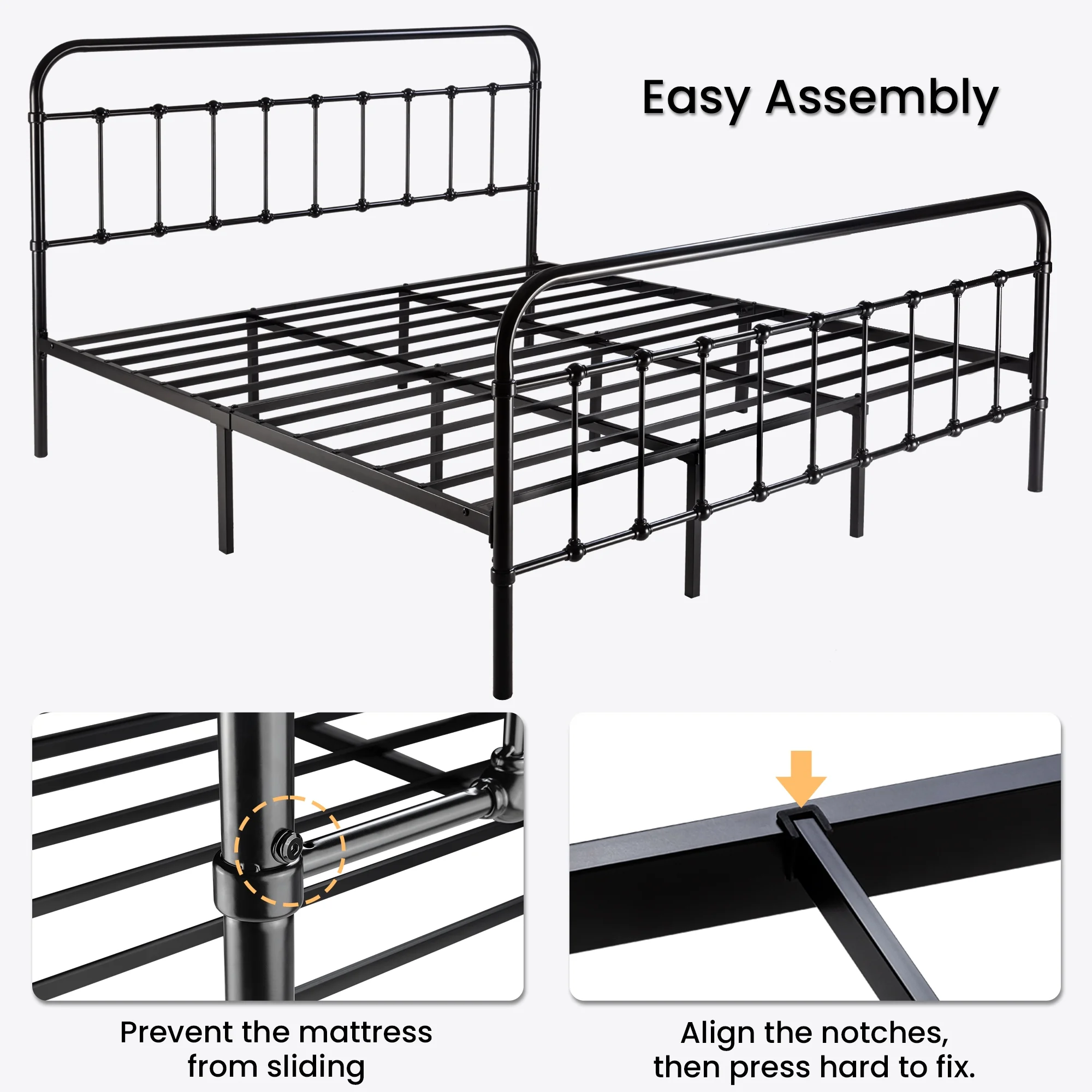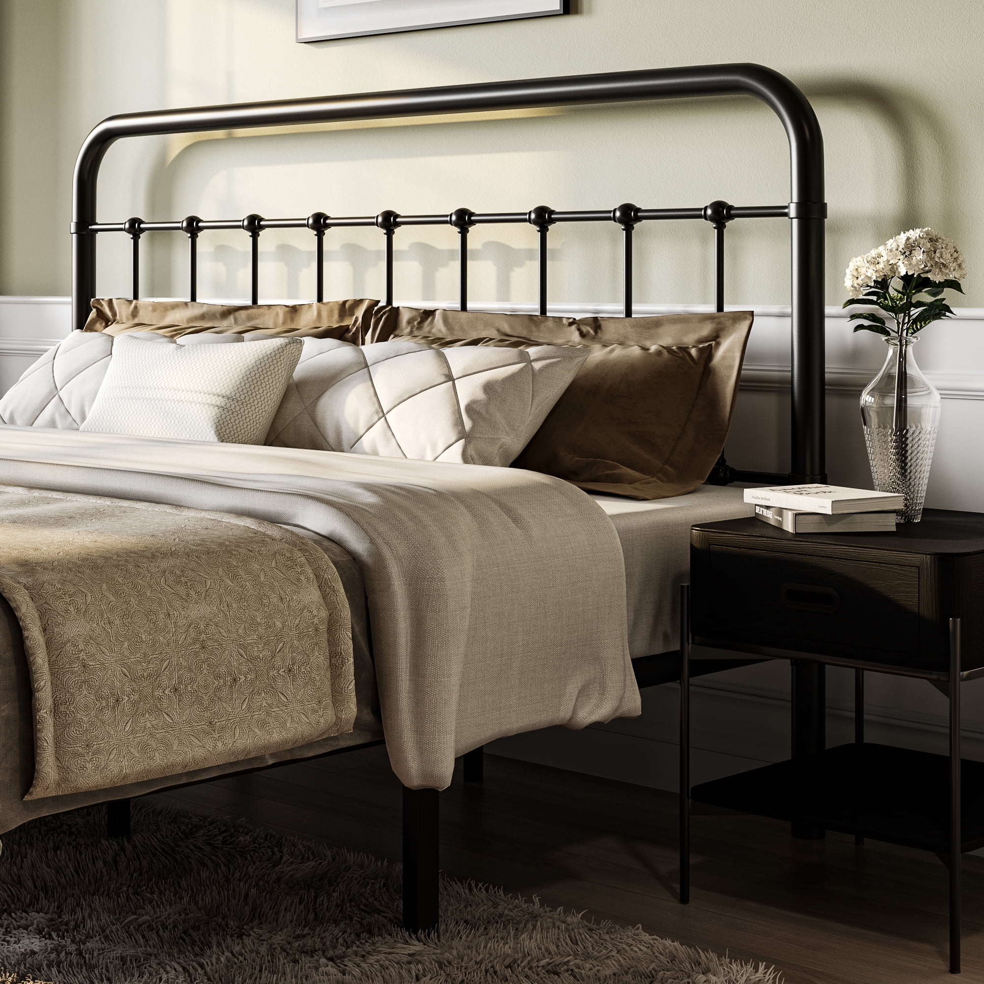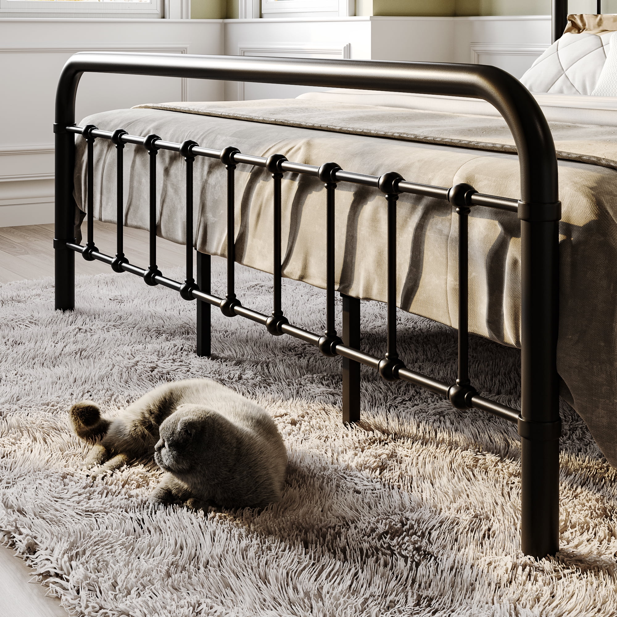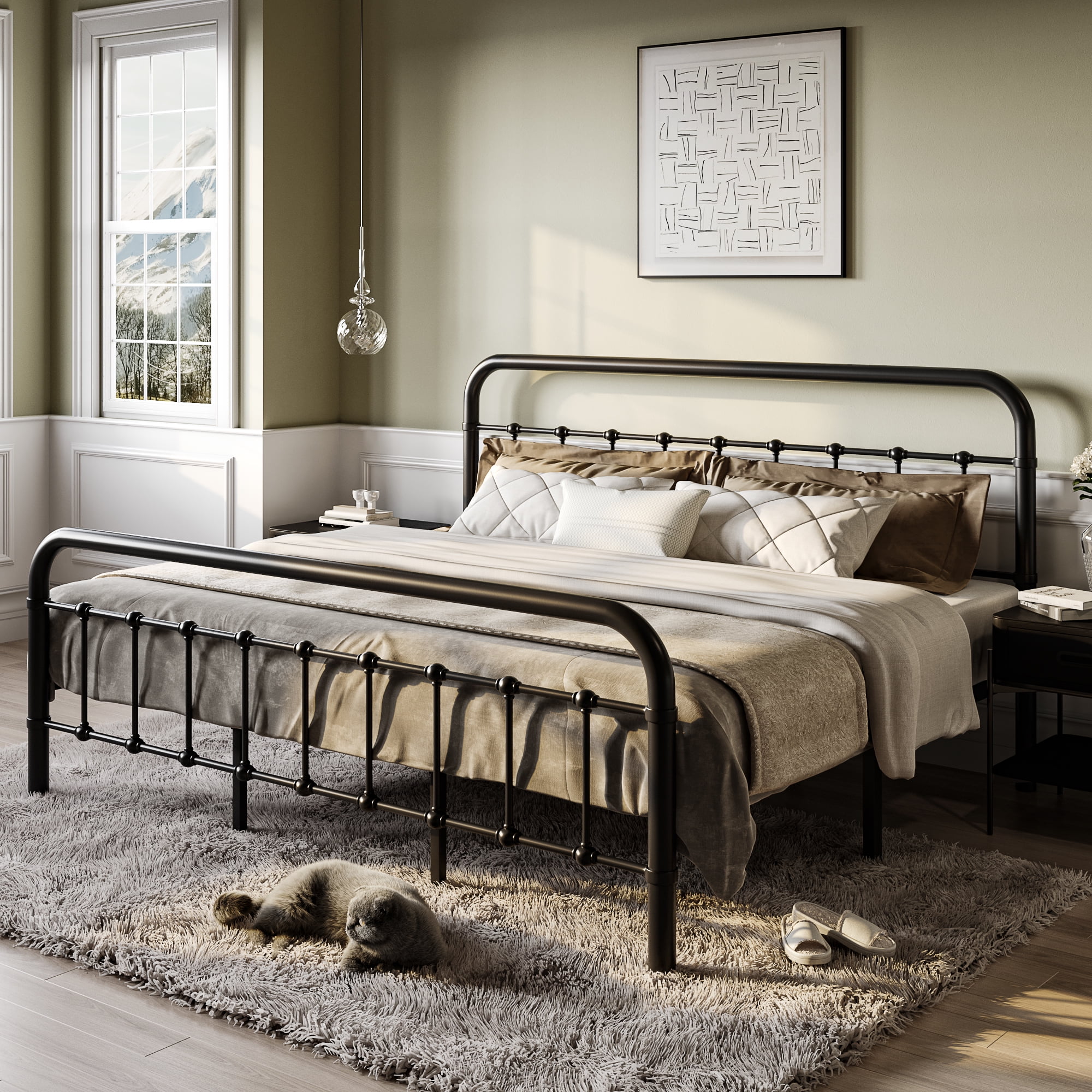 Sha Cerlin Black King Size Metal Platform Bed Frame with Vintage Headboard & Footboard, Adult