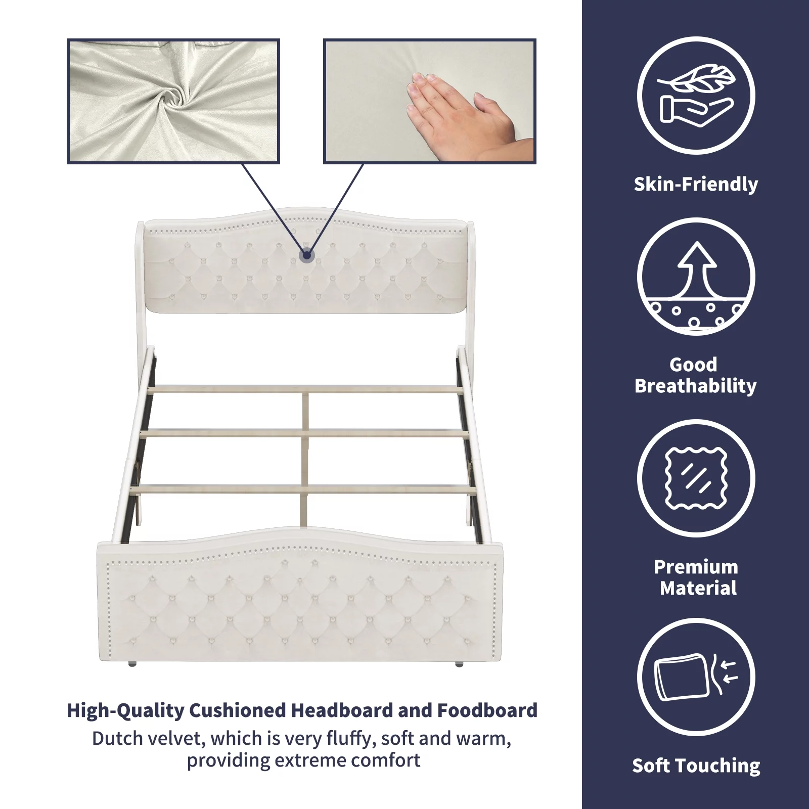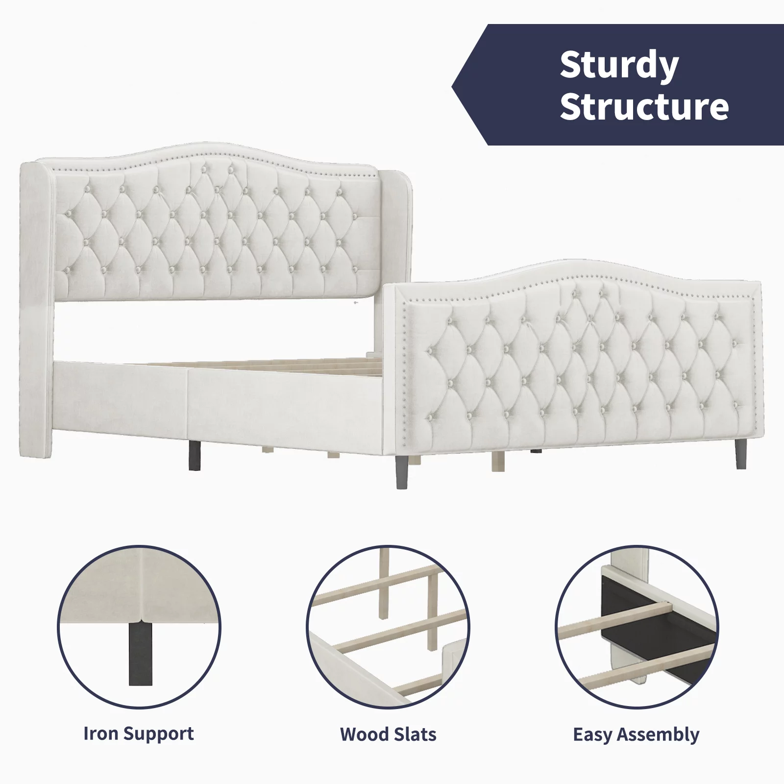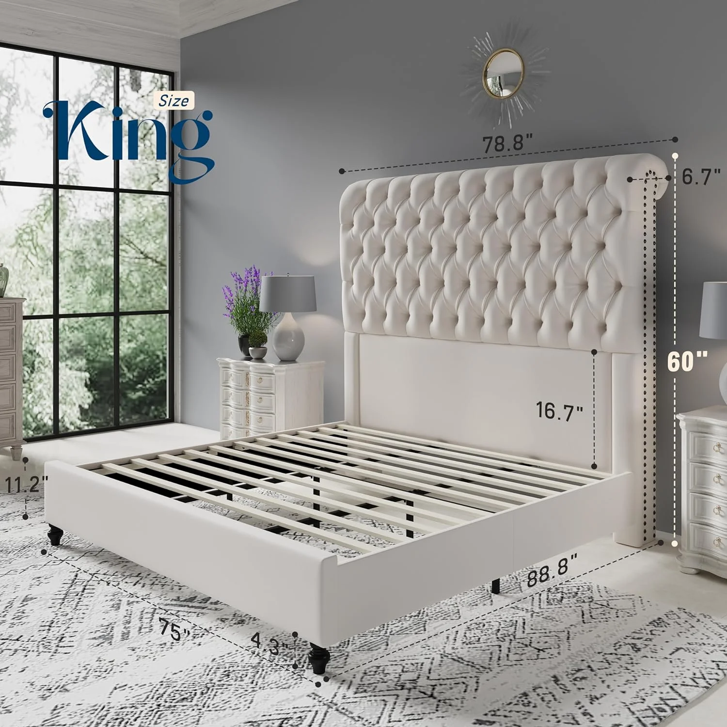 Jocisland King Size Bed Frame with Sleigh Headboard 59.1" Tall Velvet Upholstered Platform Bed, No Box Spring Needed, Cream