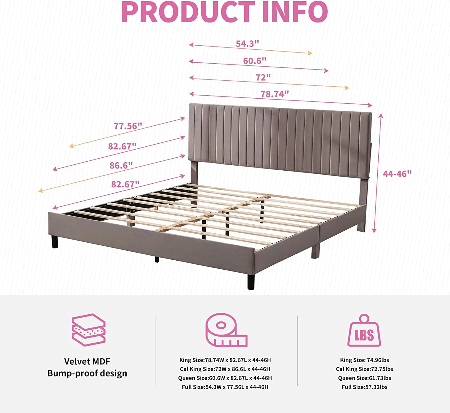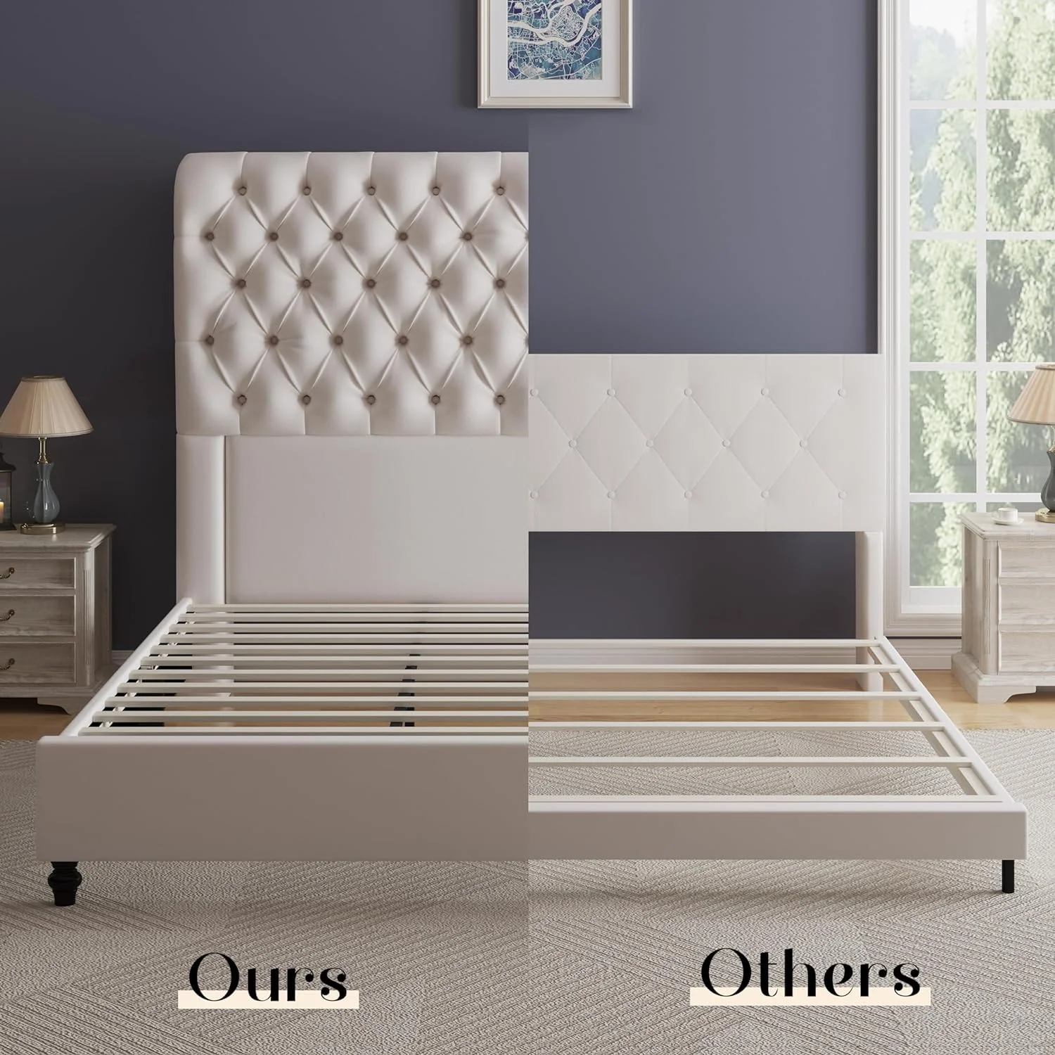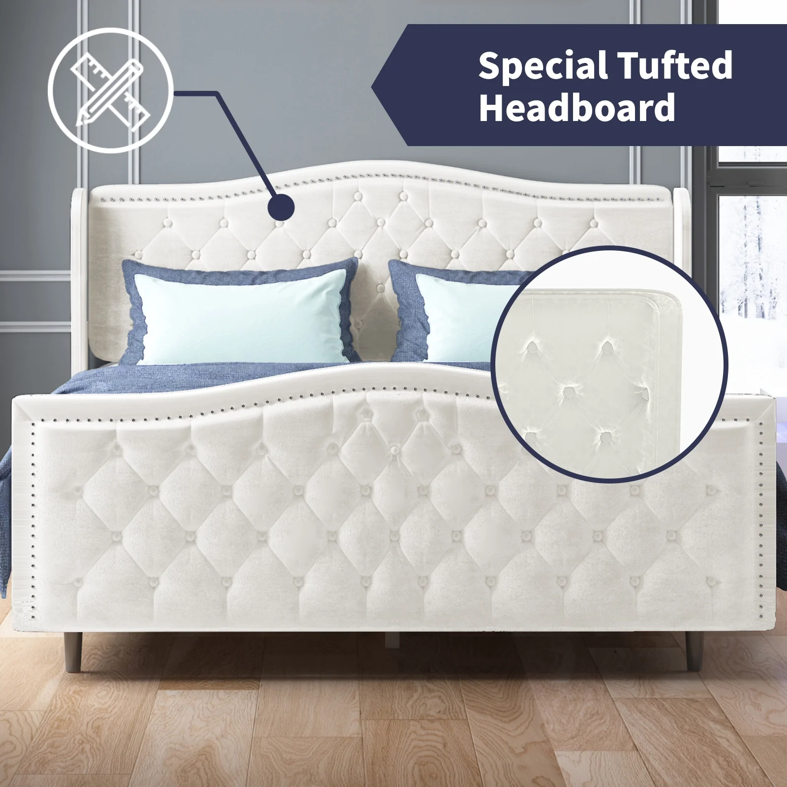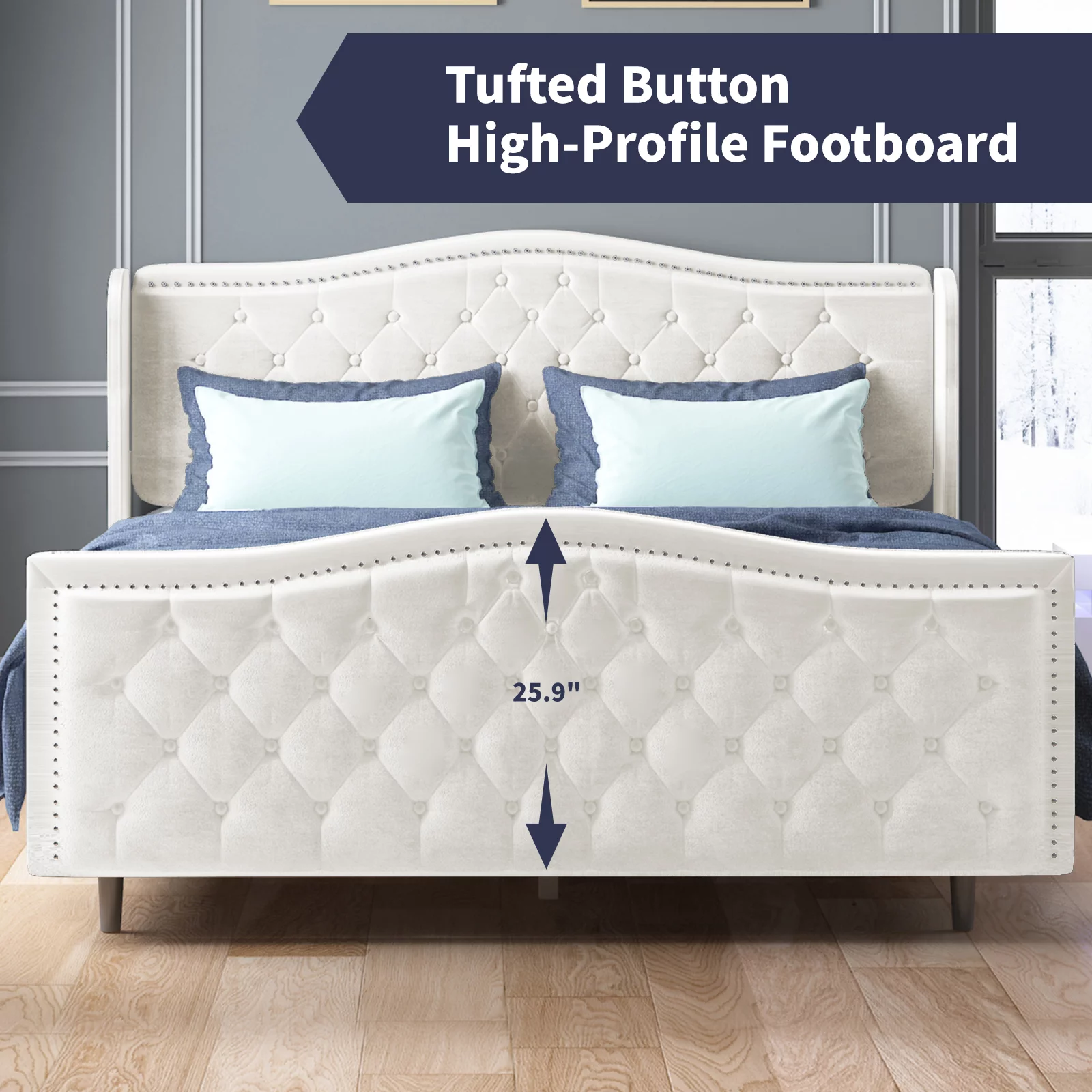 Jocisland King Size Bed Frame with Sleigh Headboard 59.1" Tall Velvet Upholstered Platform Bed, No Box Spring Needed, Cream