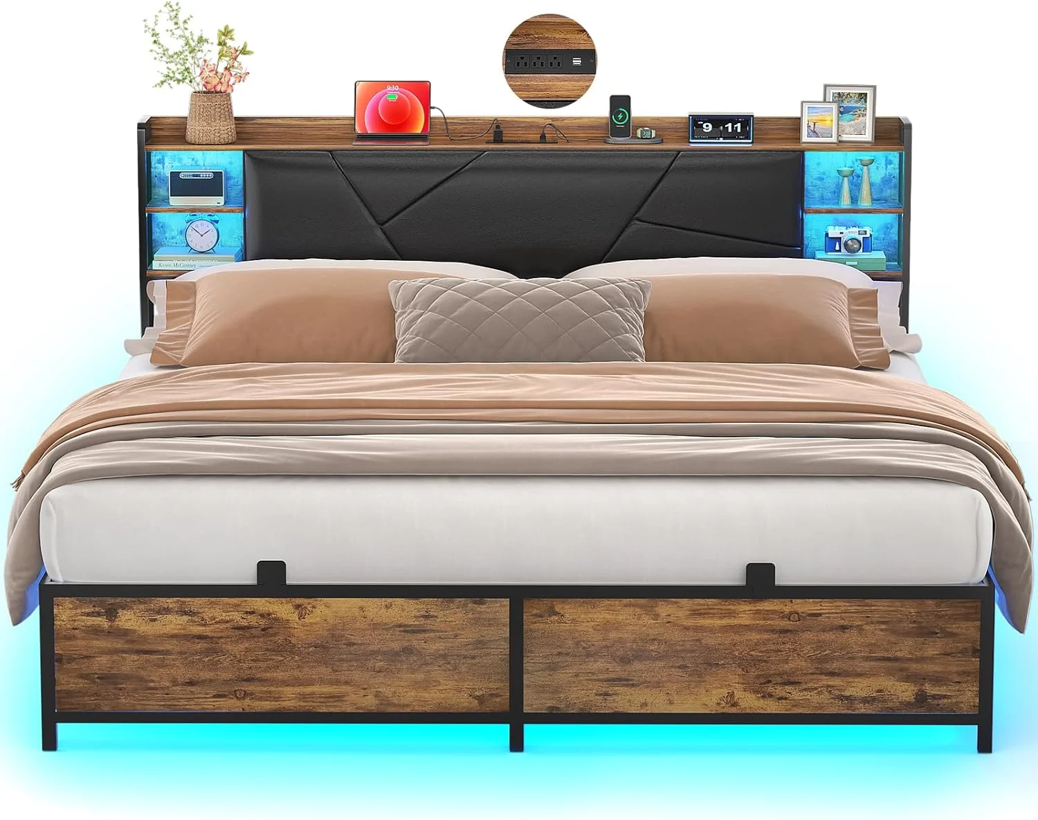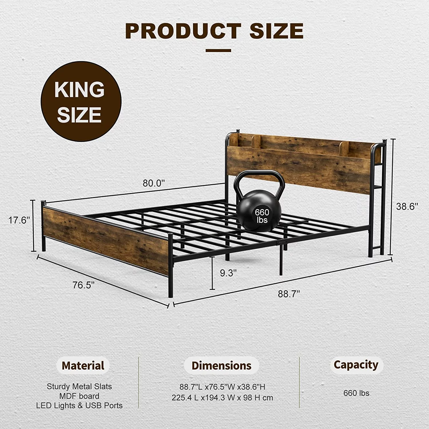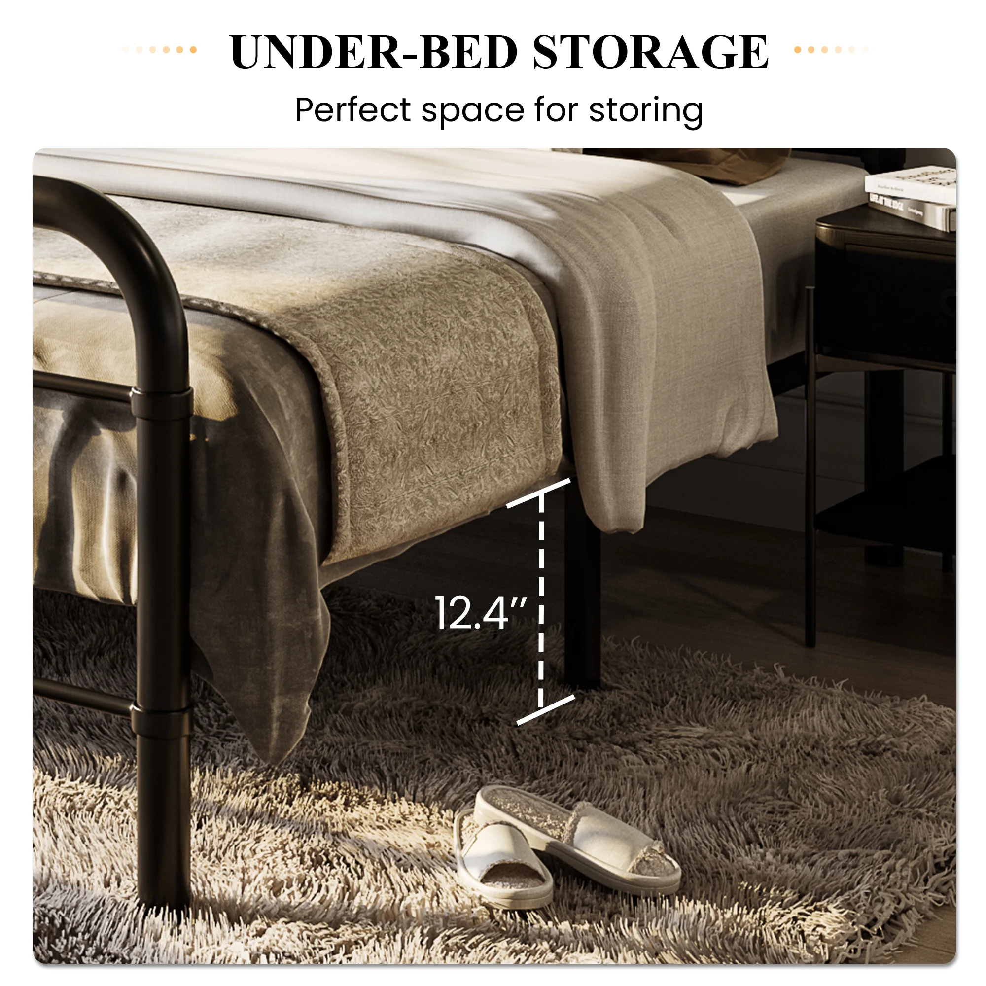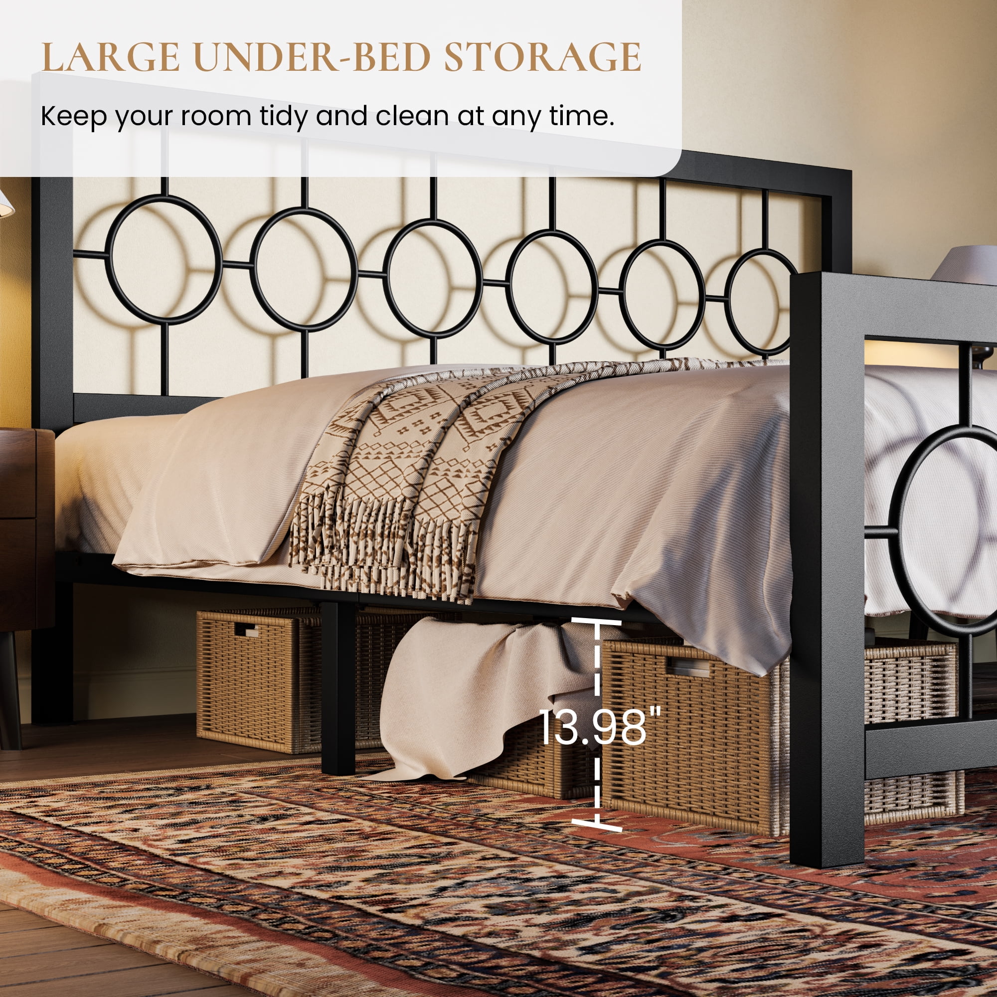 SHA CERLIN King Size Metal Platform Bed Frame with Victorian Vintage Headboard & Under-bed Storage, Black