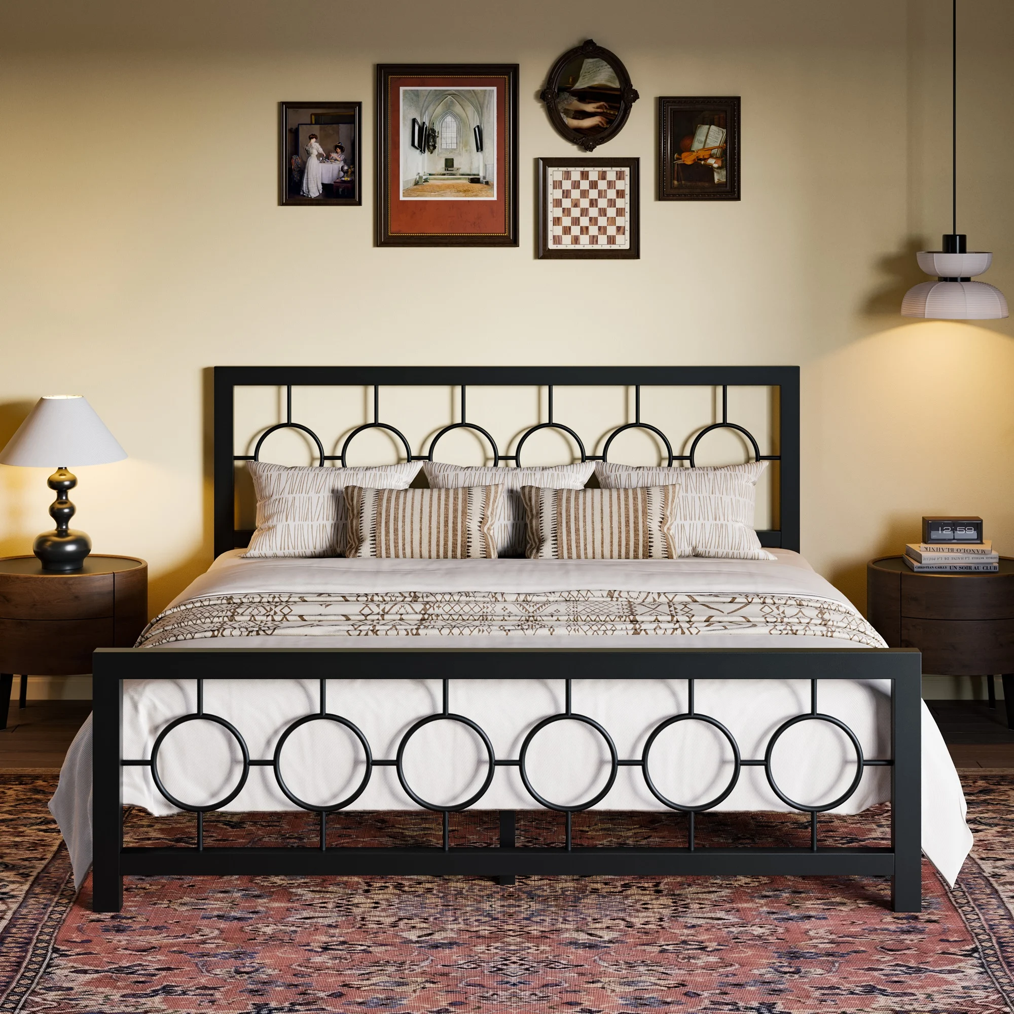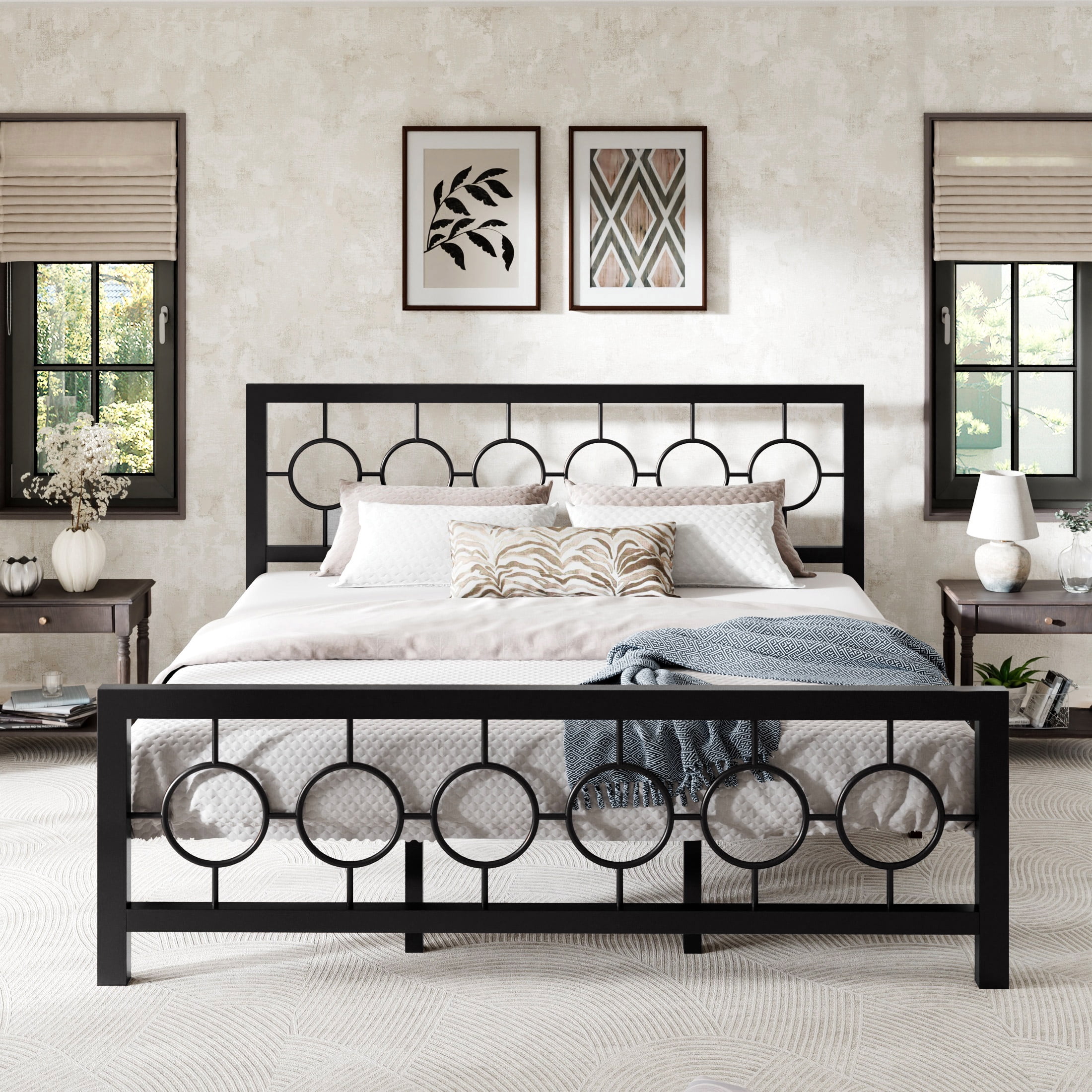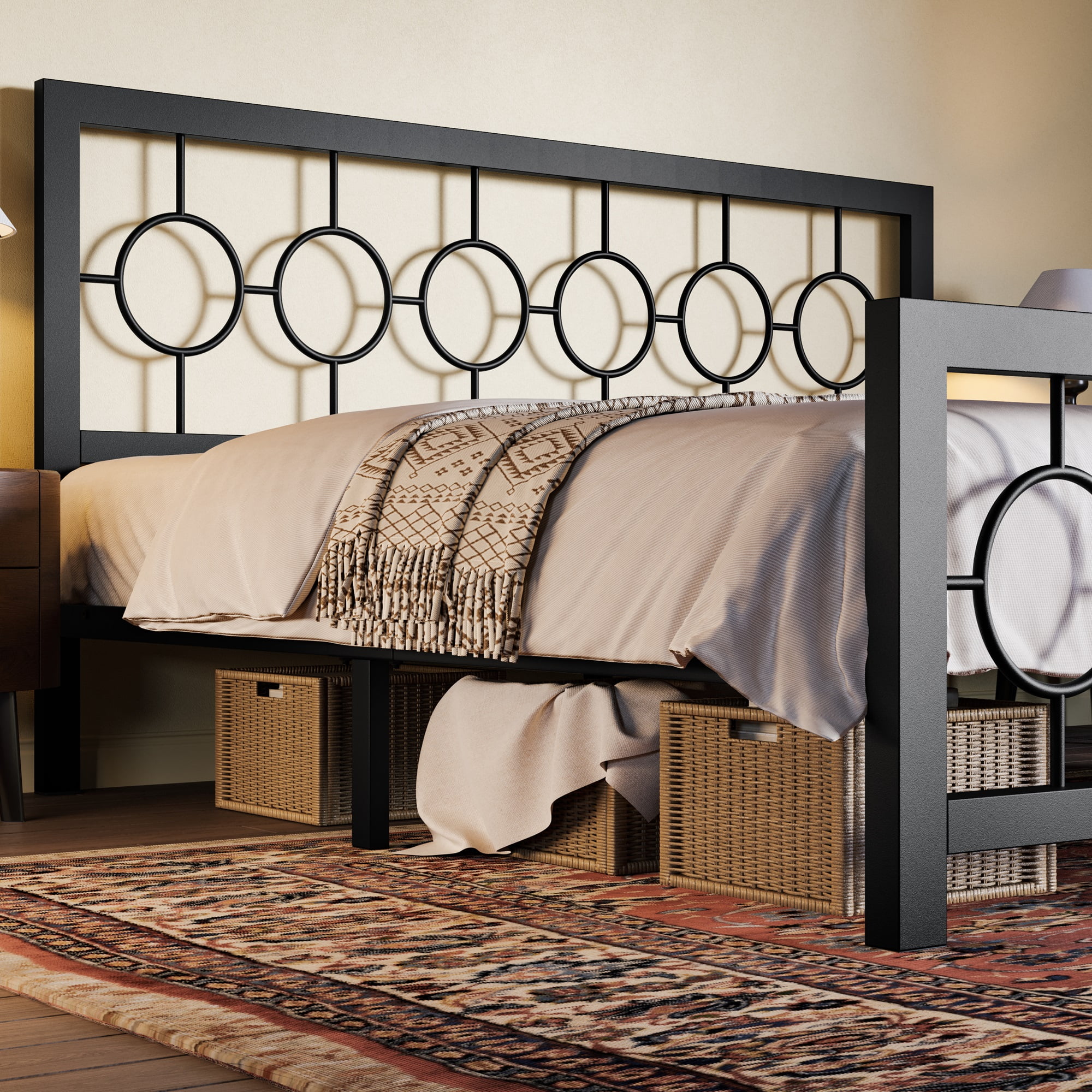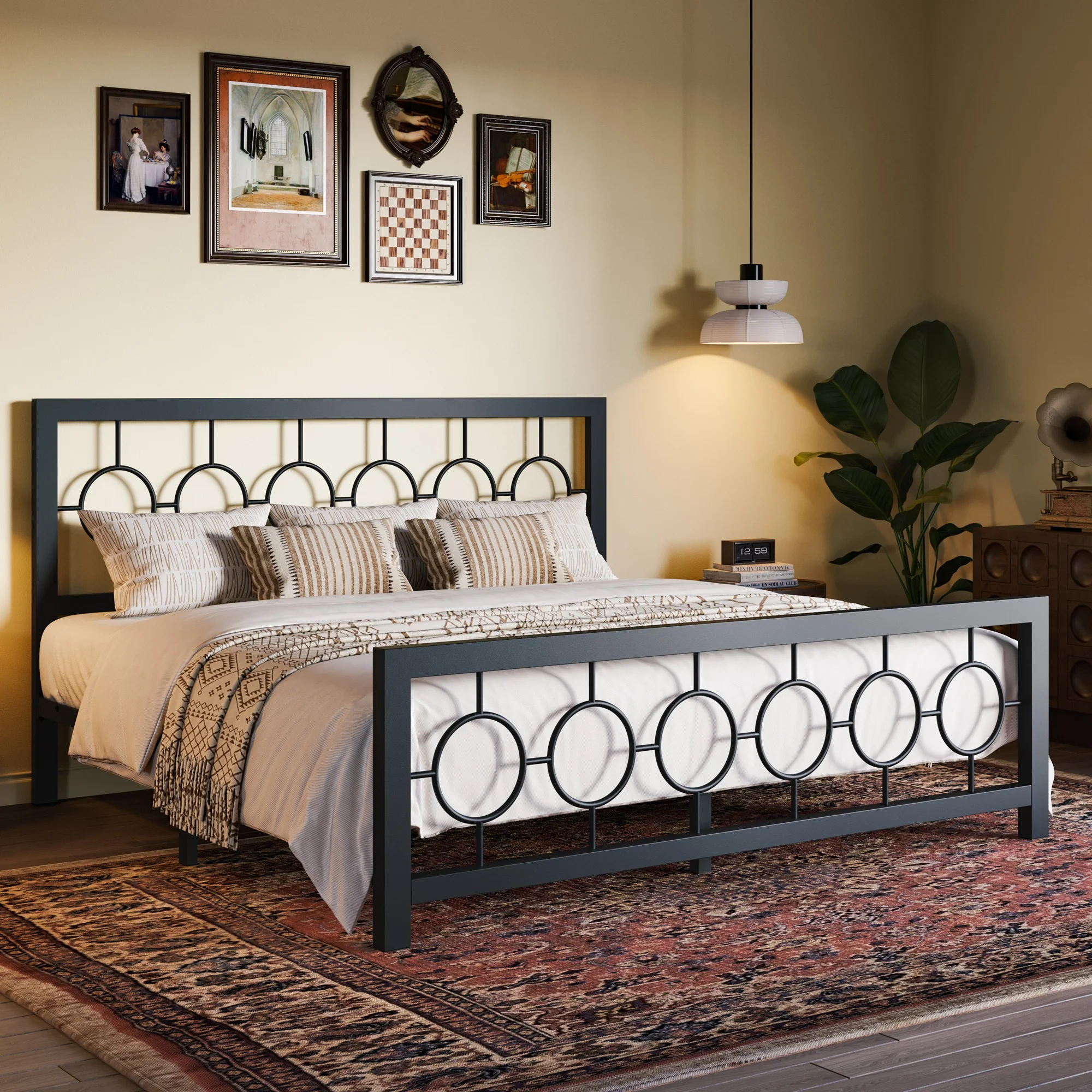 Amolife Black King Size Metal Platform Bed Frame with Circular Vintage Headboard & Footboard
