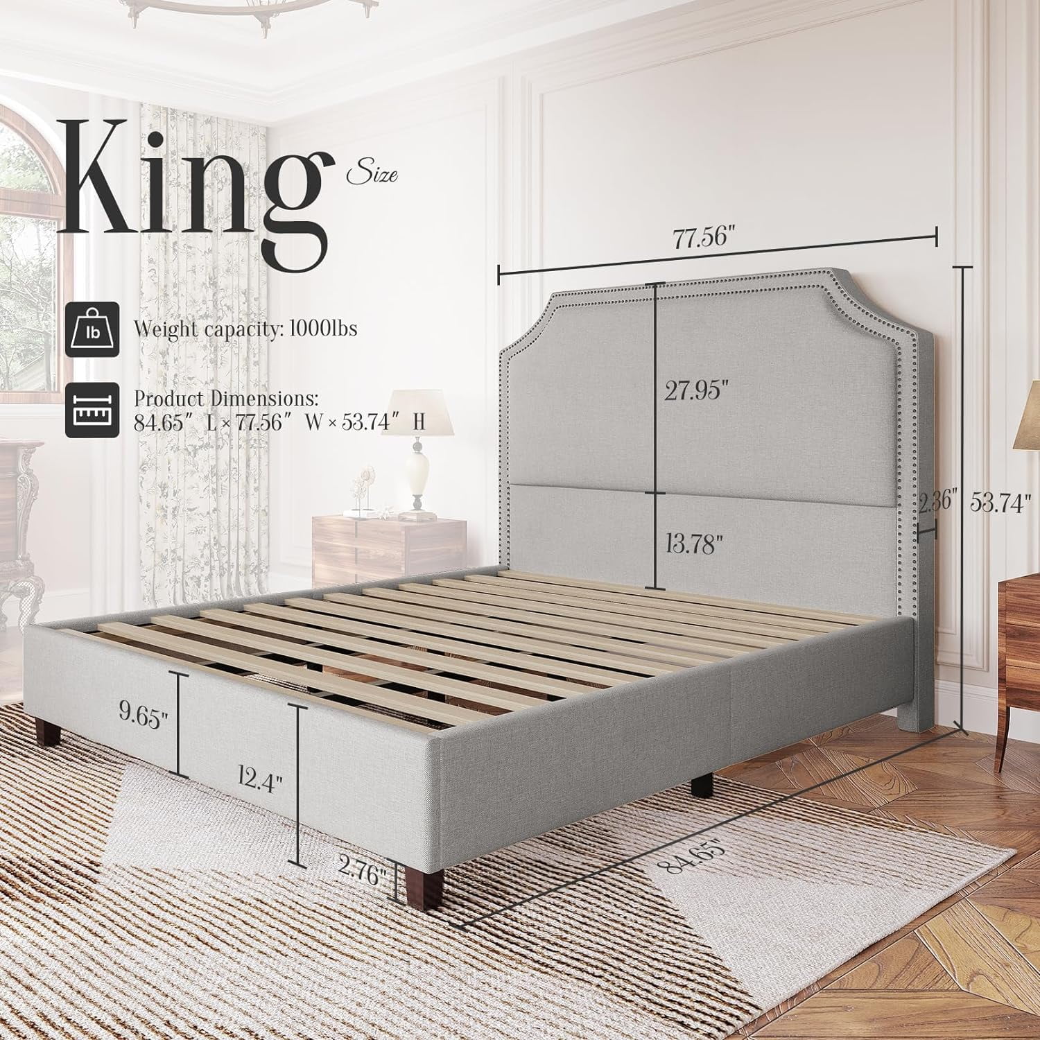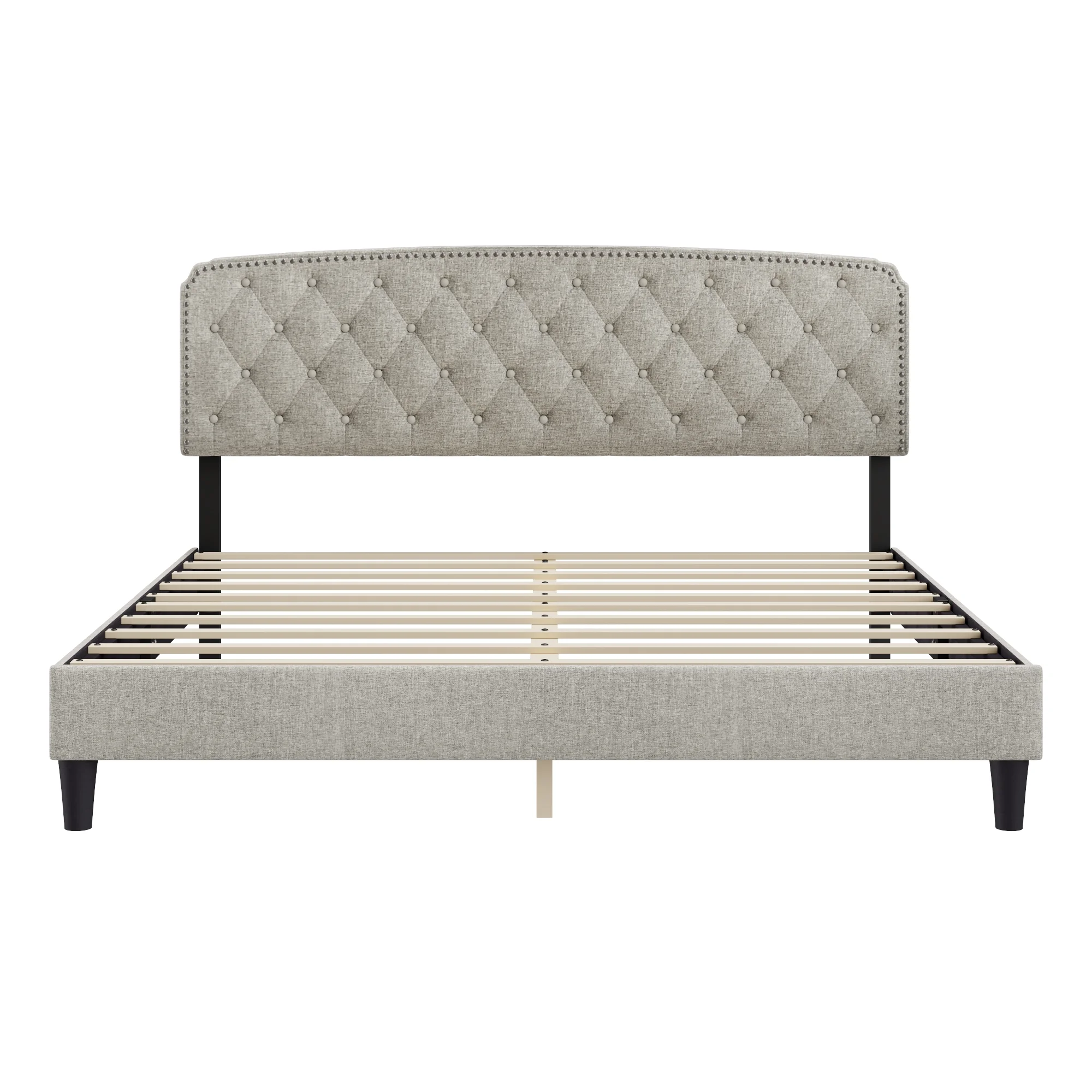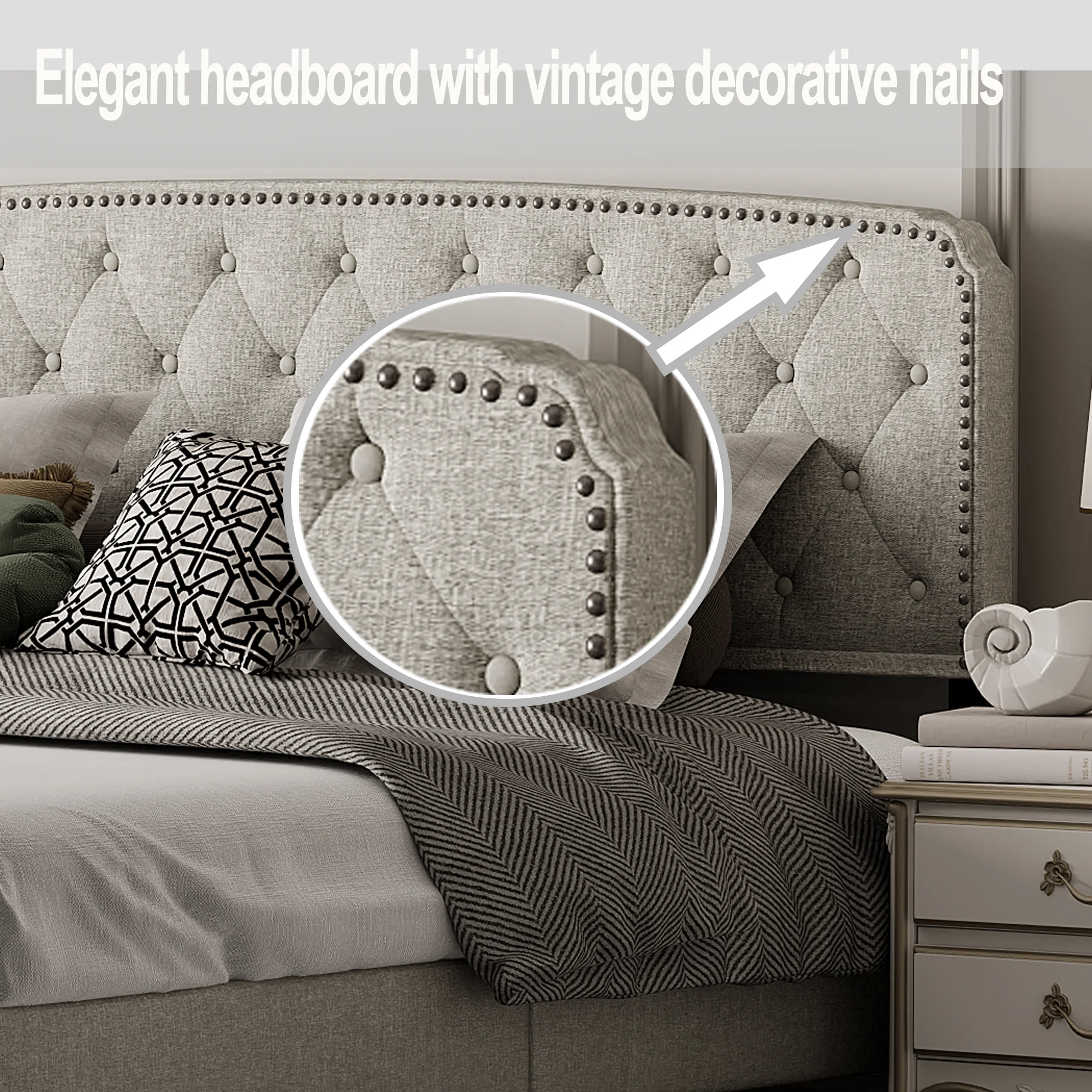Jocisland King Size Bed Frame Upholstered Platform Bed with Headboard, Nailhead Trim, No Box Spring Required,Grey