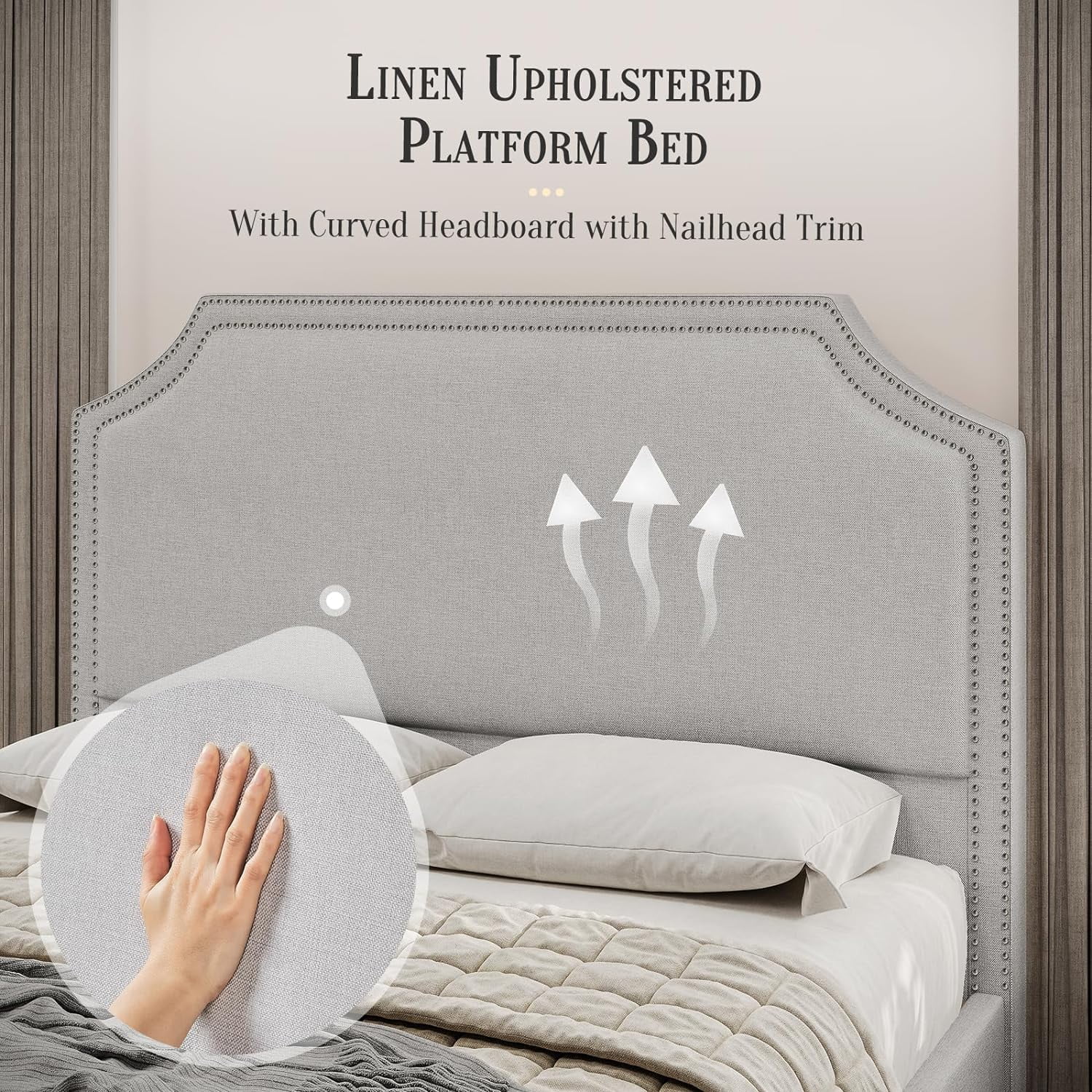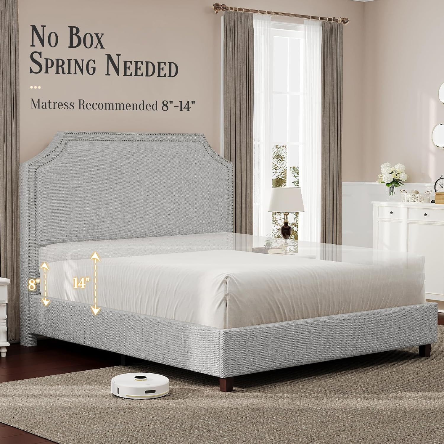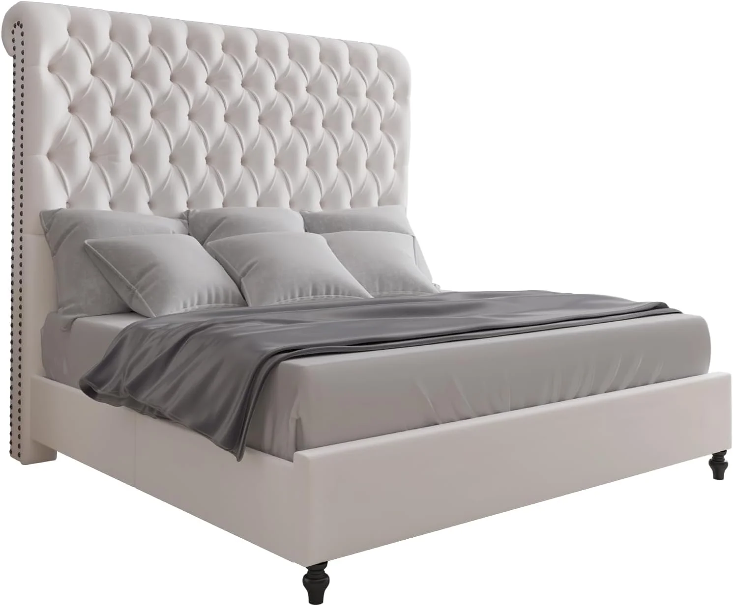 Jocisland King Size Bed Frame Upholstered Platform Bed with Headboard, Nailhead Trim, No Box Spring Required,Grey