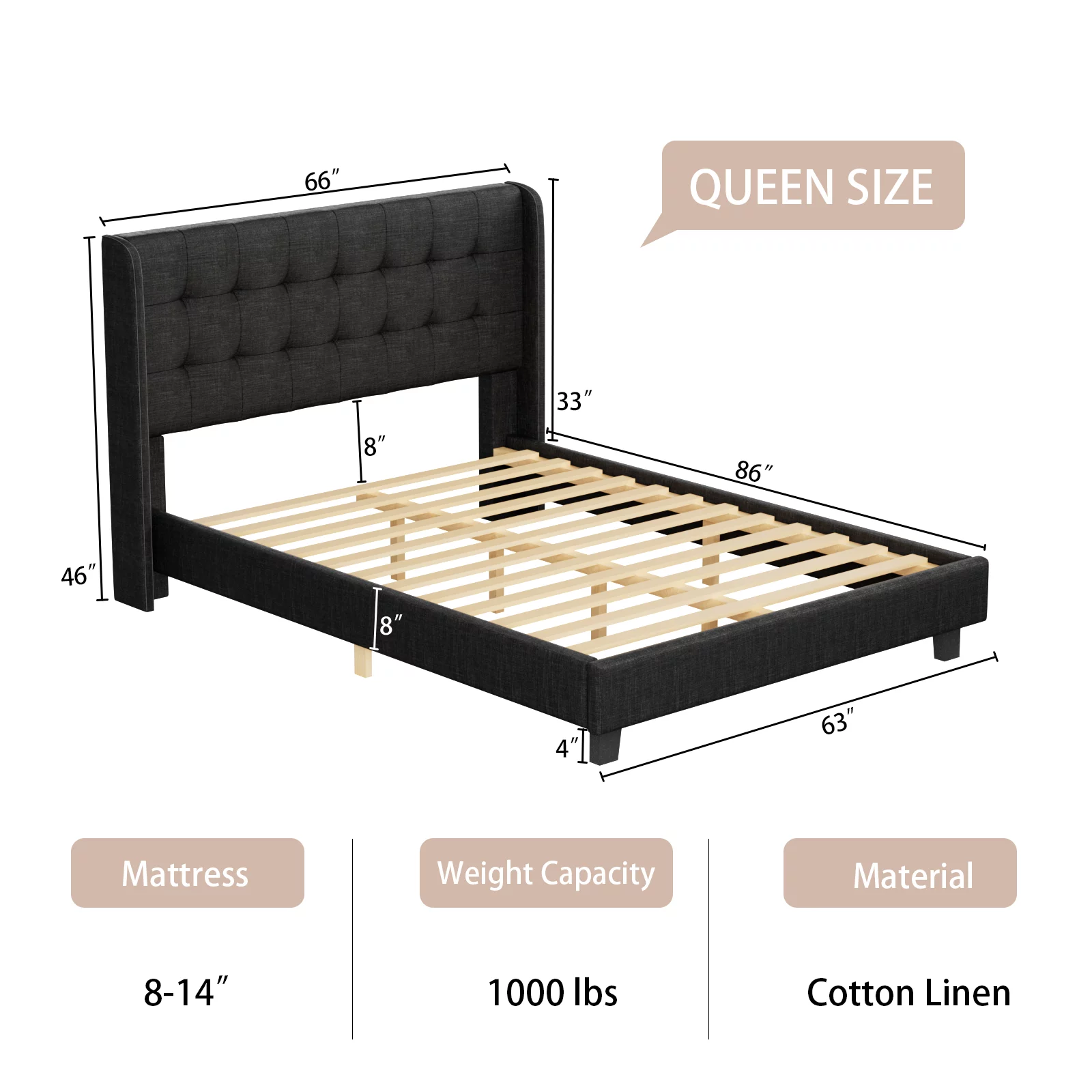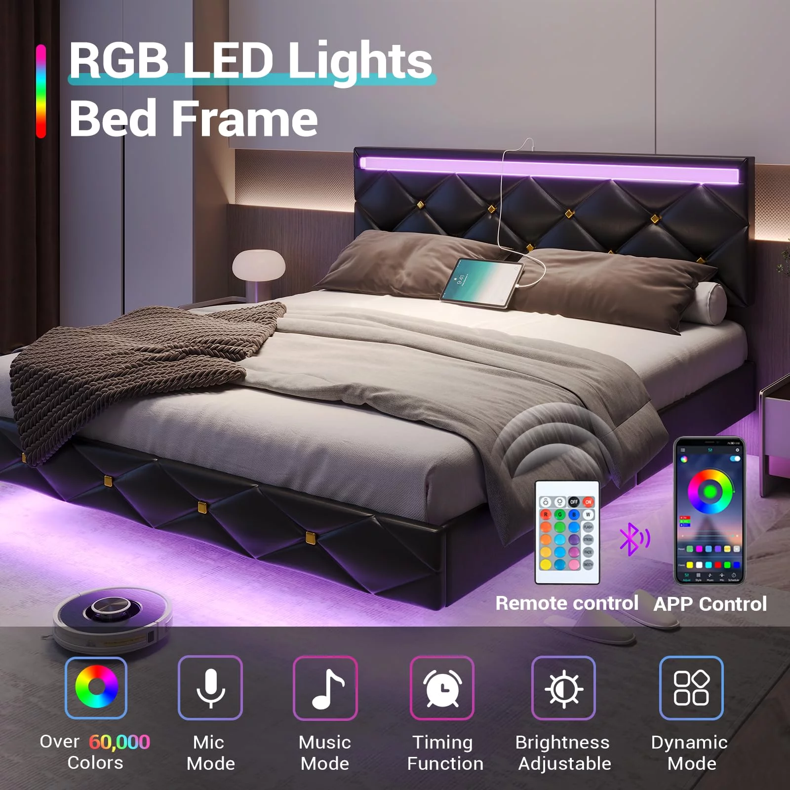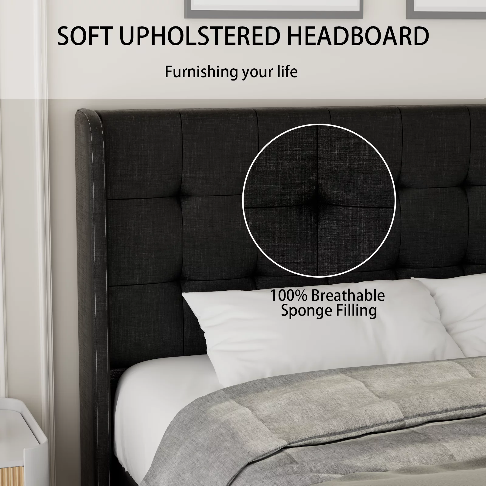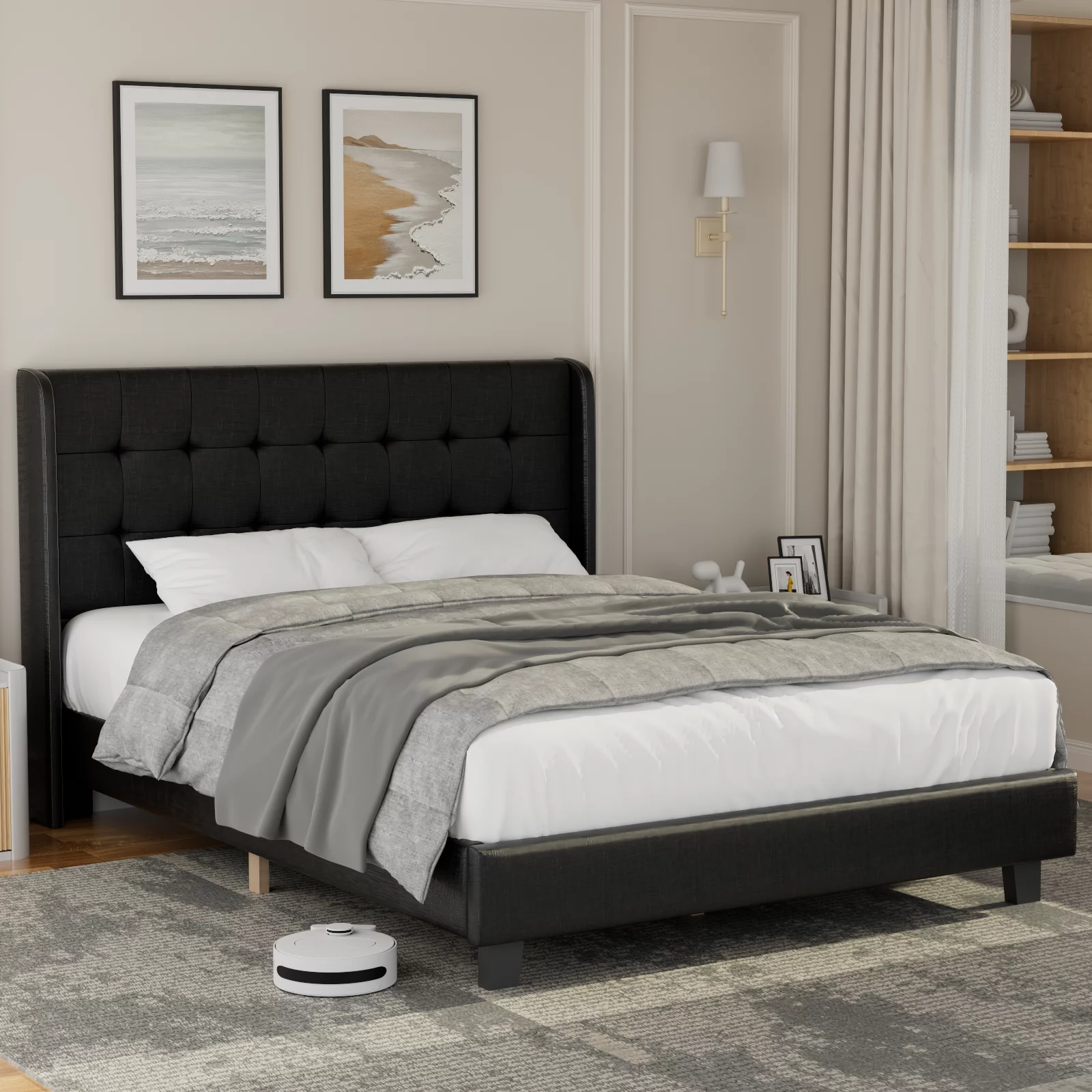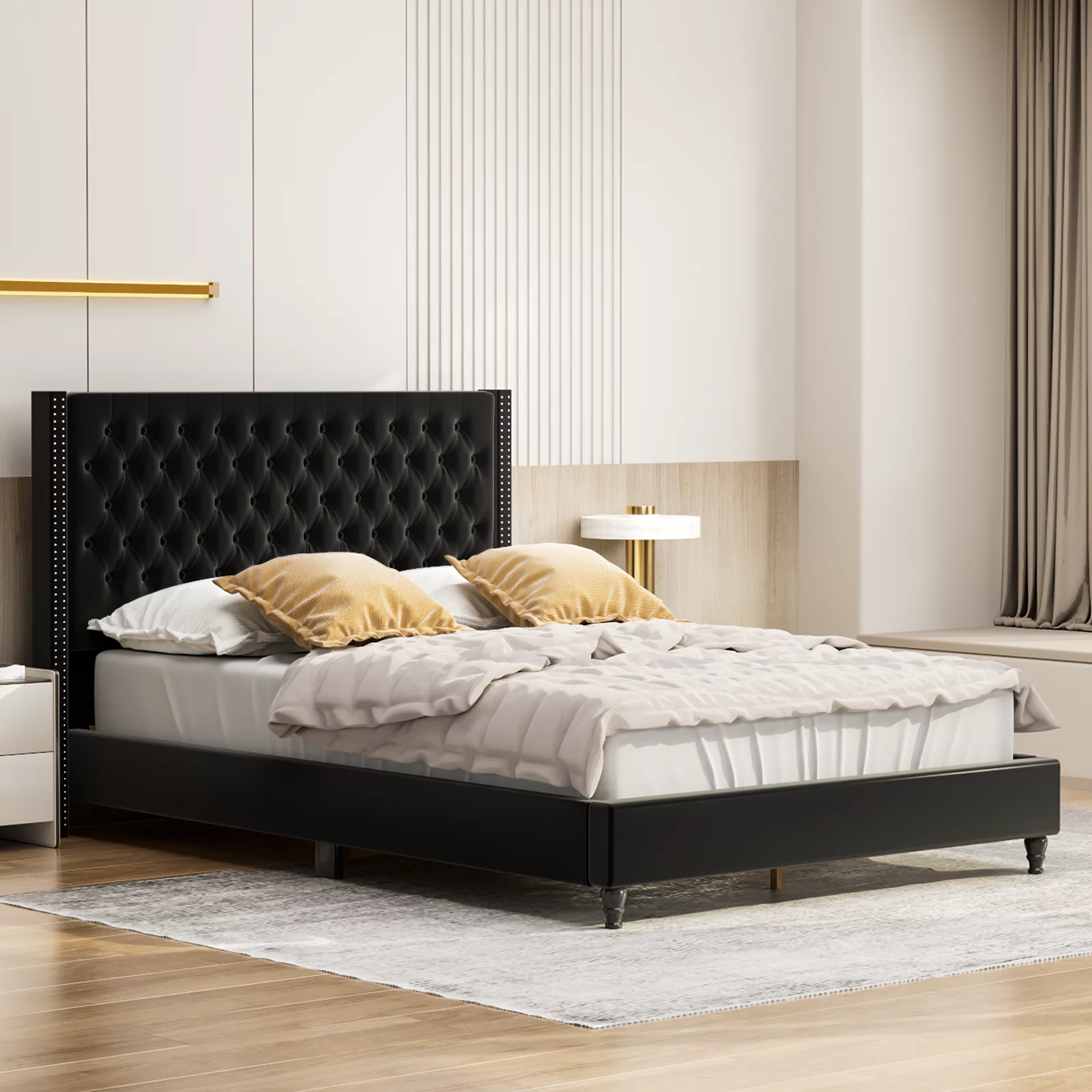 Upholstered Tufted Bed, Platform Bed Frame with Diamond Low Profile Platform Beds Strong Wooden Slats, Queen Size Black