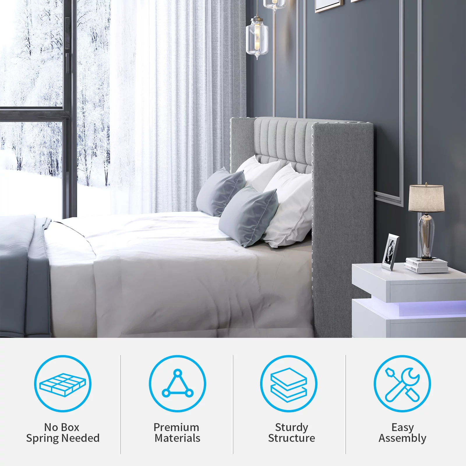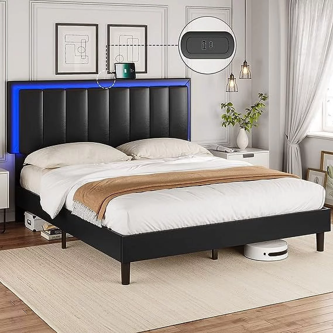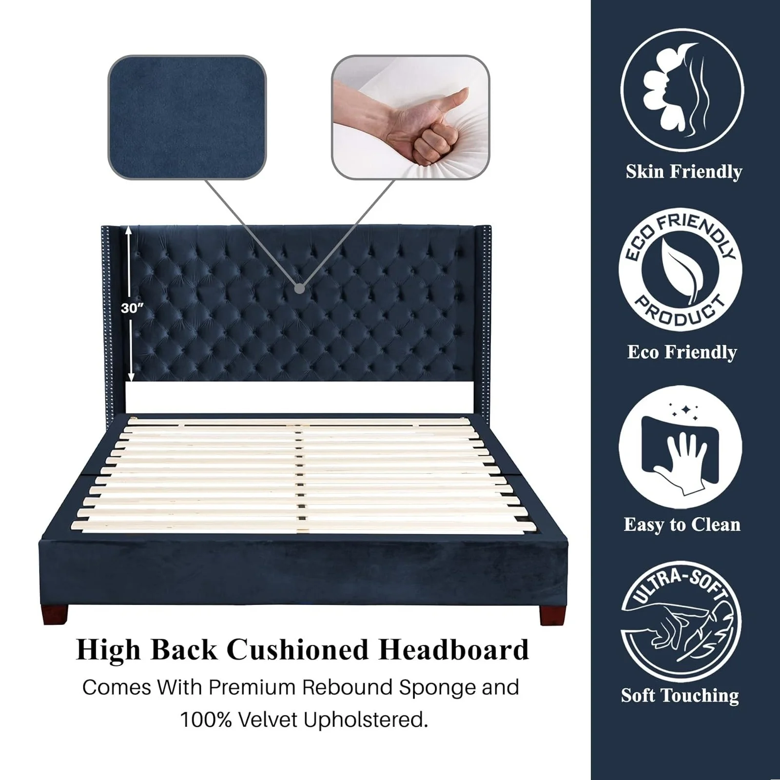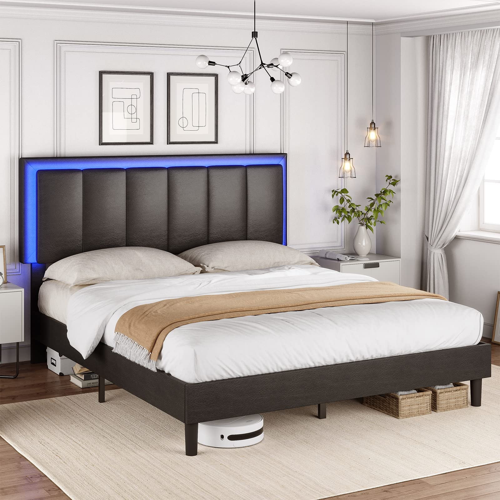 Upholstered Tufted Bed, Platform Bed Frame with Diamond Low Profile Platform Beds Strong Wooden Slats, Queen Size Black