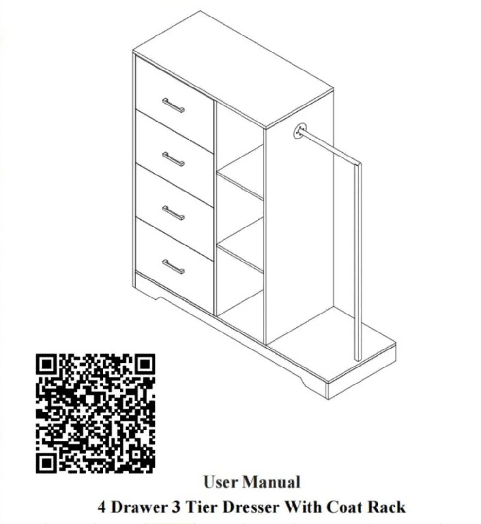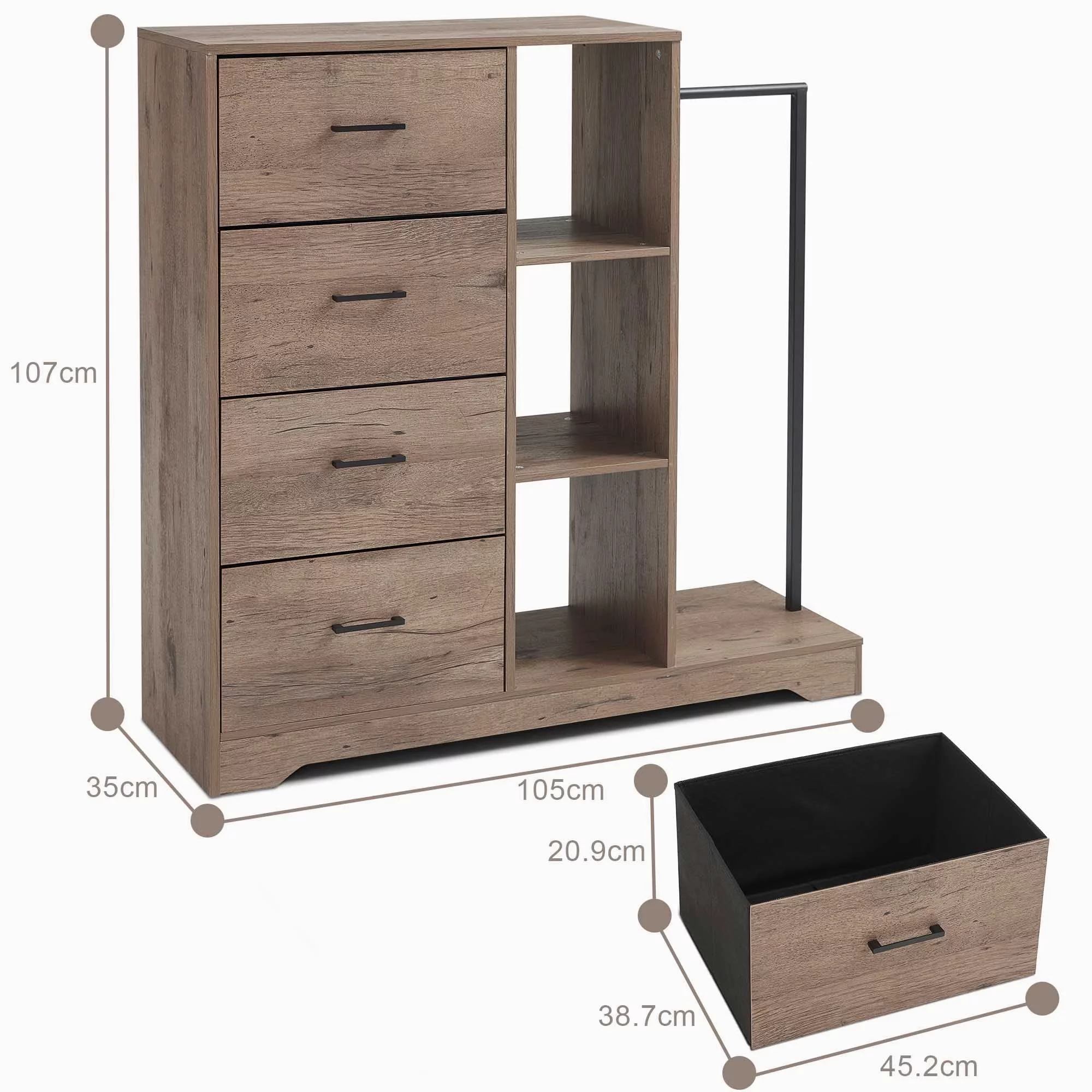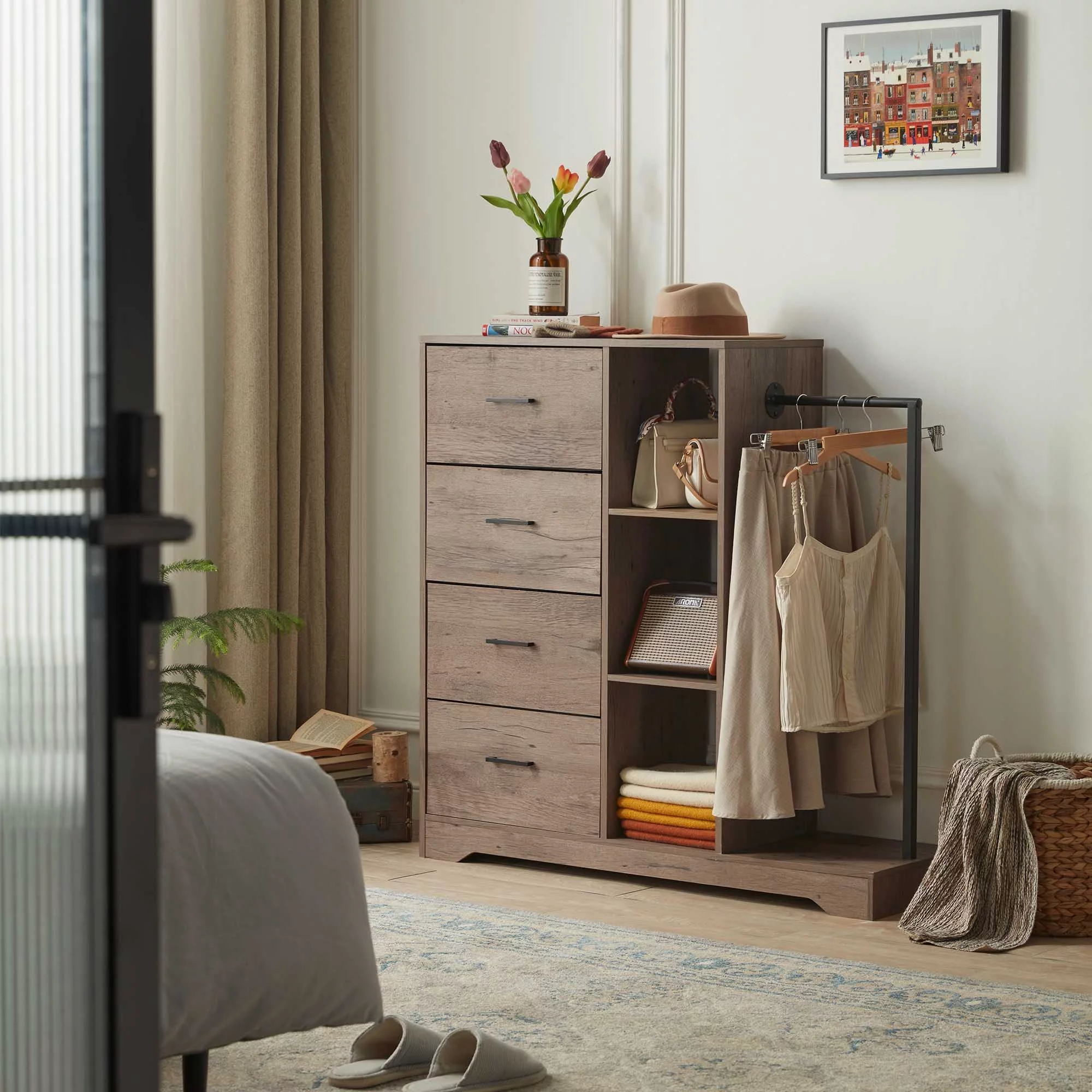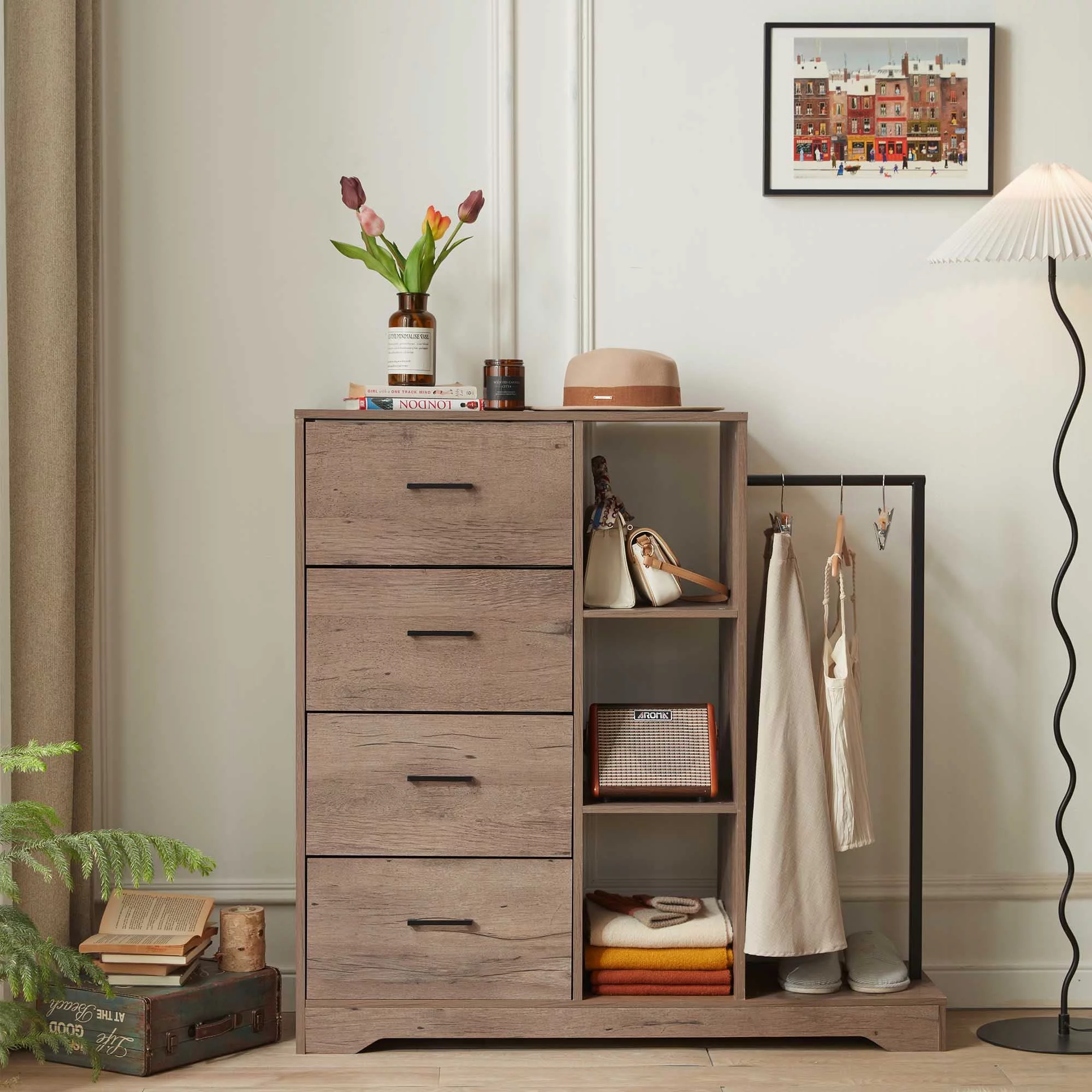 FRAPOW 4 Drawers Dresser, 3 Side Shelfs and Metal Clothes Rack, Wardrobe Closet Organizer System(Brown)