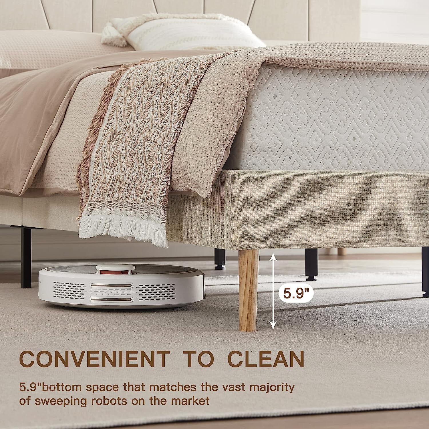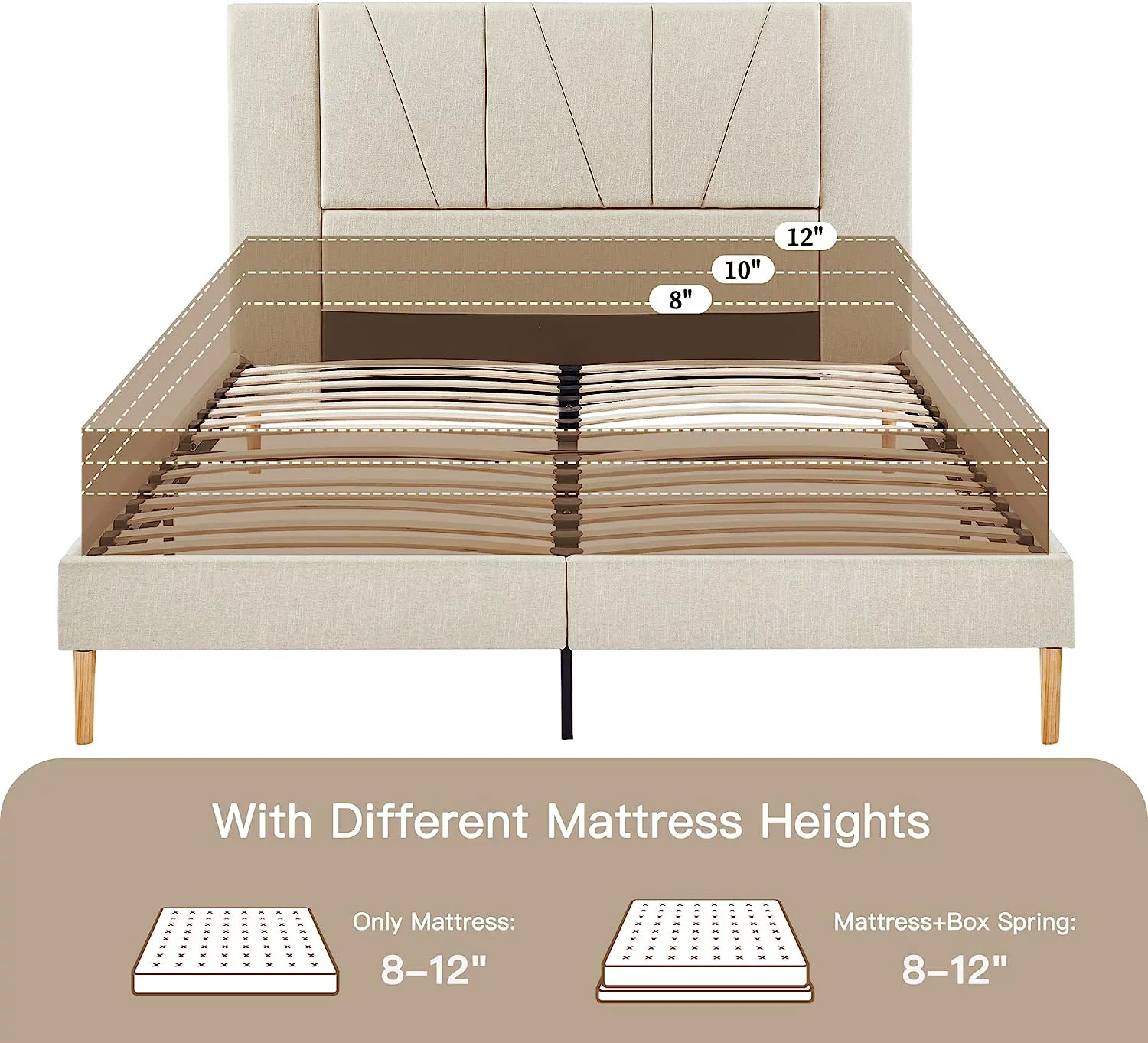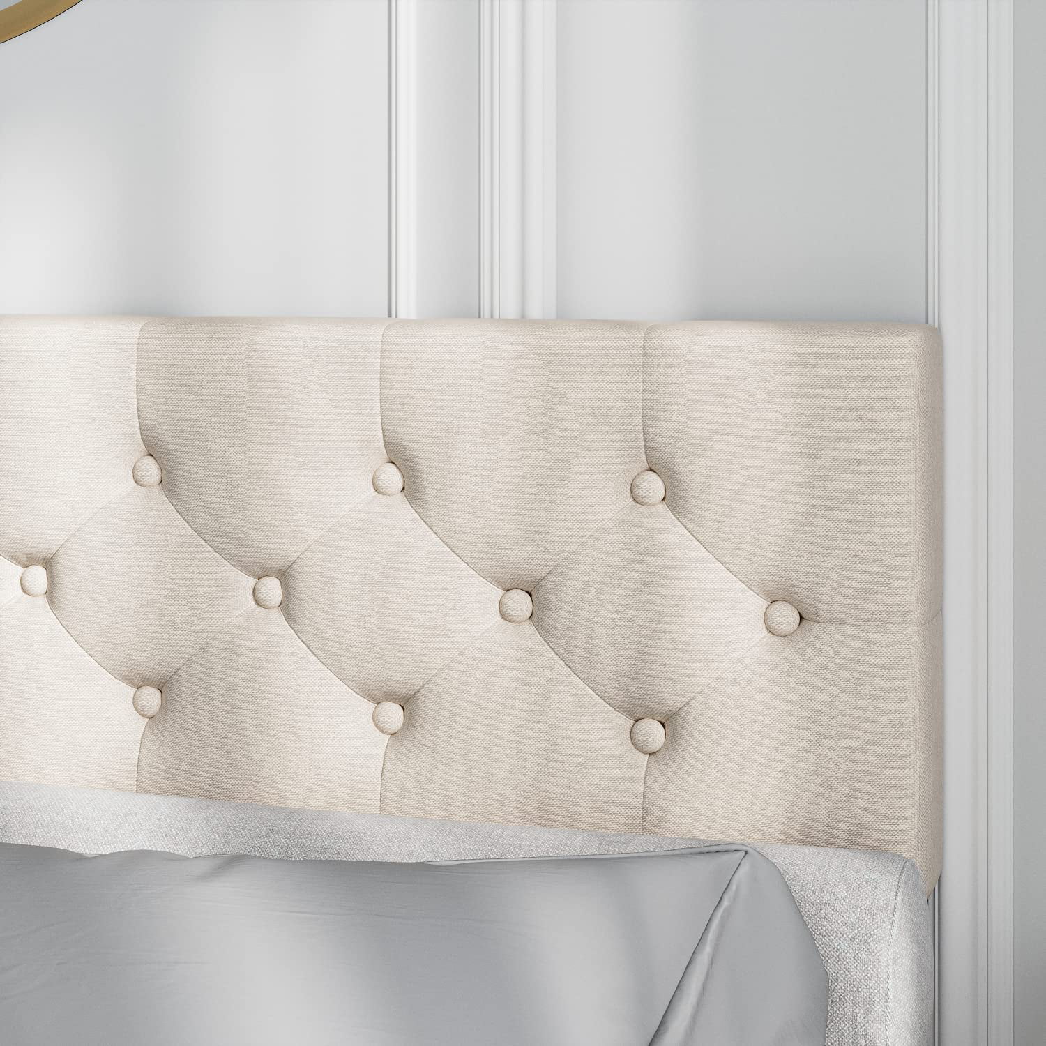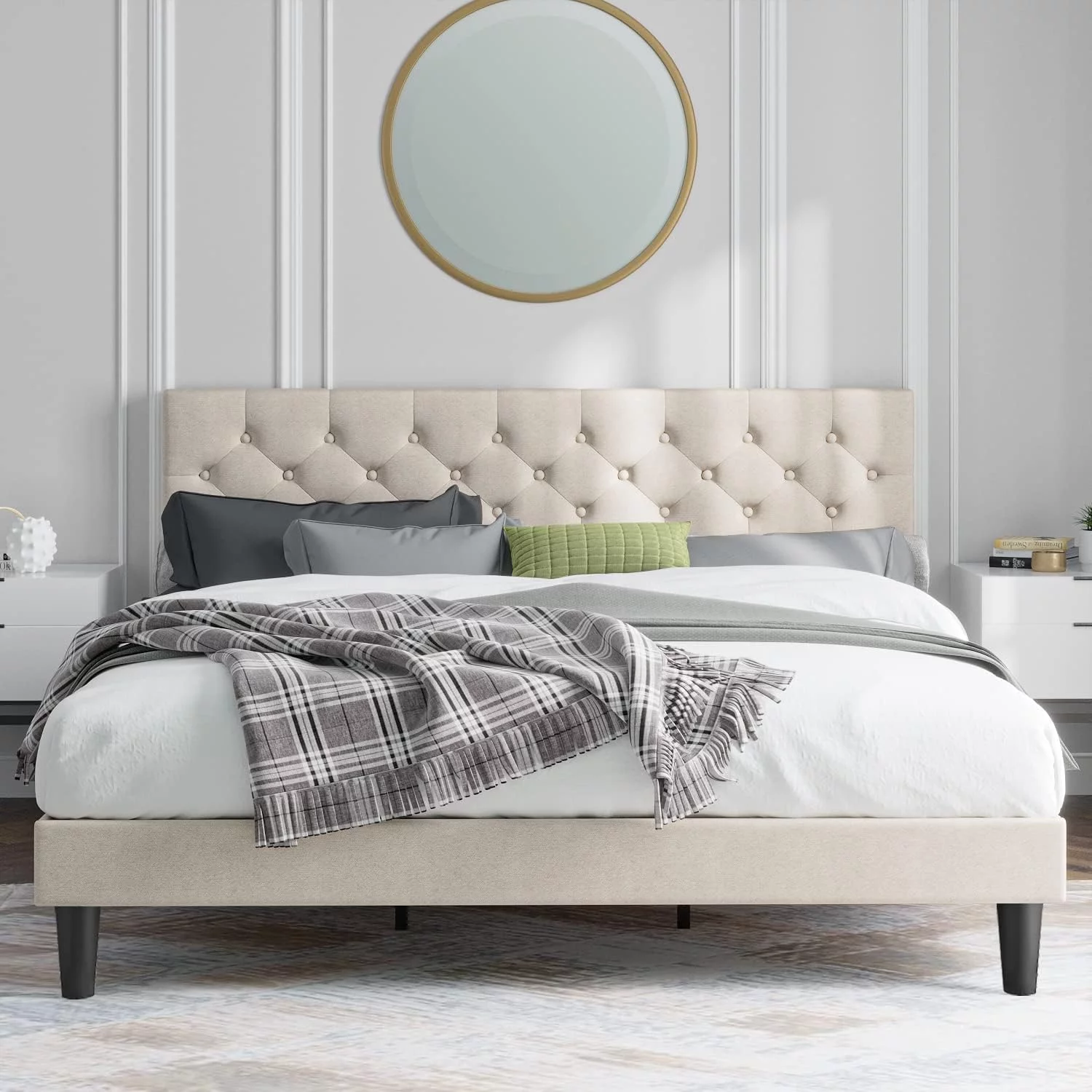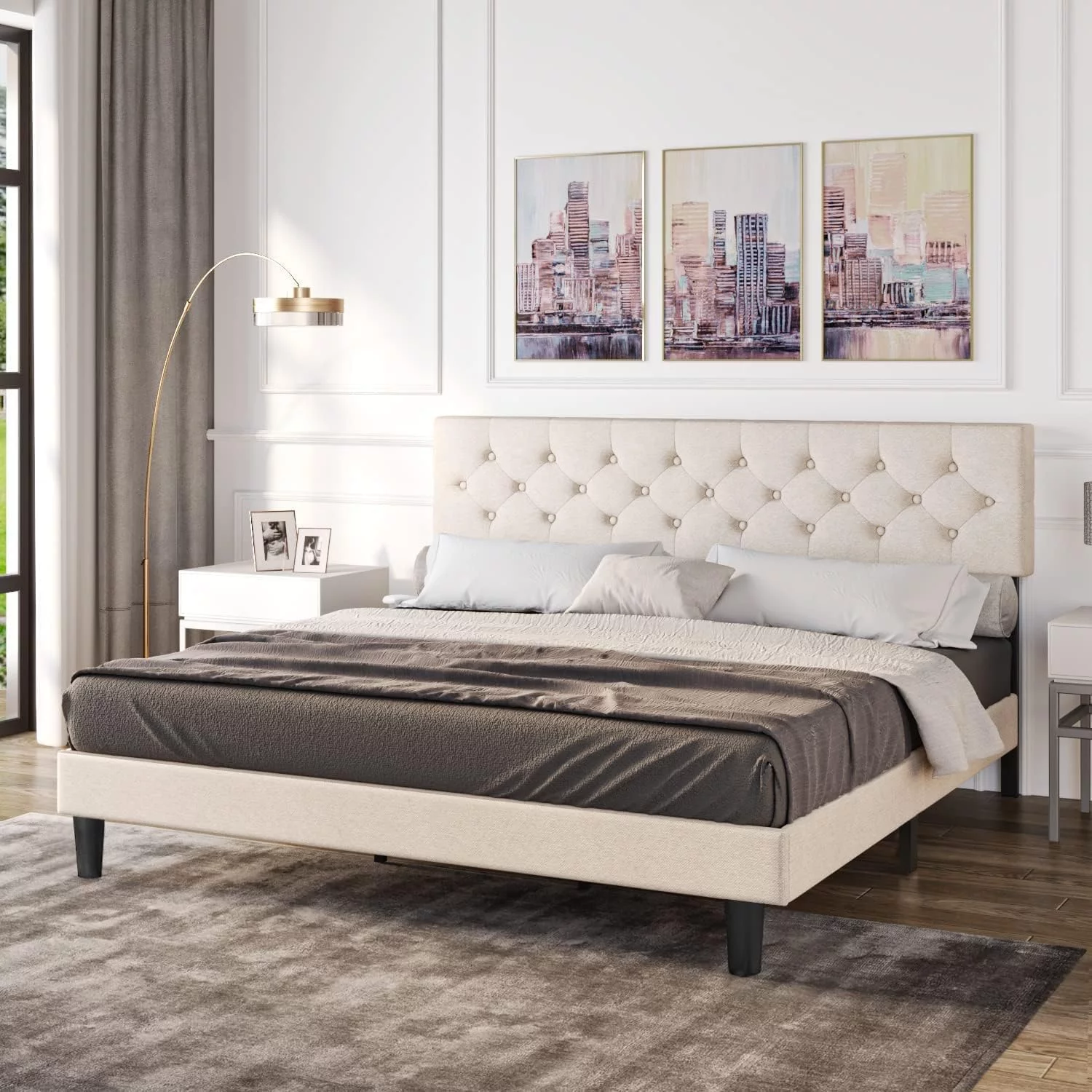 King Size Upholstered Platform Bed Frame with Headboard, Linen Fabric Button Tufted Headboard, Beige