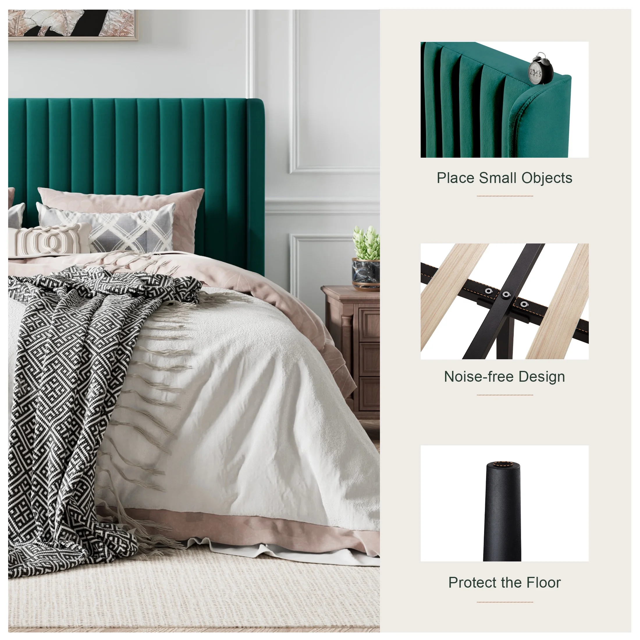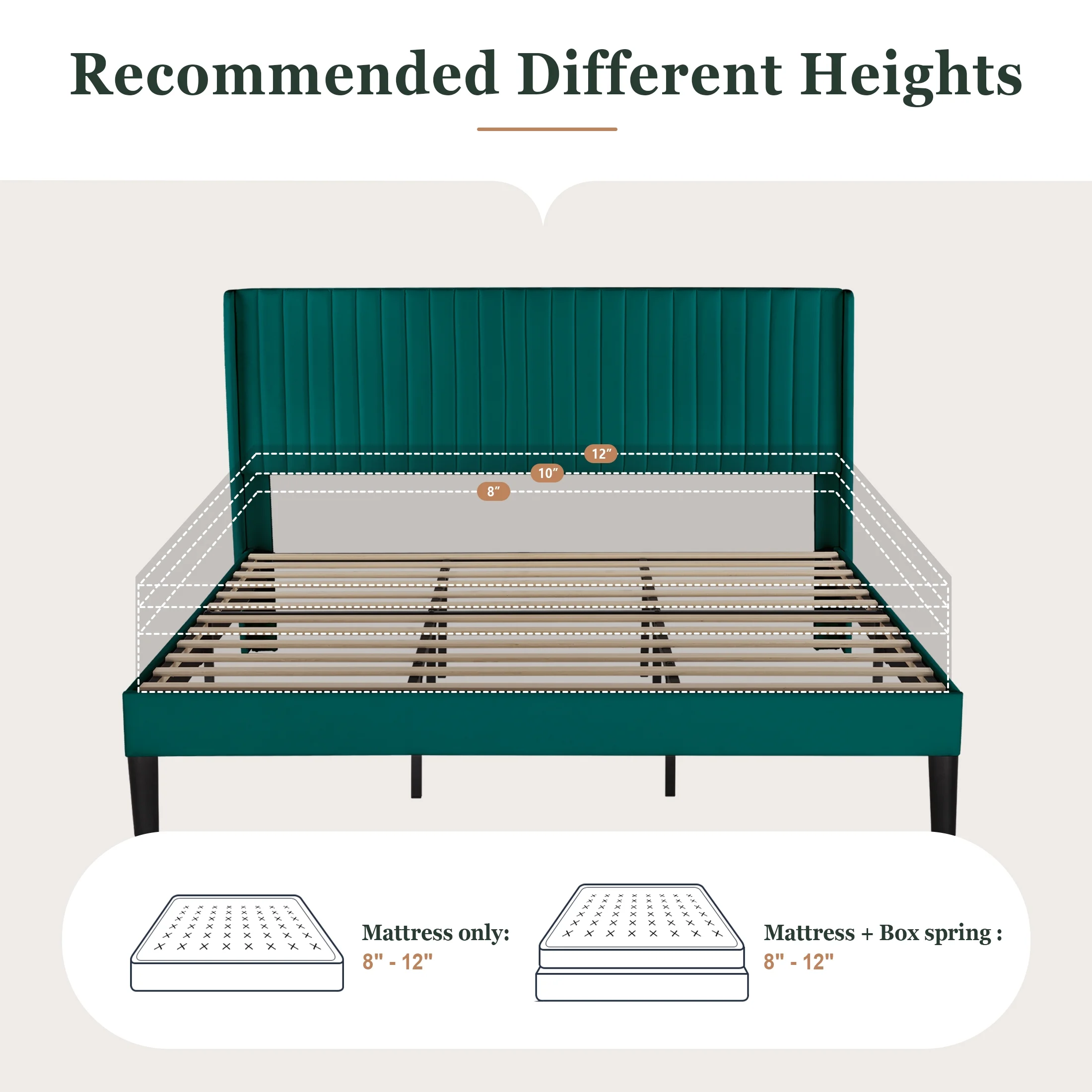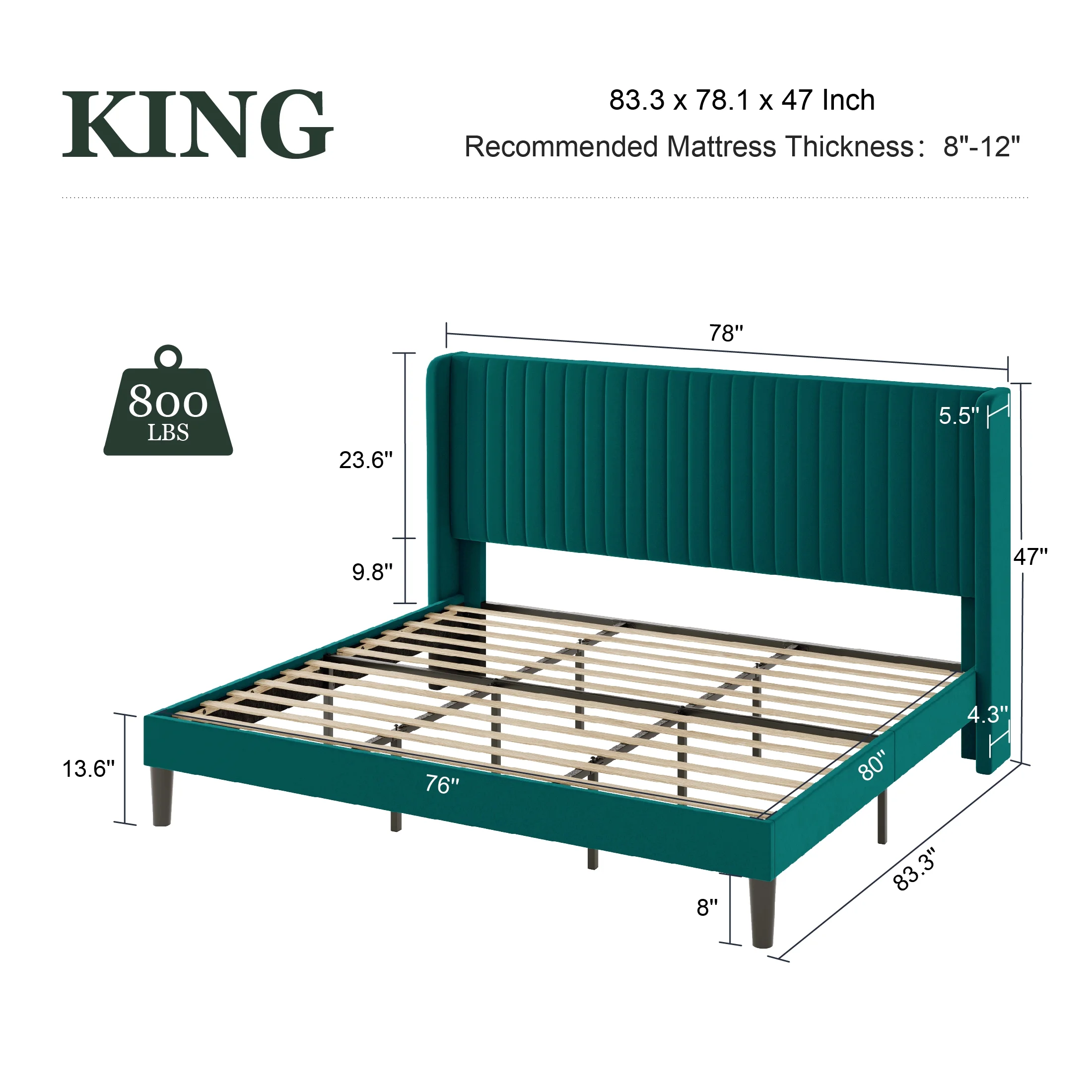 Amolife King Size Velvet Vertical Stripe Upholstered Bed Frame with Wingback Headboard, Lake Blue