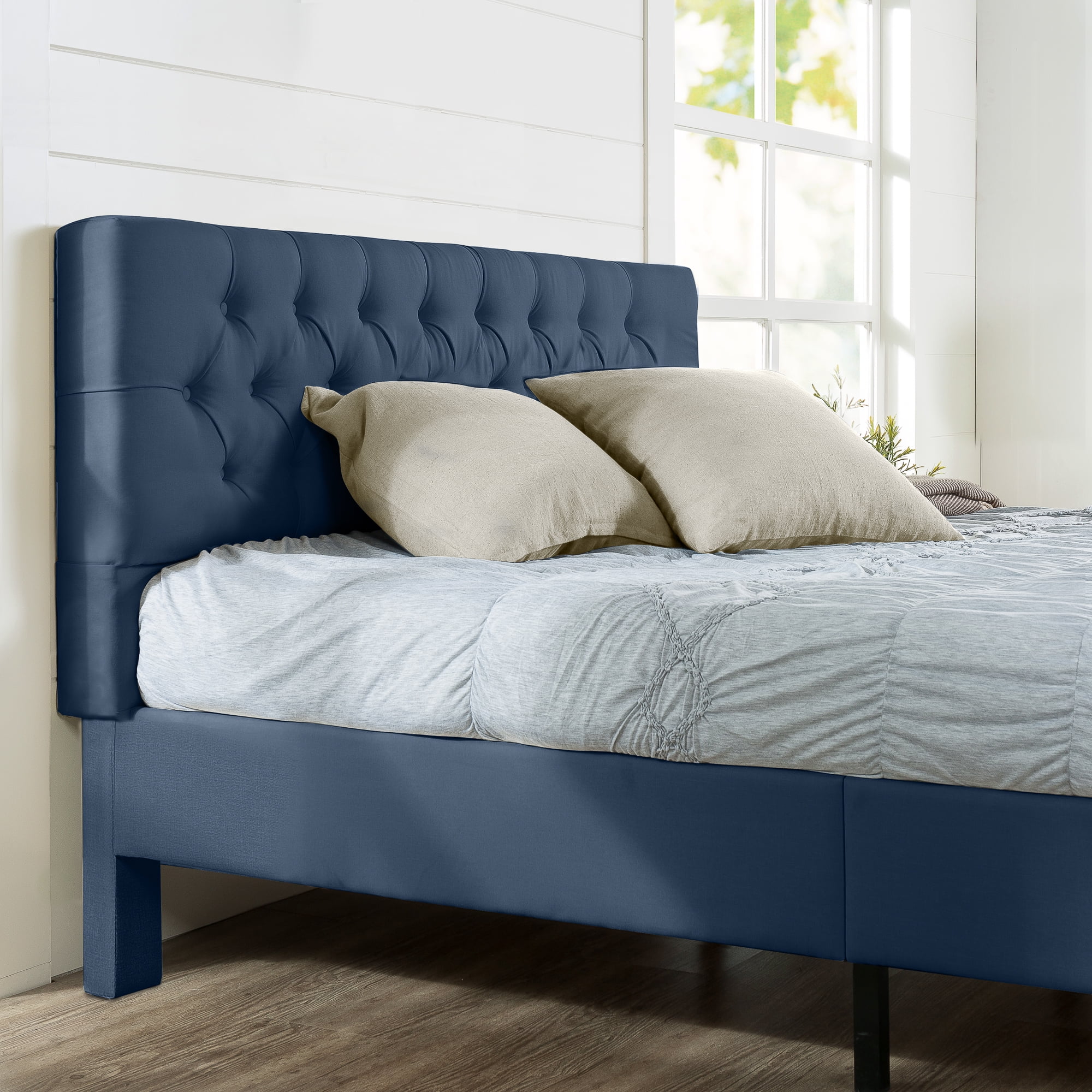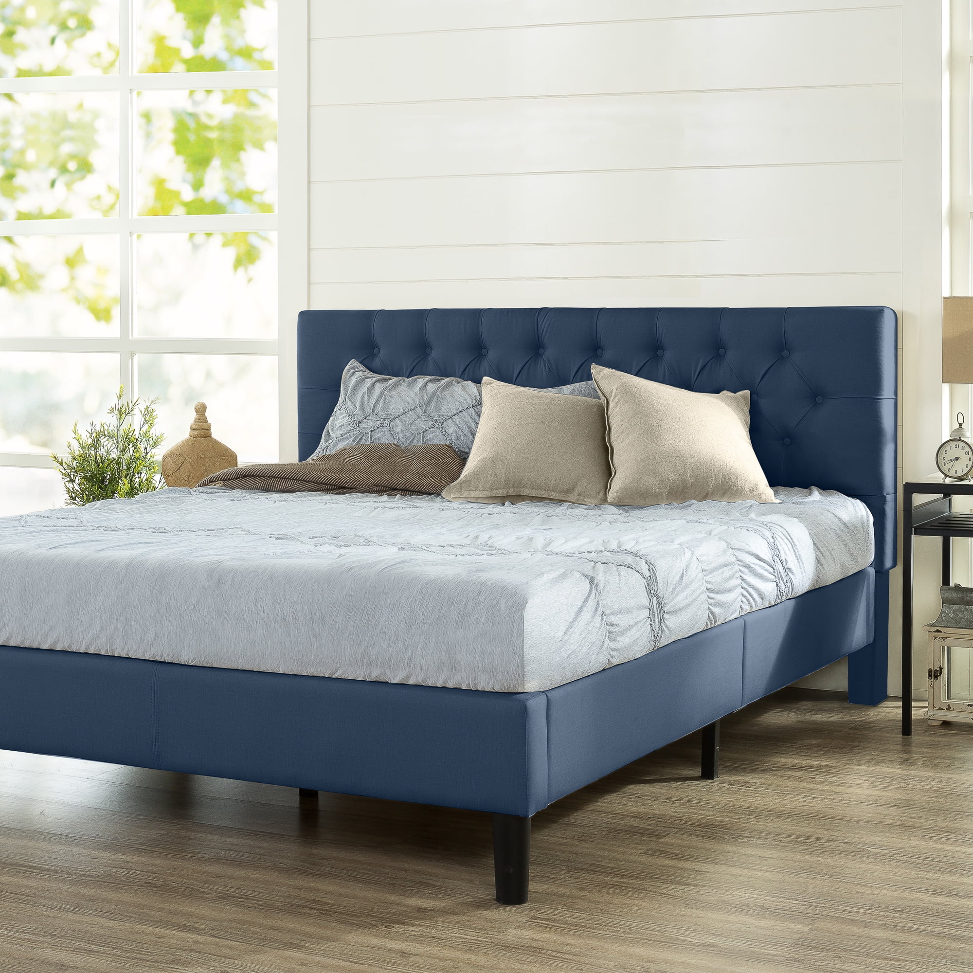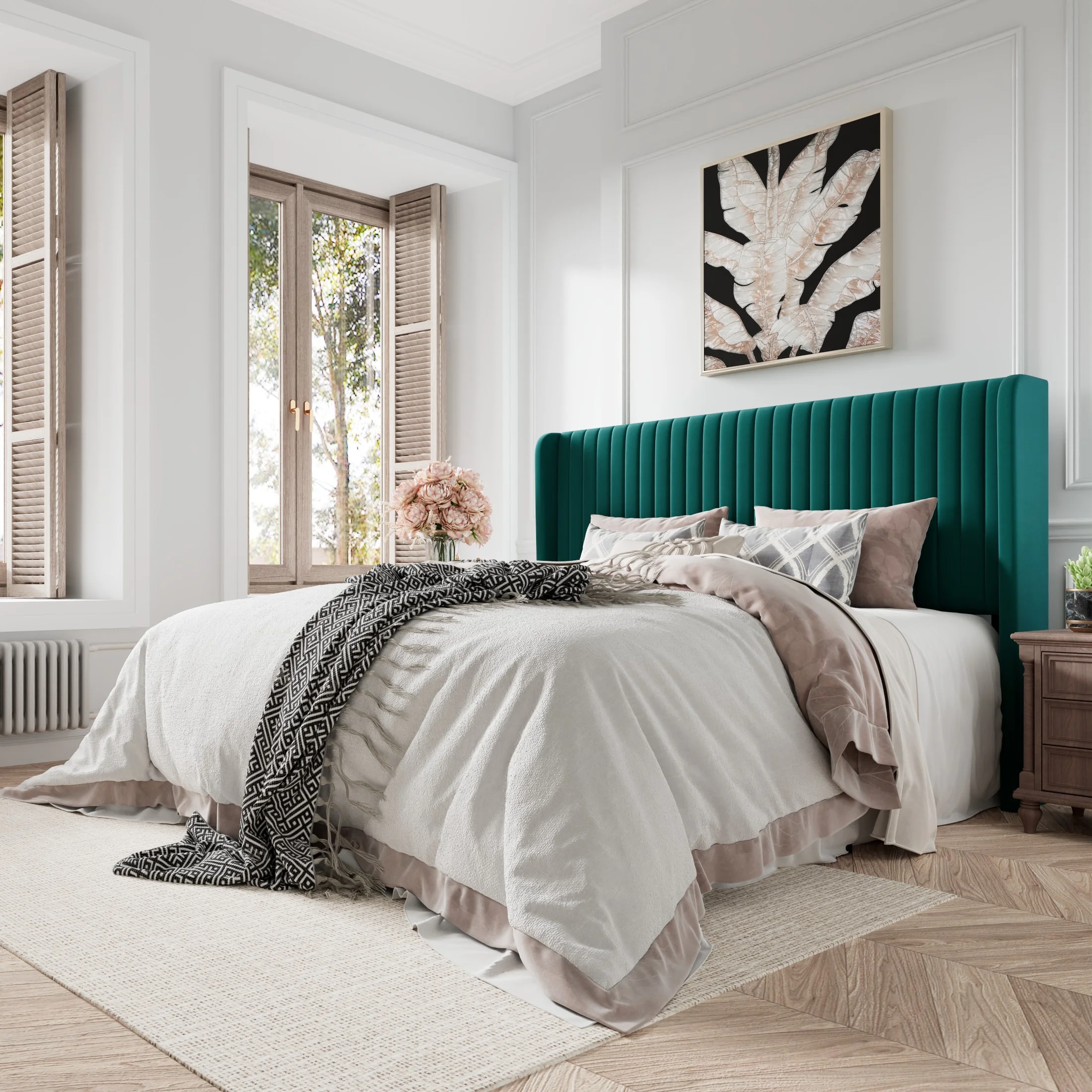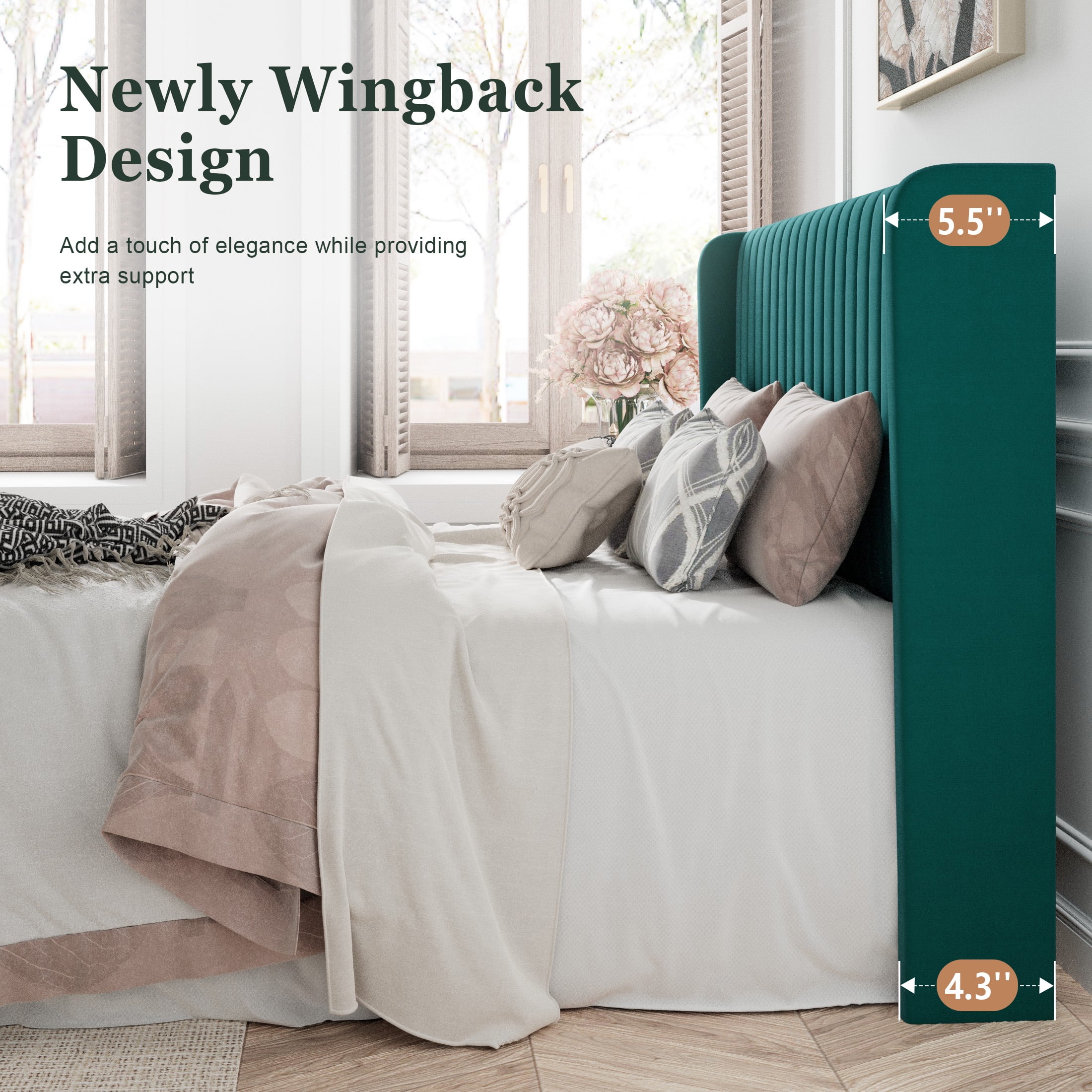 Amolife King Size Velvet Vertical Stripe Upholstered Bed Frame with Wingback Headboard, Lake Blue