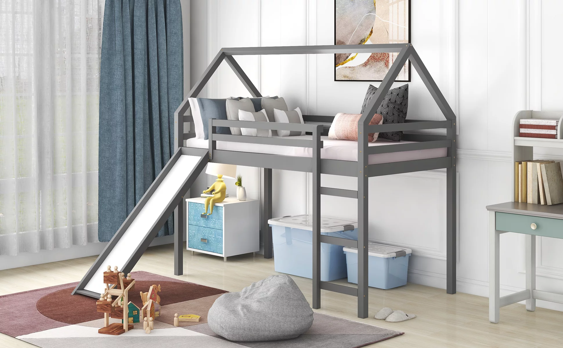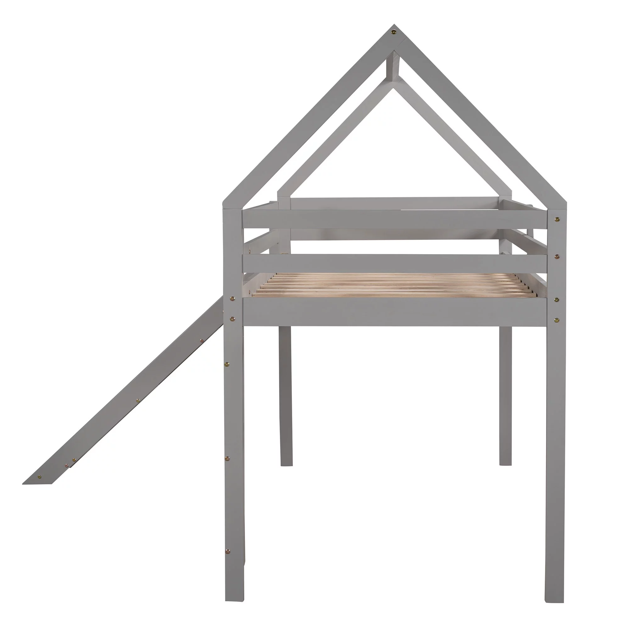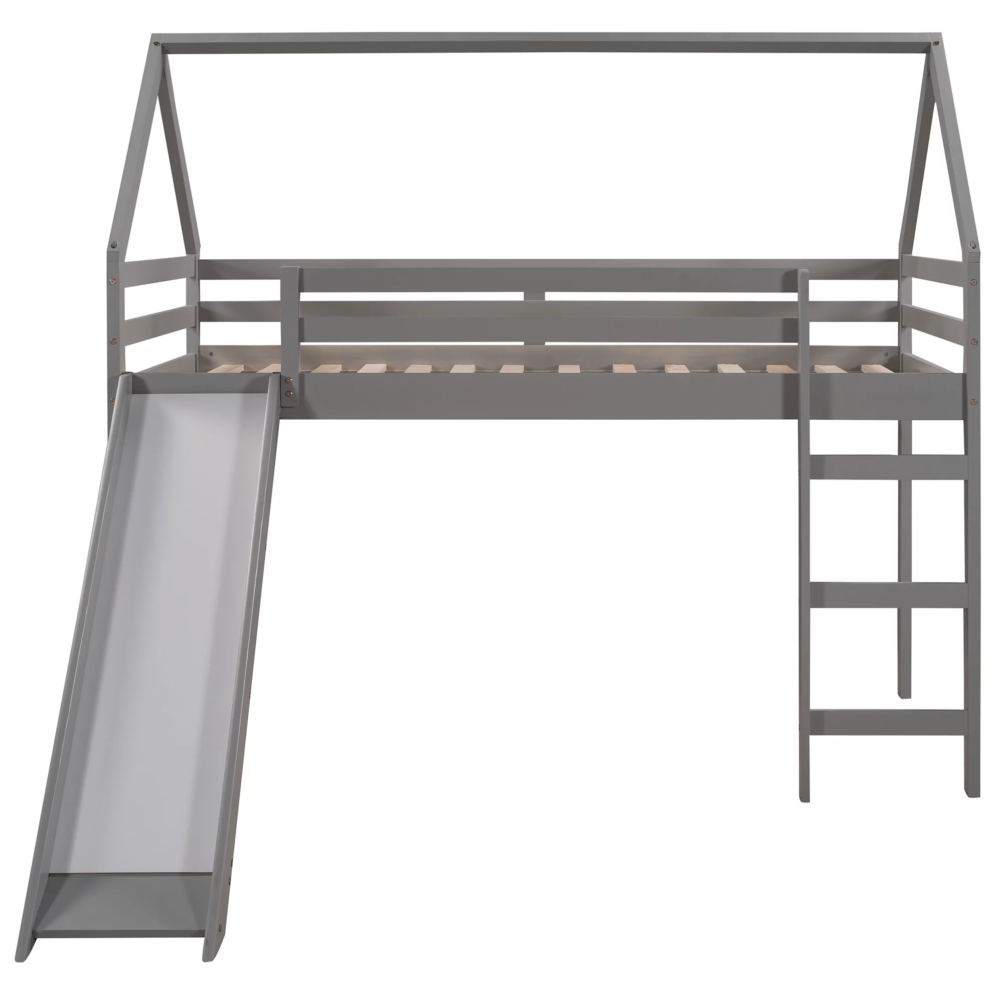 Twin Loft Bed with Slide, House Bed with Slide,Gray(OLD SKU :WF286245AAE)