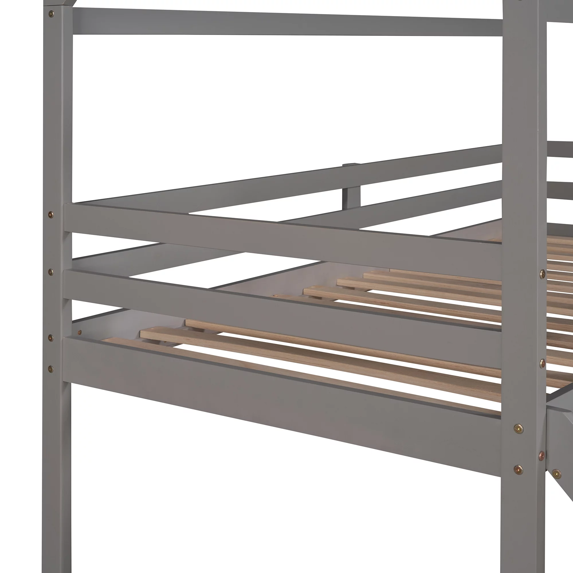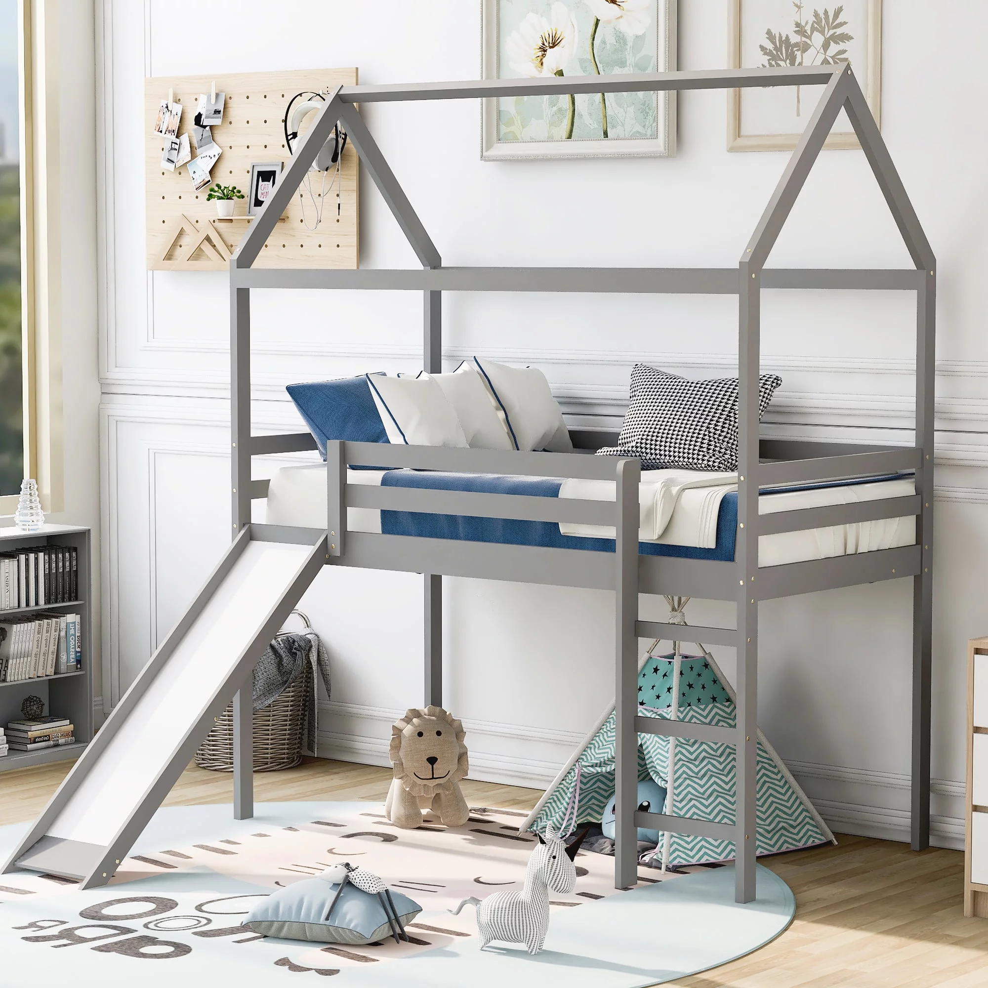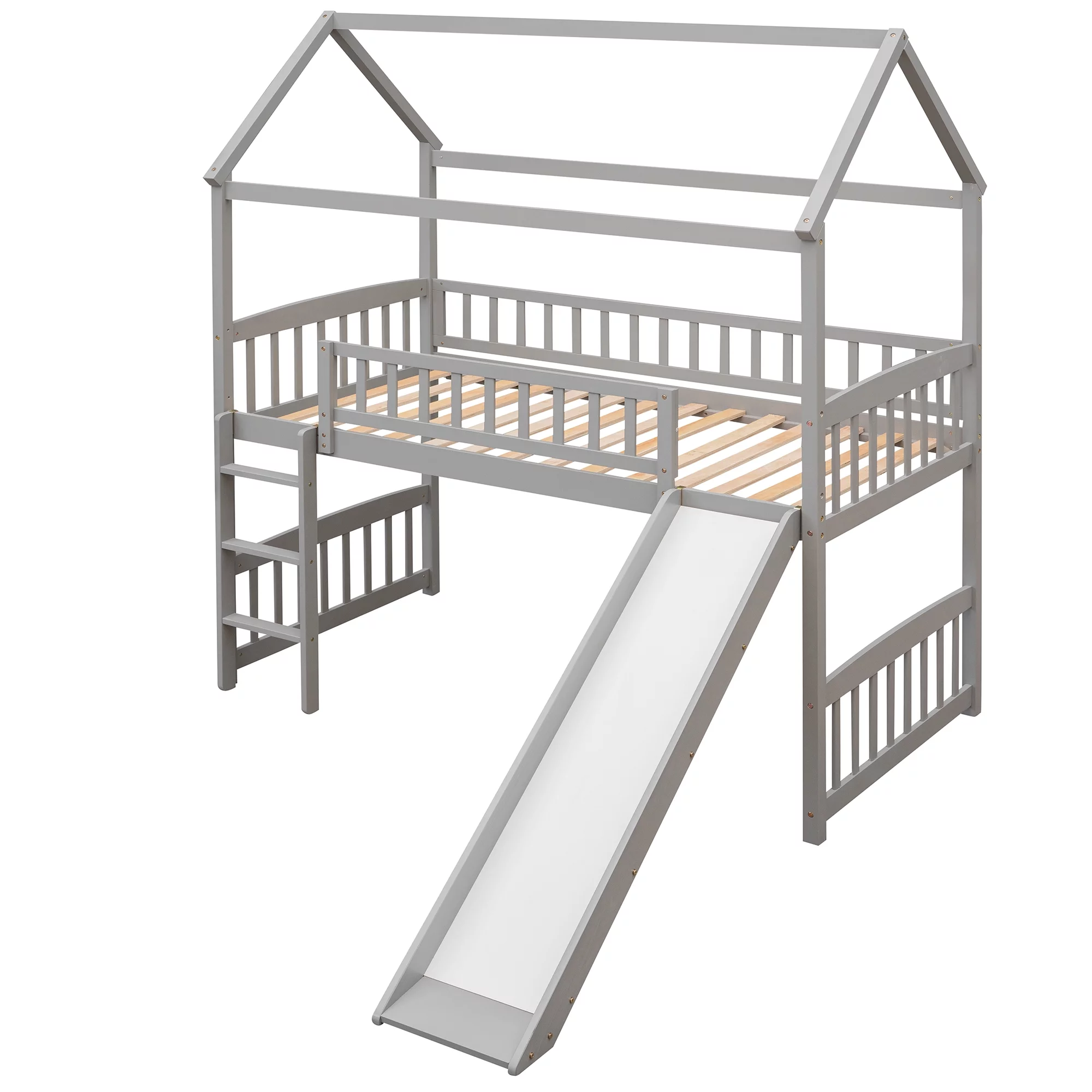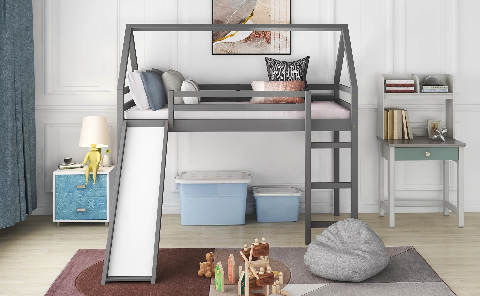 Twin Loft Bed with Slide, House Bed with Slide,Gray(OLD SKU :WF286245AAE)