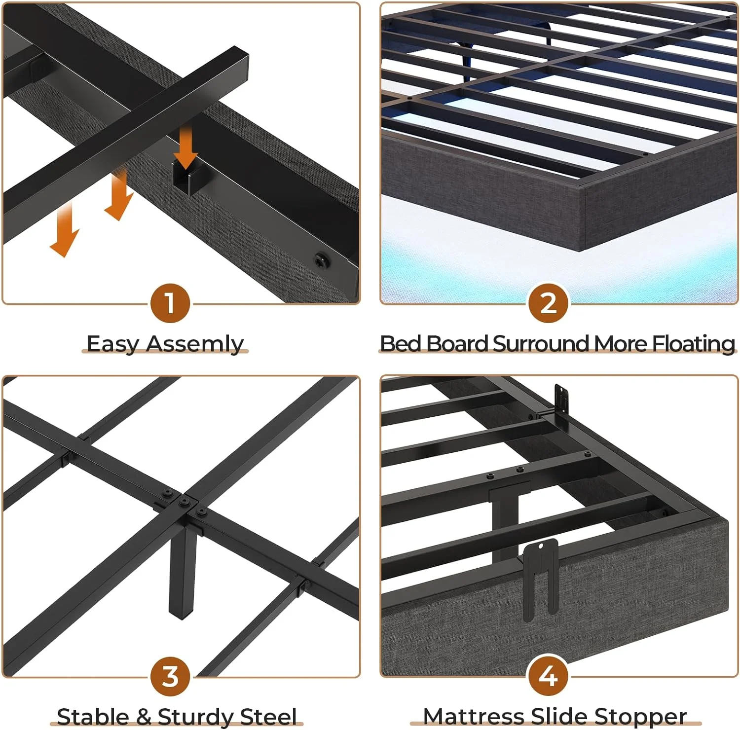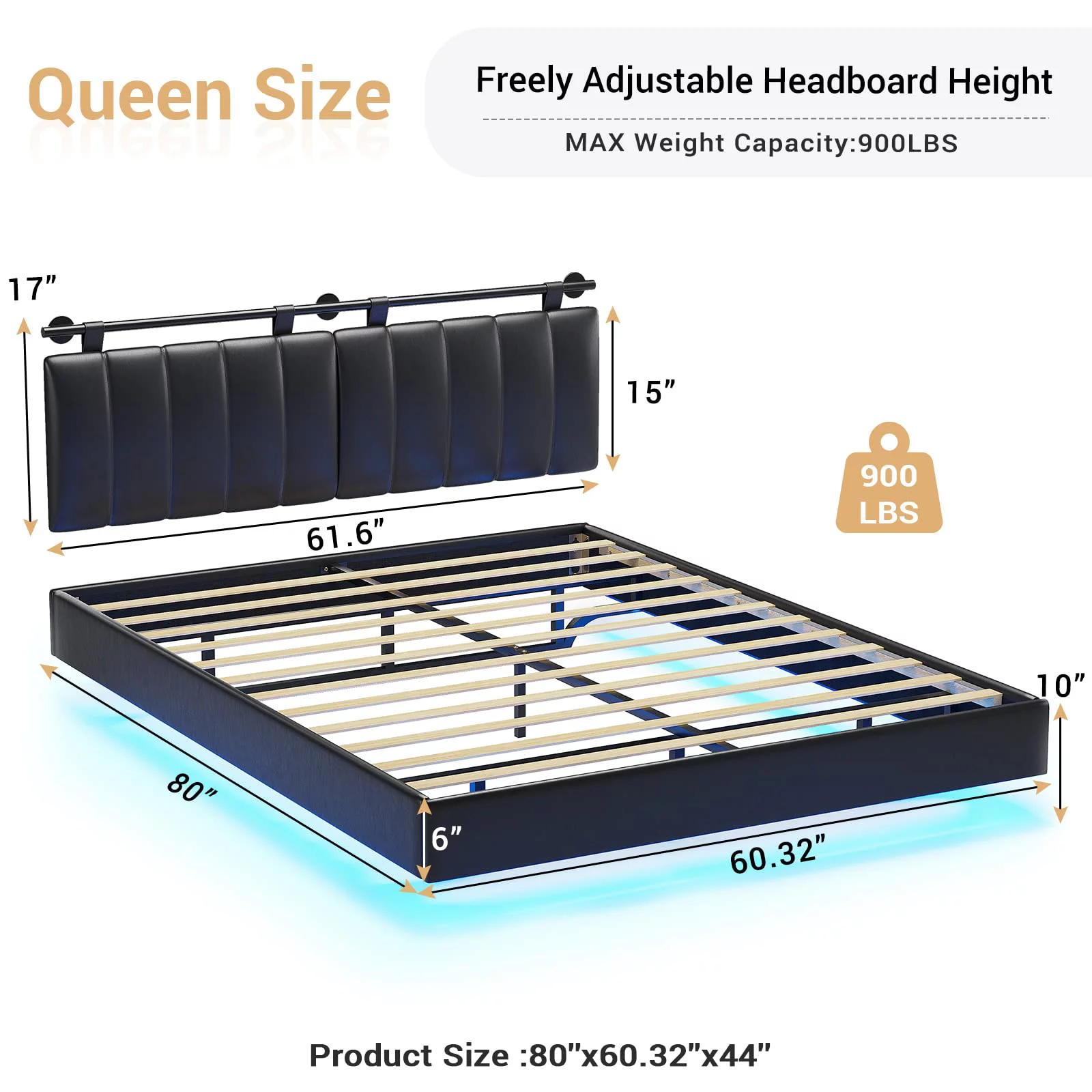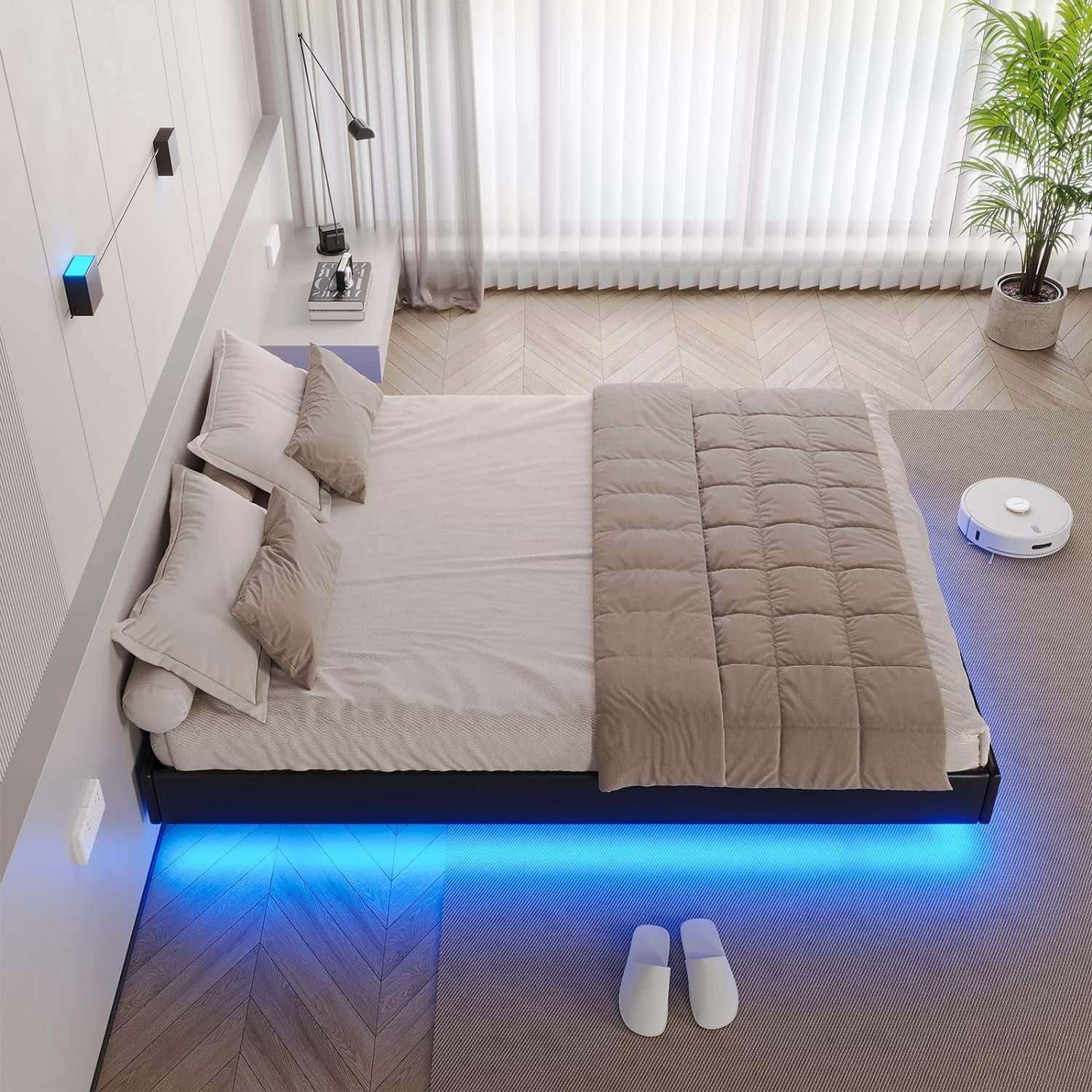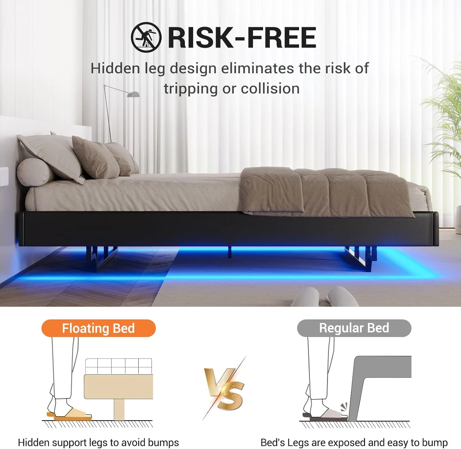 Weiplehoom Floating Queen Bed with LED Lights, Metal Platform Bed with Heavy Duty Steel Slats and 4 Mattress Stopper