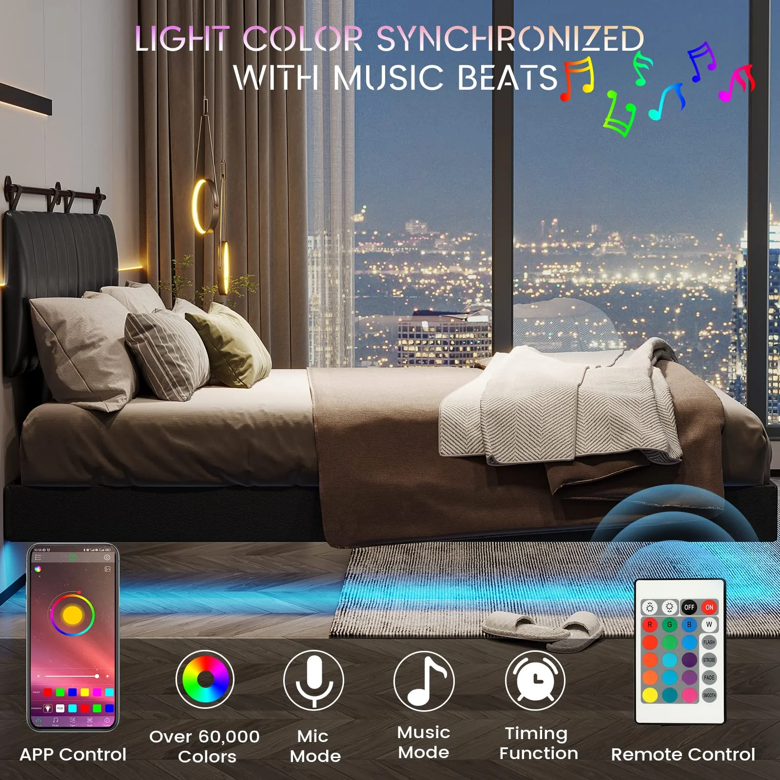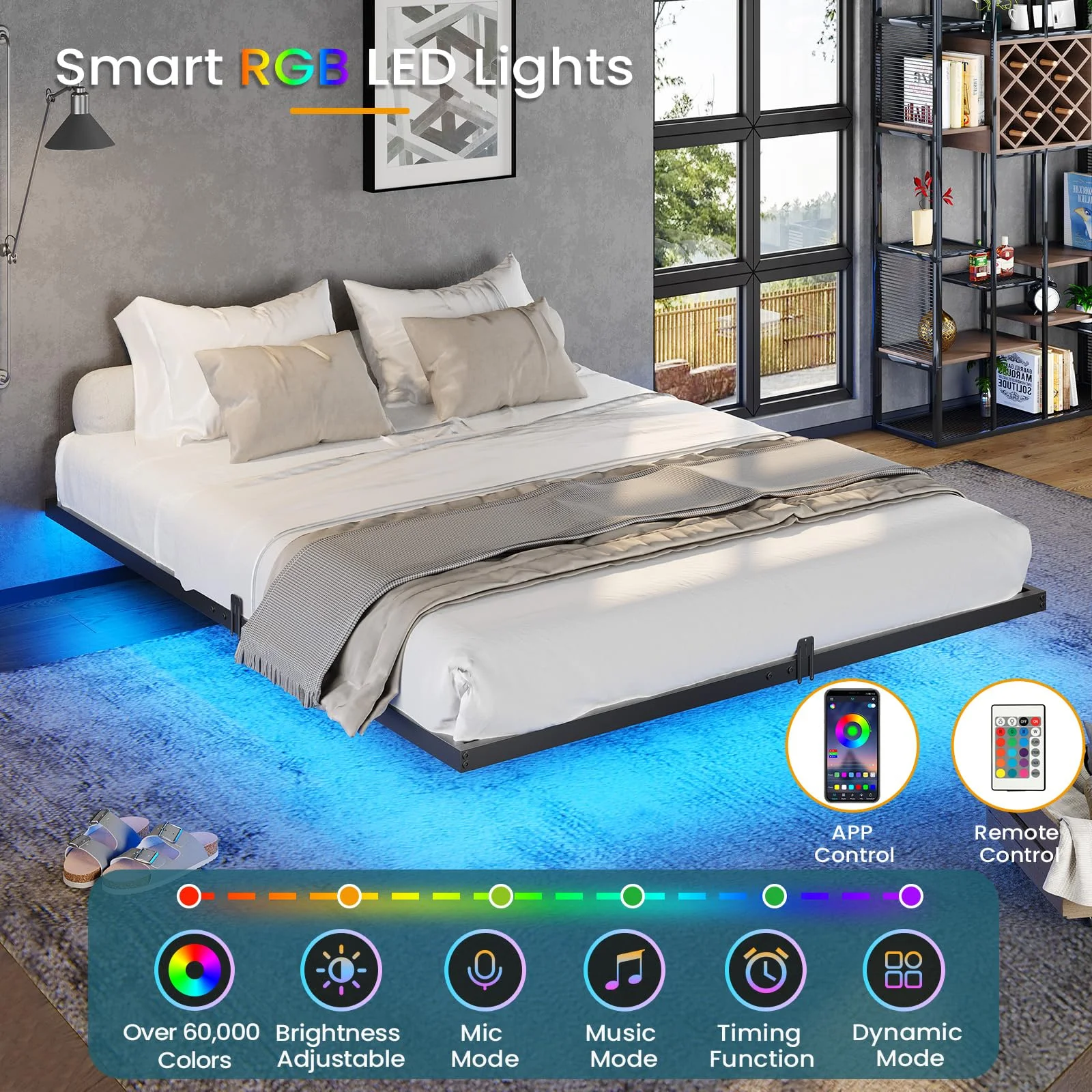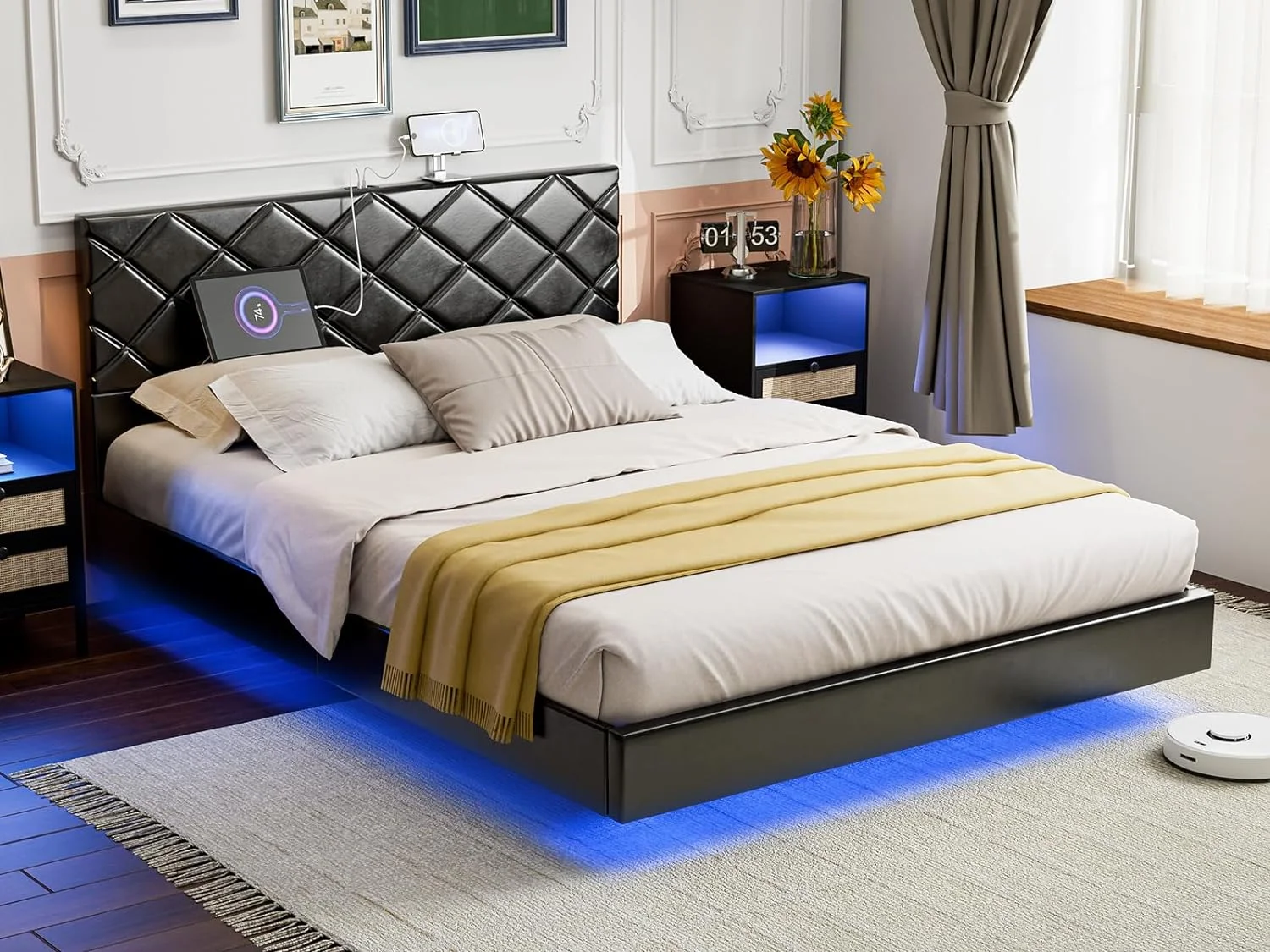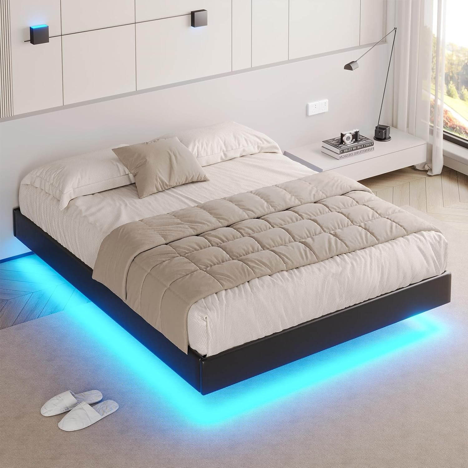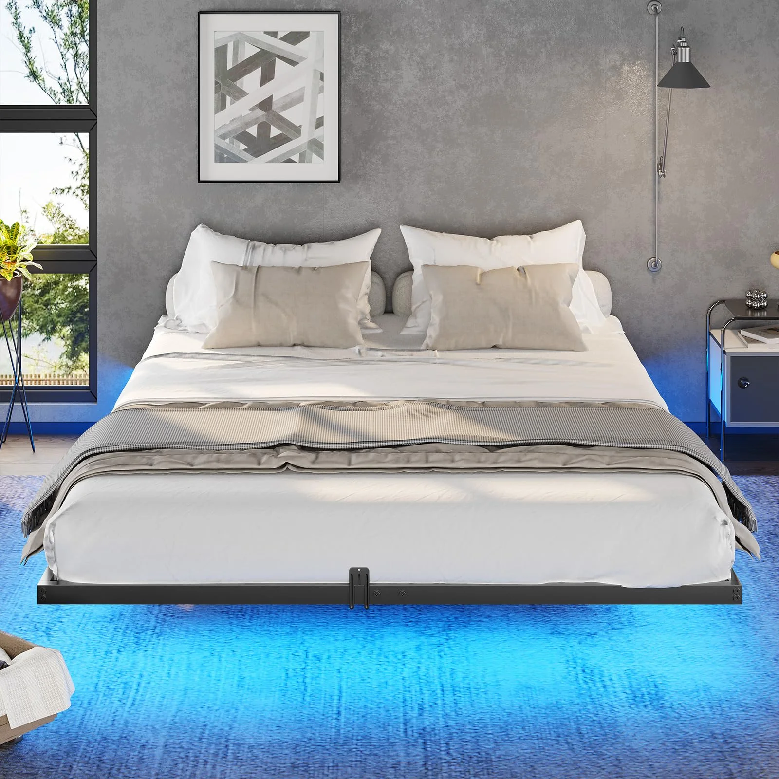 Weiplehoom Floating Queen Bed with LED Lights, Metal Platform Bed with Heavy Duty Steel Slats and 4 Mattress Stopper