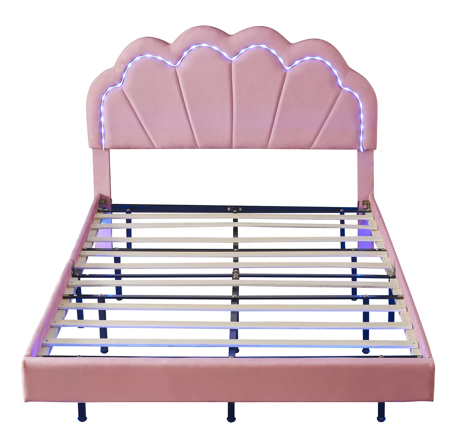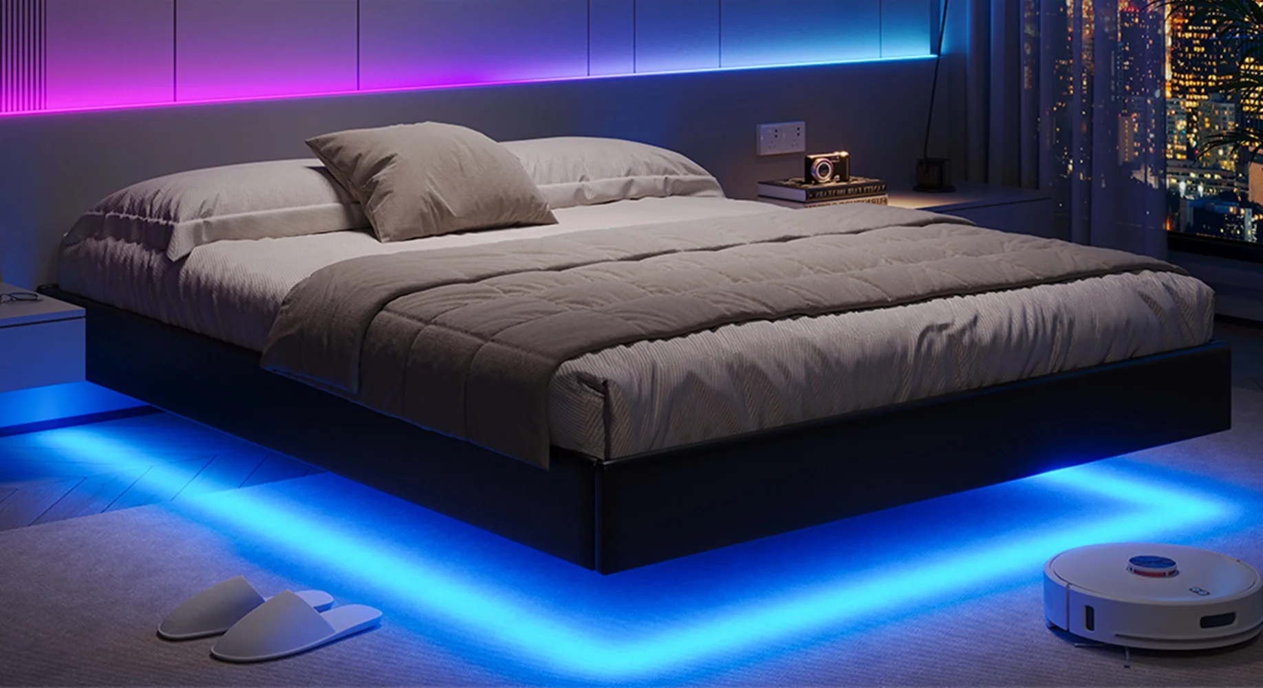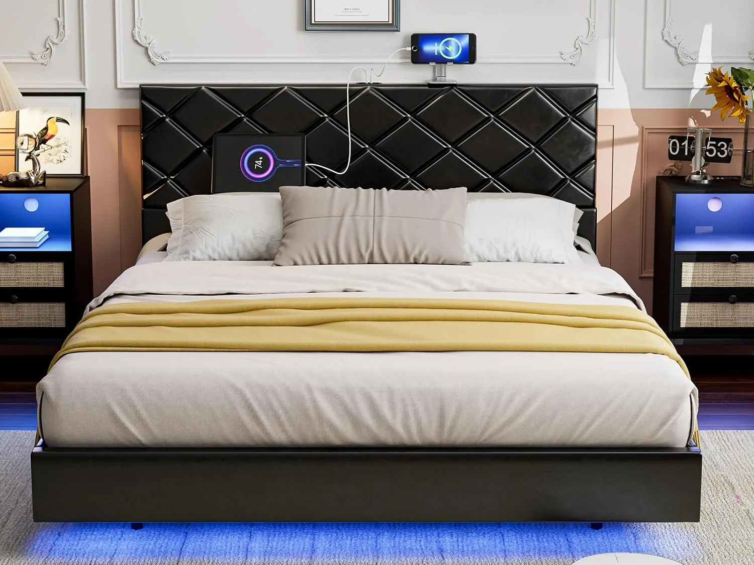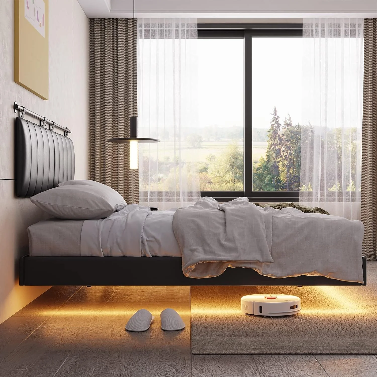 Weiplehoom Floating Queen Bed with LED Lights, Metal Platform Bed with Heavy Duty Steel Slats and 4 Mattress Stopper