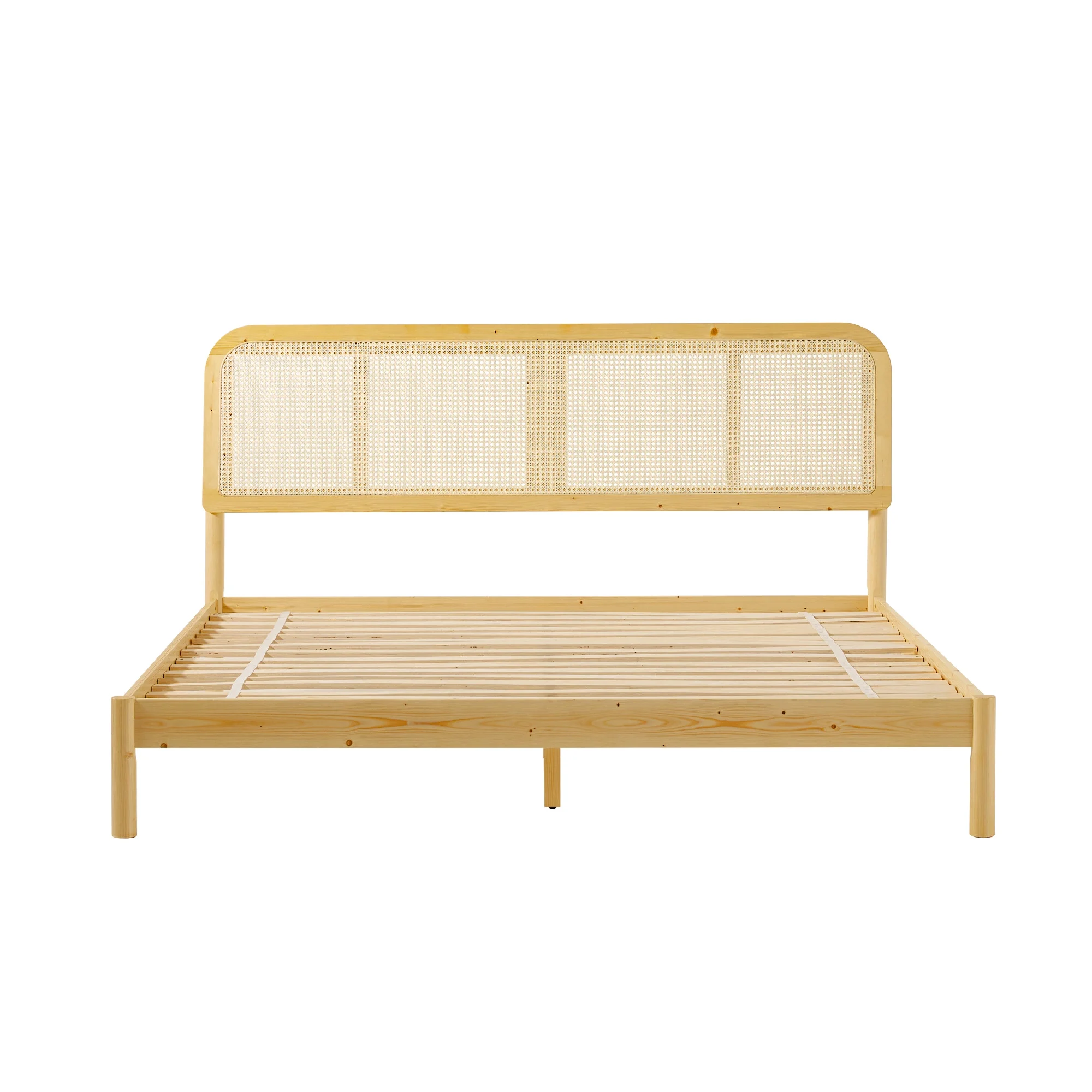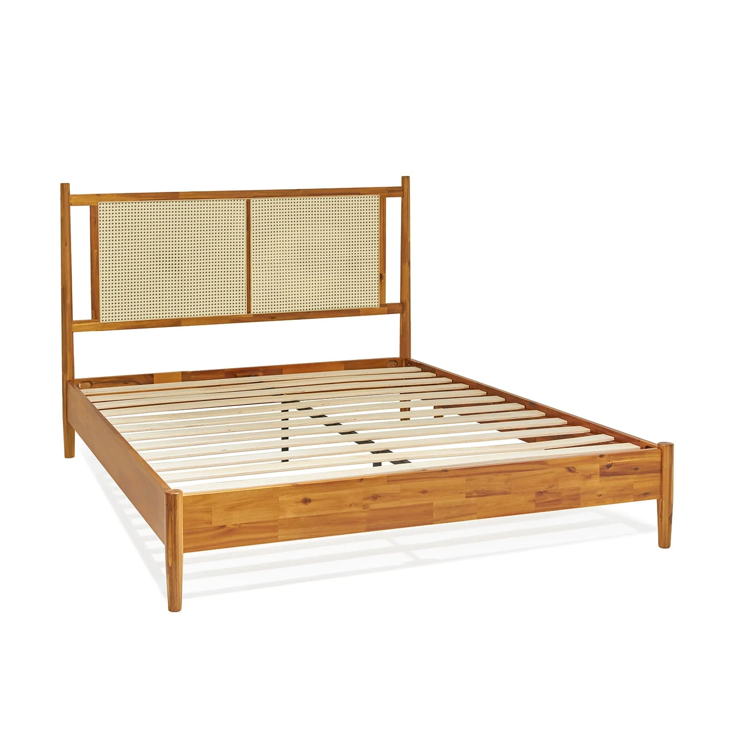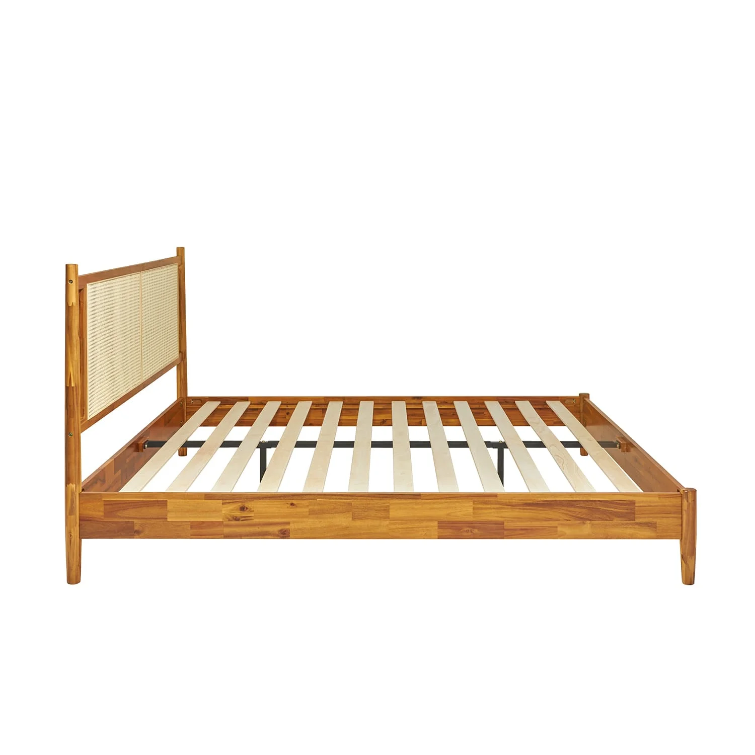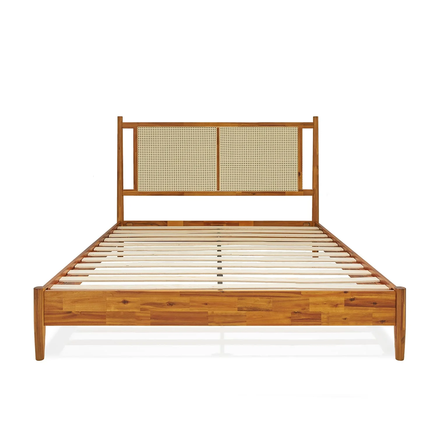 BME Asher 47" Queen Platform Bed Frame, Rattan Headboard, Mid Century and Boho, Solid Wood, Caramel