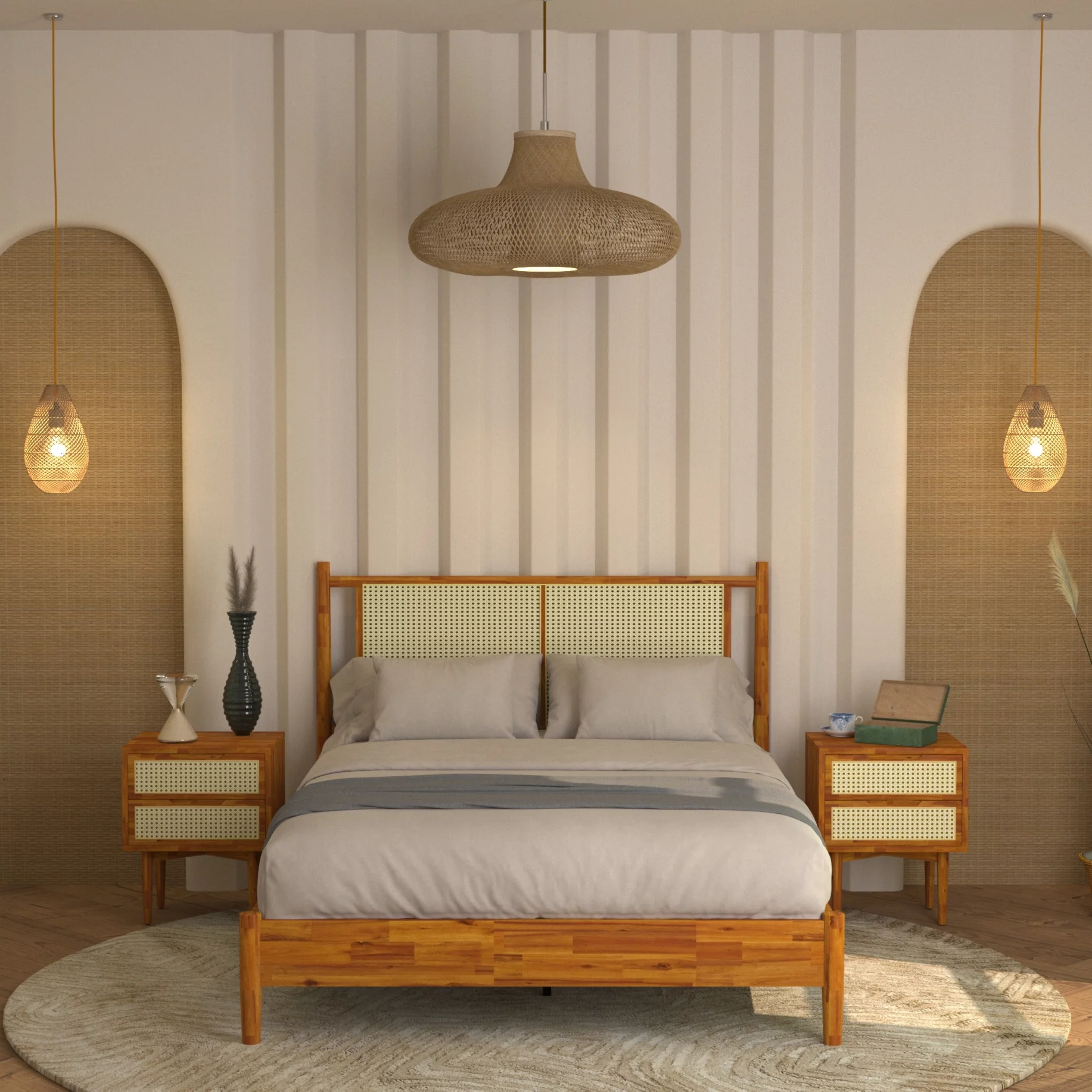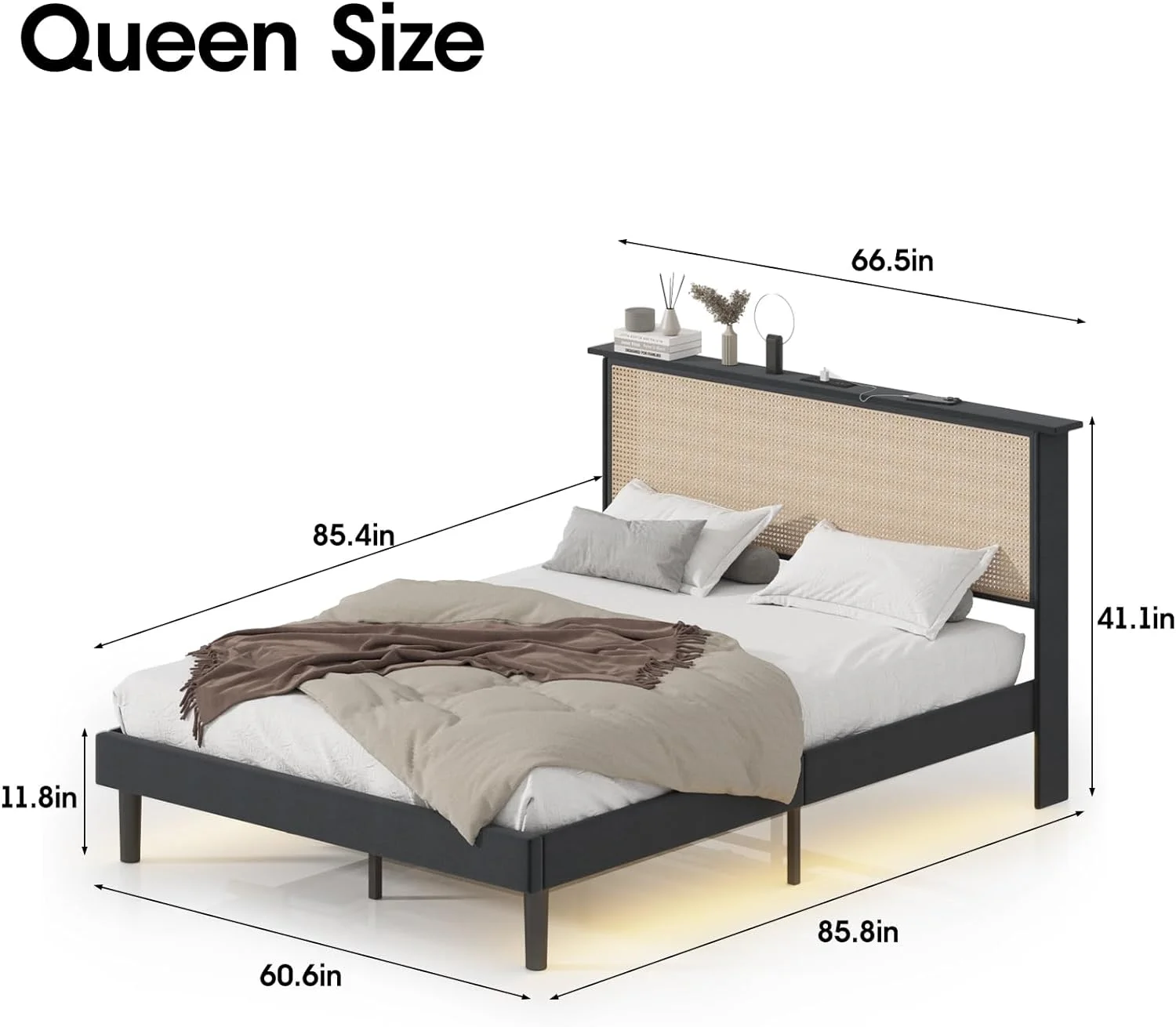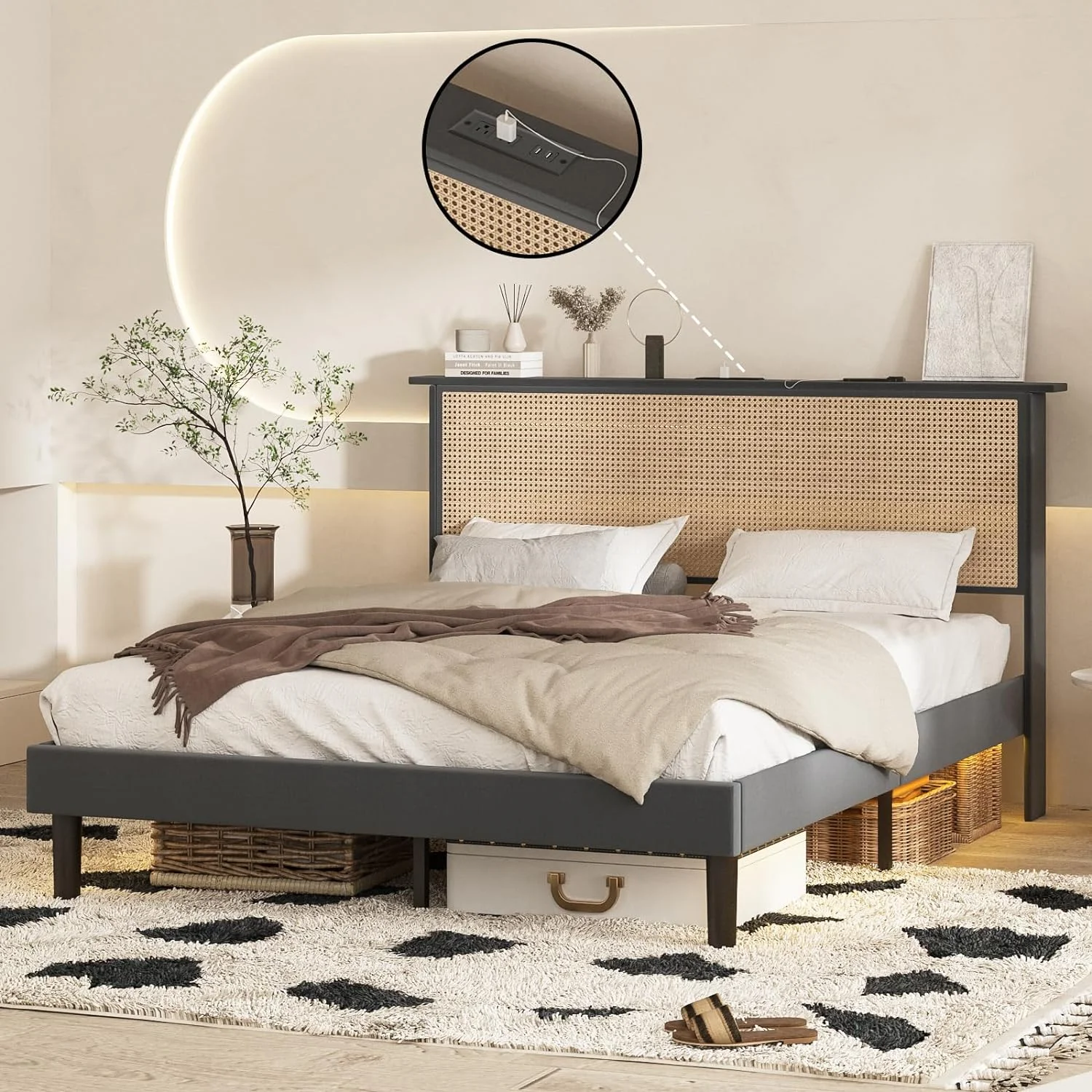 BME Asher 47" Queen Platform Bed Frame, Rattan Headboard, Mid Century and Boho, Solid Wood, Caramel