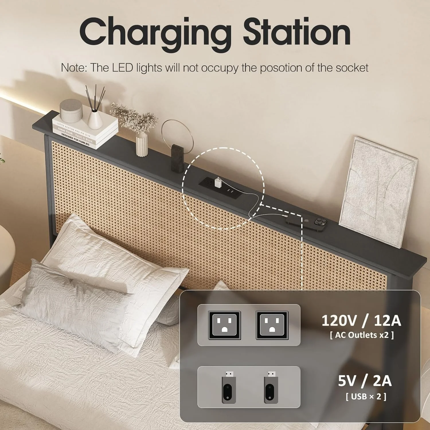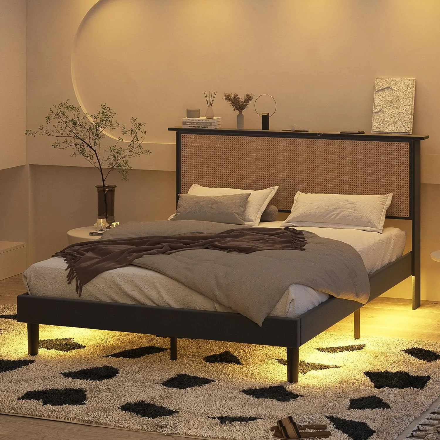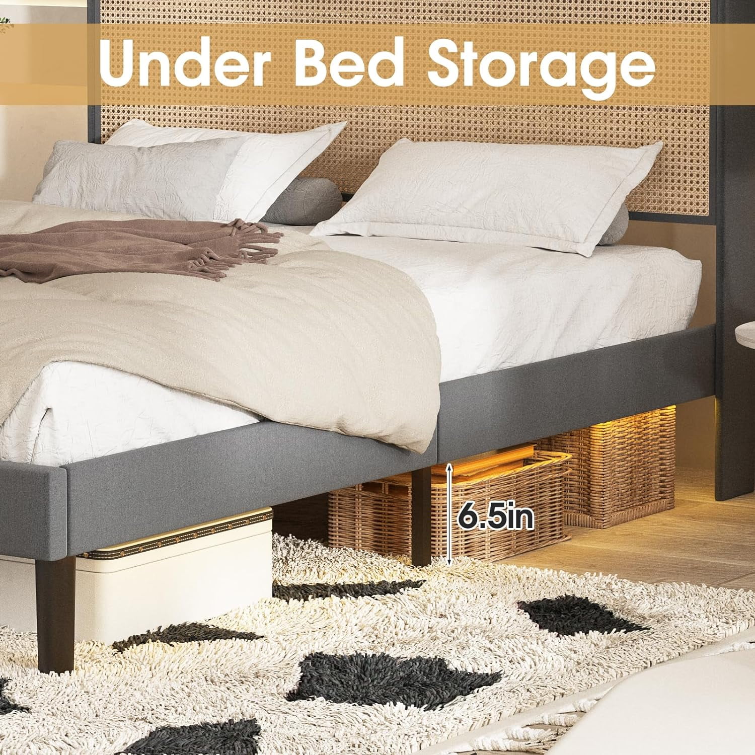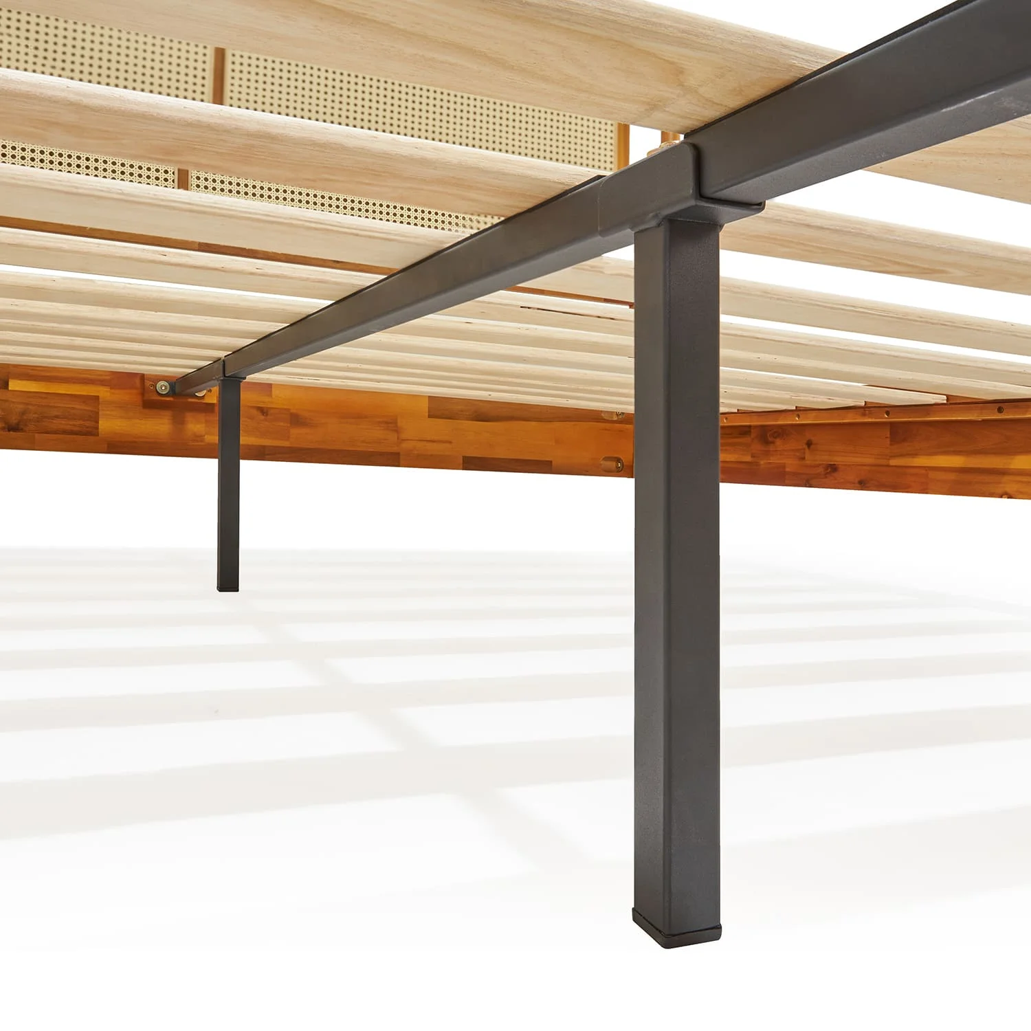 BME Asher 47" Queen Platform Bed Frame, Rattan Headboard, Mid Century and Boho, Solid Wood, Caramel