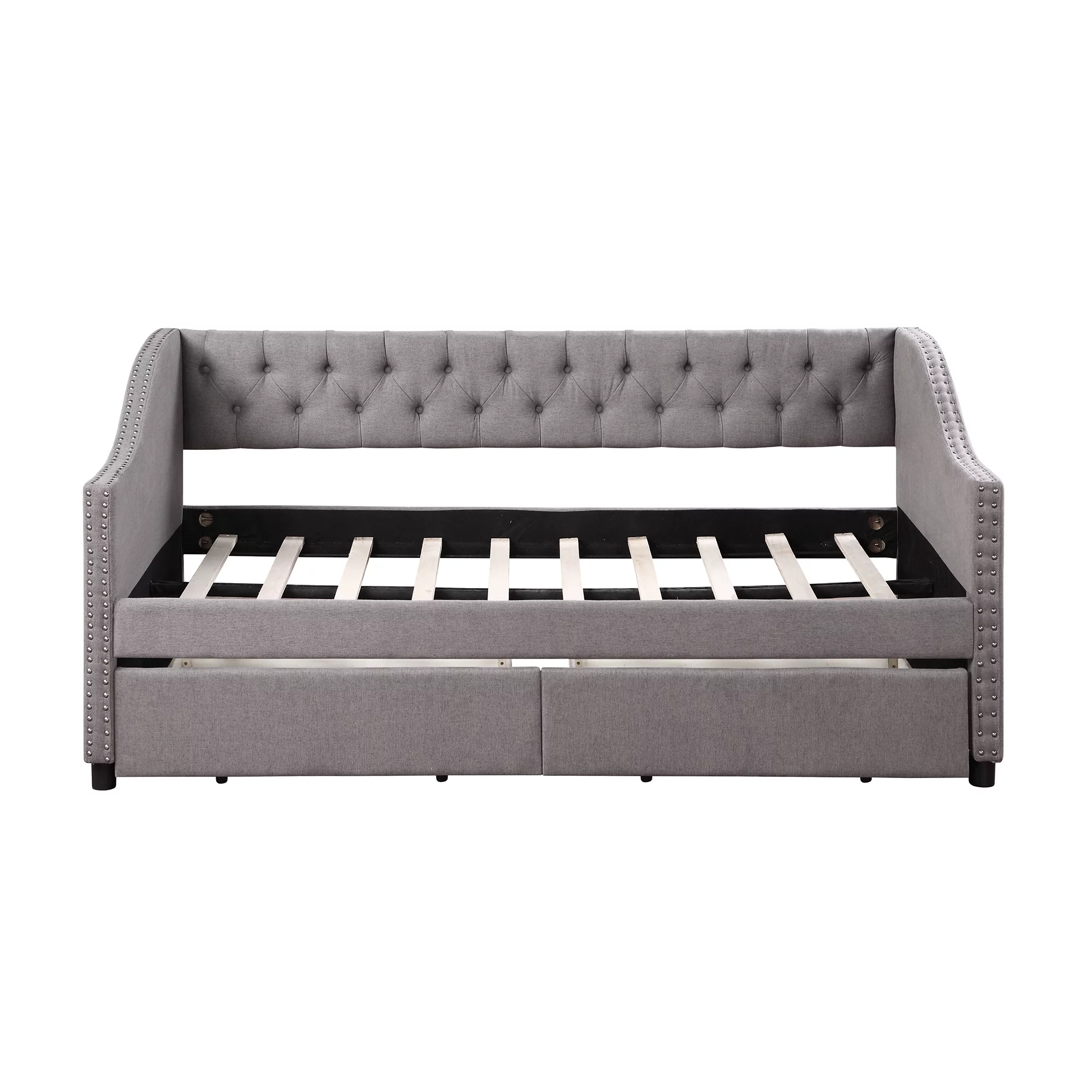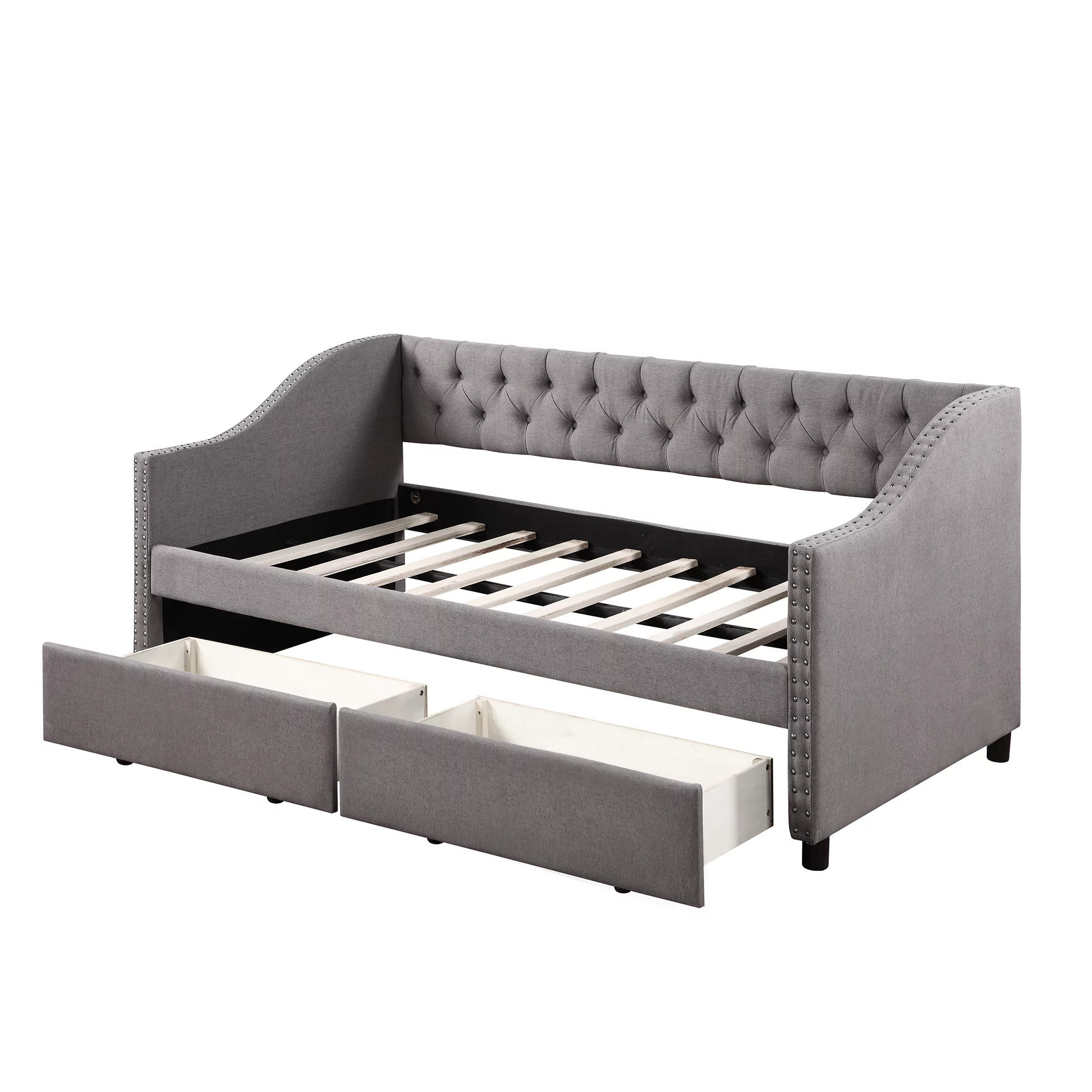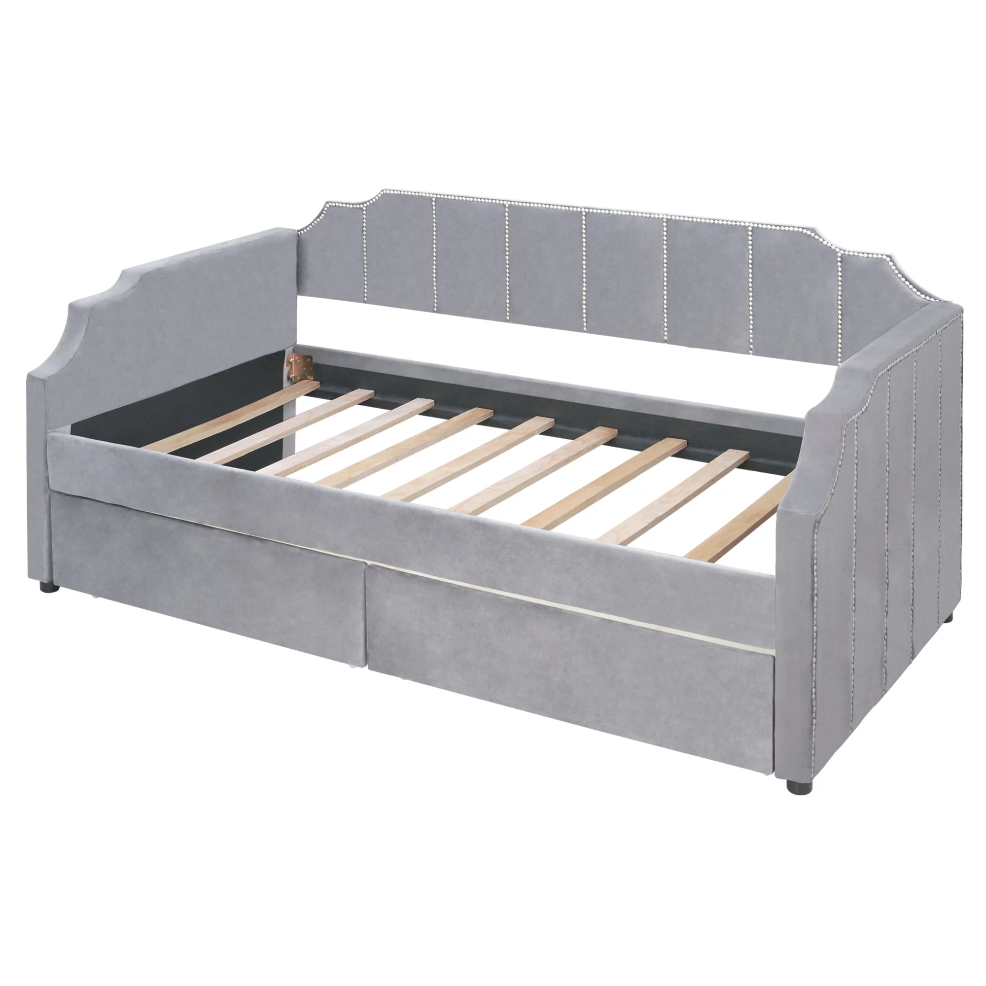 Gray Twin Size Upholstered Daybed with Two Drawers, Wood Slat Support