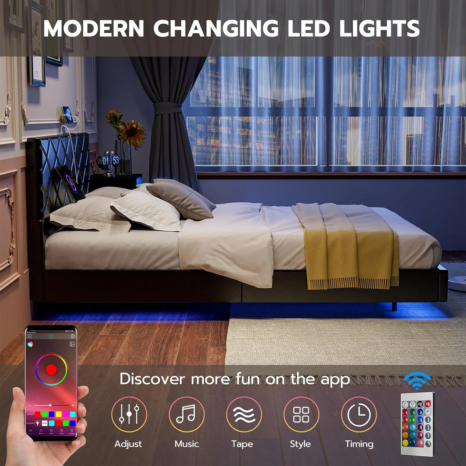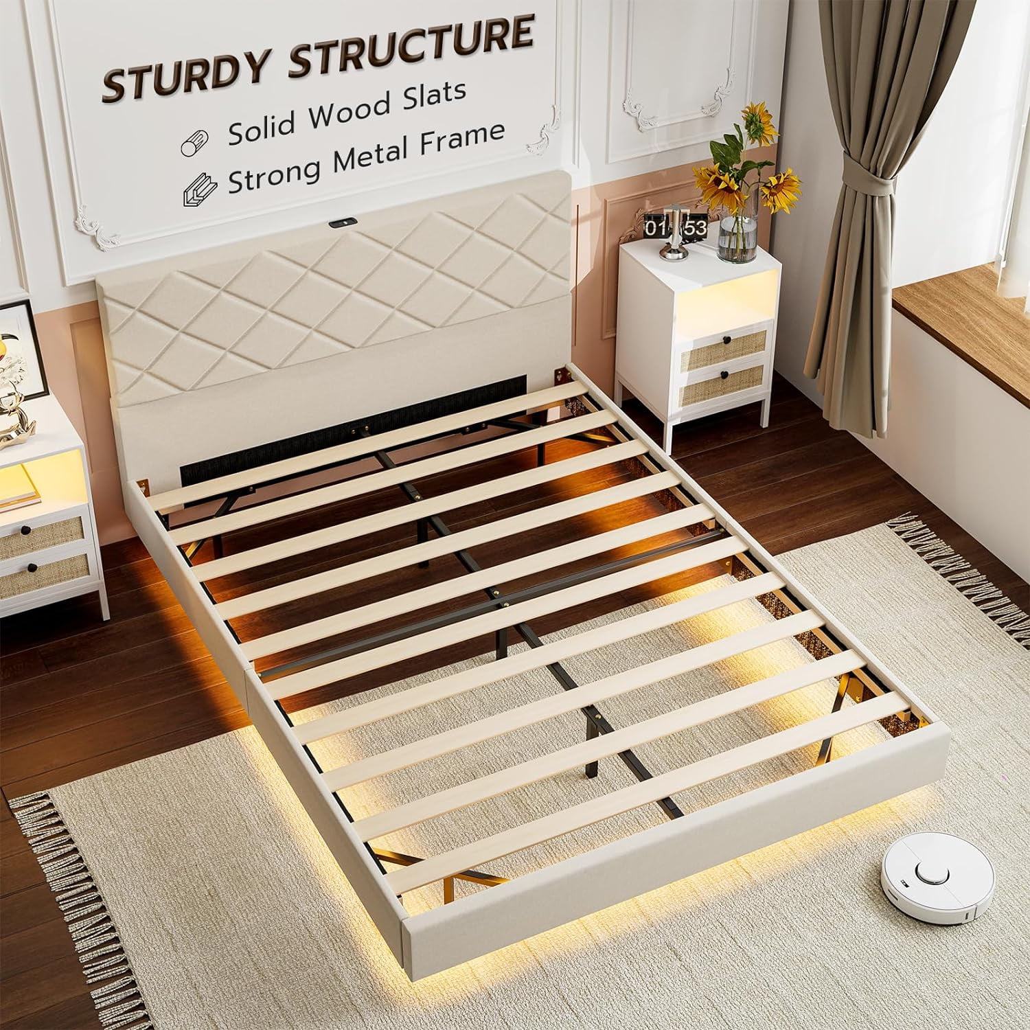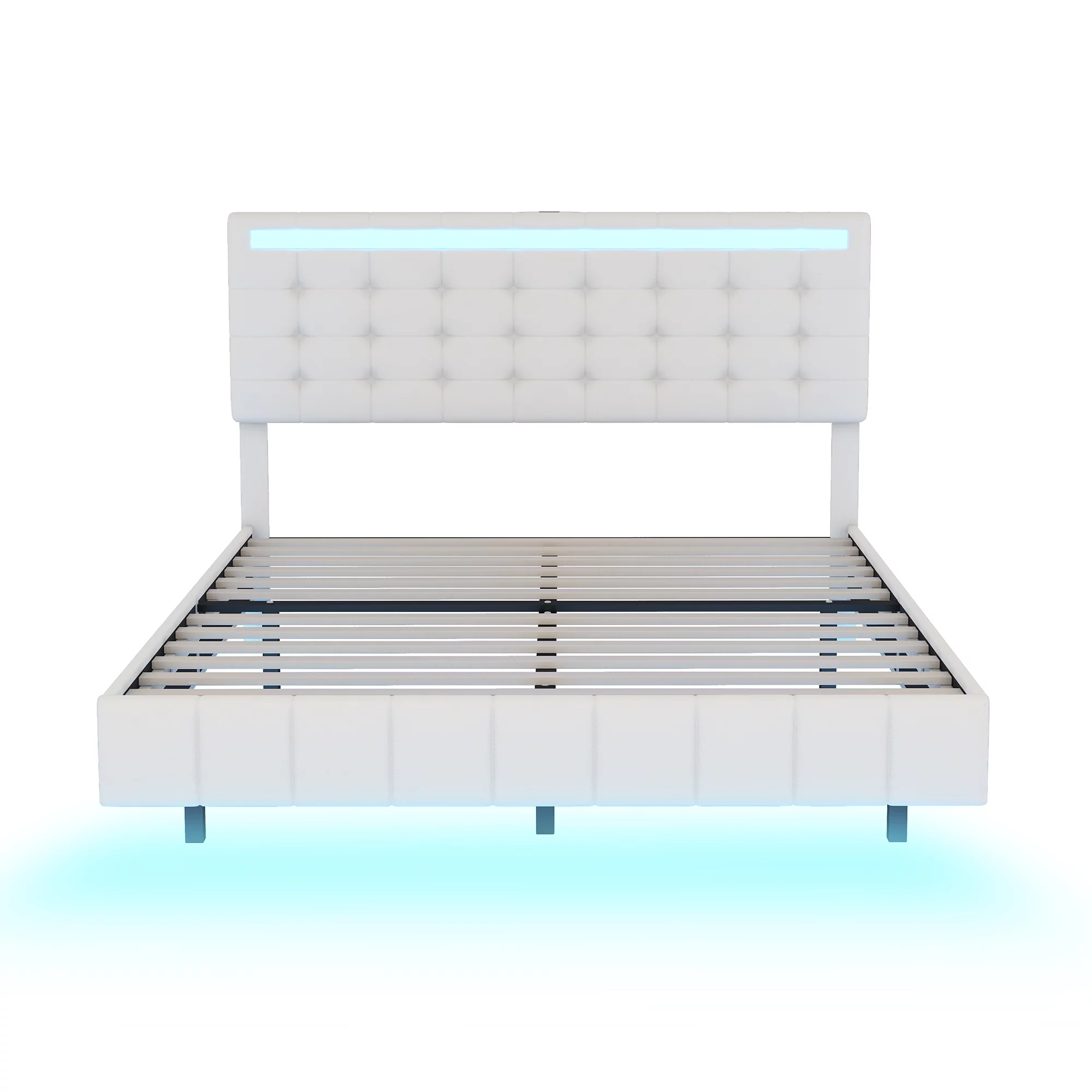 Queen Size Floating Bed Frame with LED Lights and USB Charging,Cosymart Modern Upholstered Platform LED Bed Frame,White