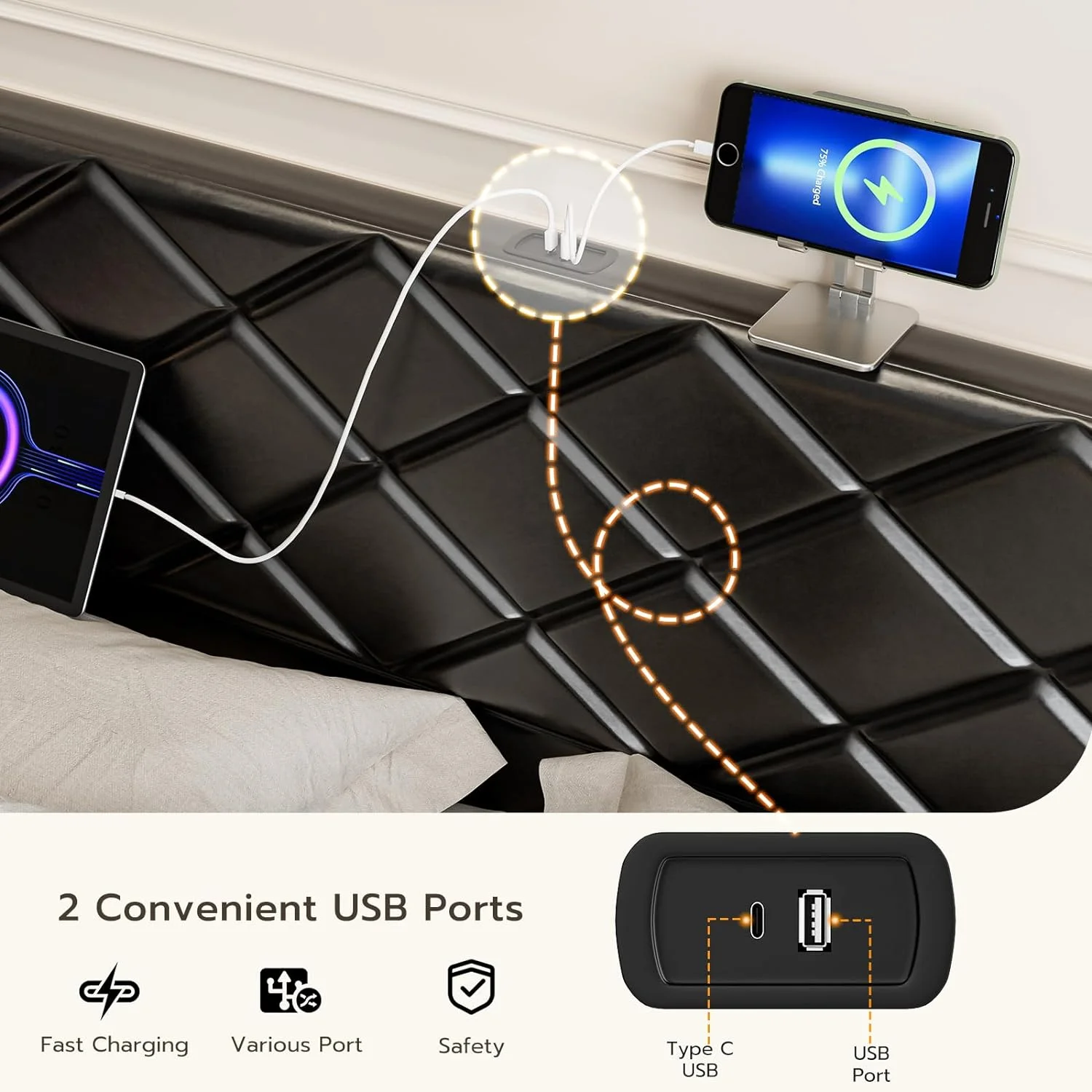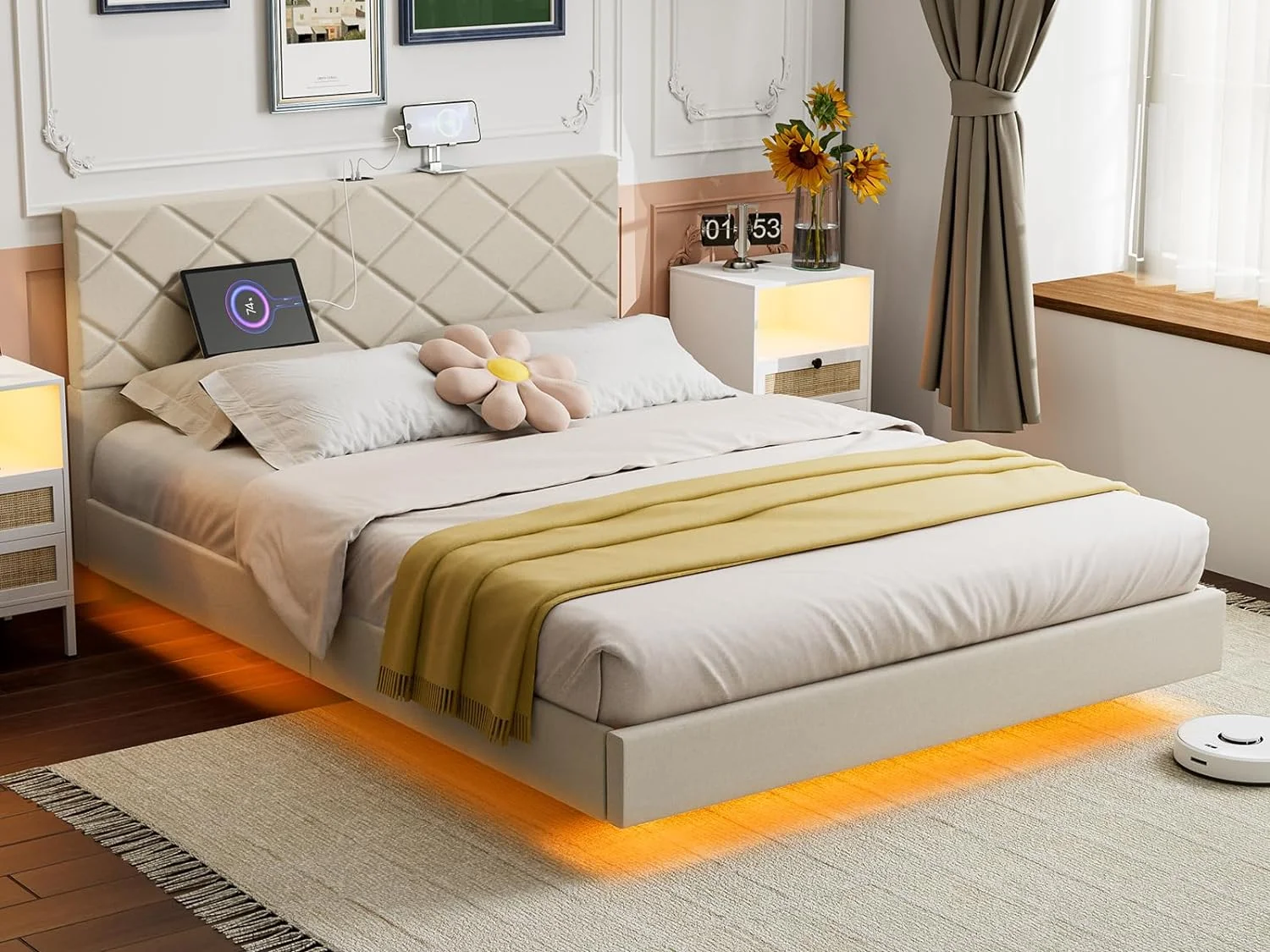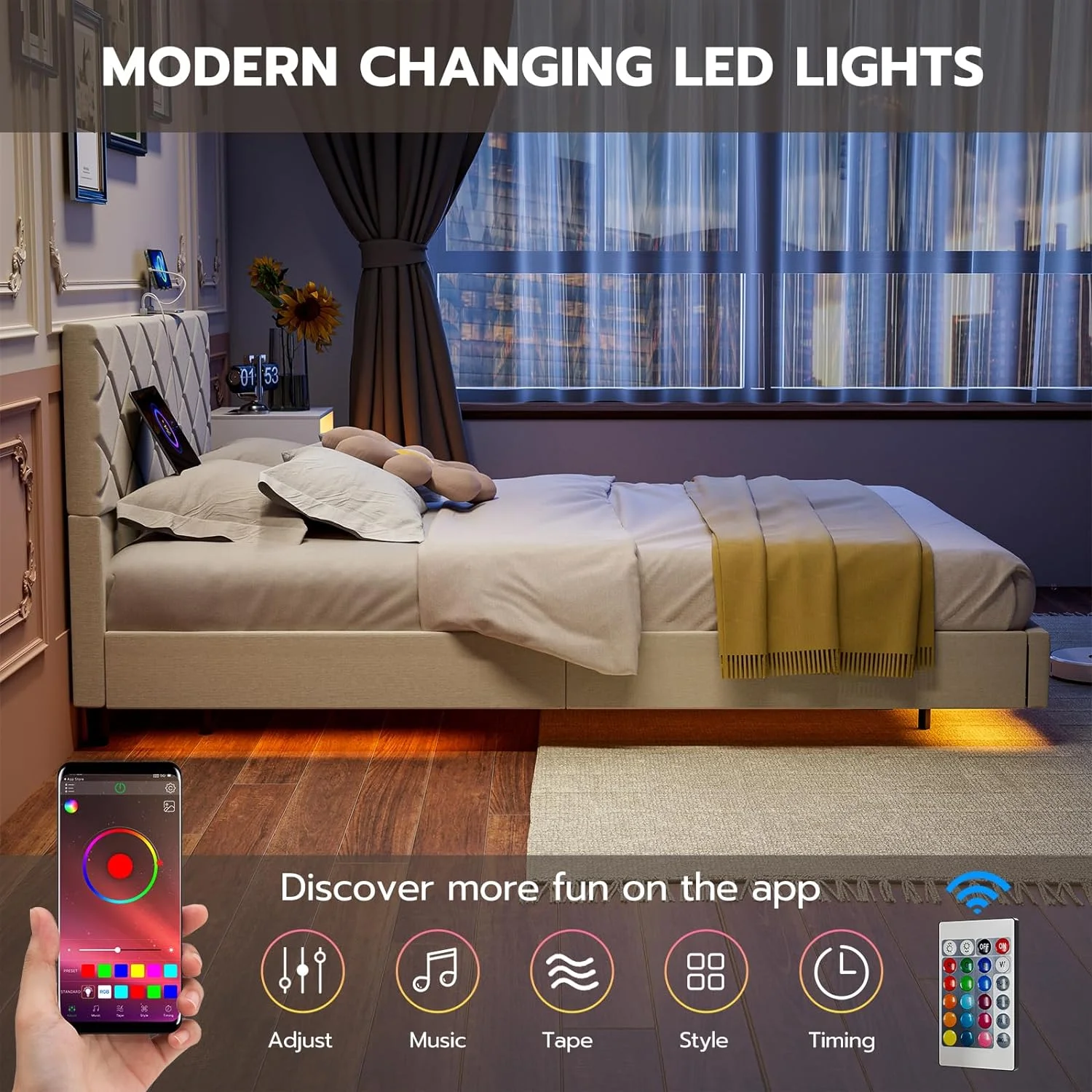 Queen Size Floating Bed Frame with LED Lights and USB Charging,Cosymart Modern Upholstered Platform LED Bed Frame,White