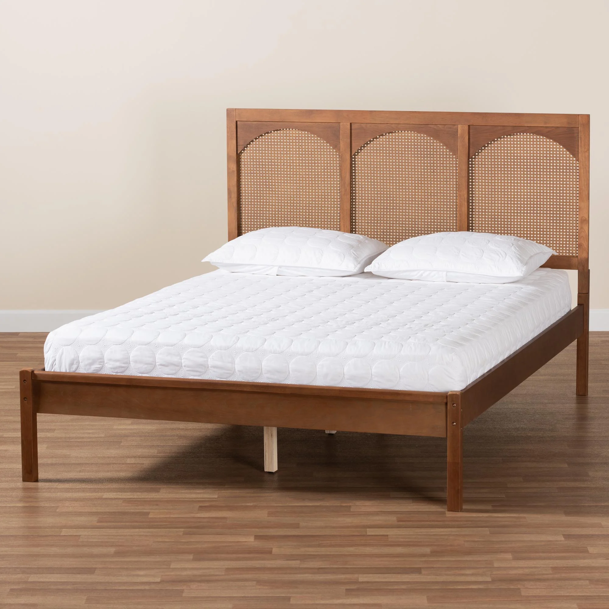 Baxton Studio Elston Mid-Century Modern Walnut Brown Finished Wood and Synthetic Rattan Queen Size Platform Bed