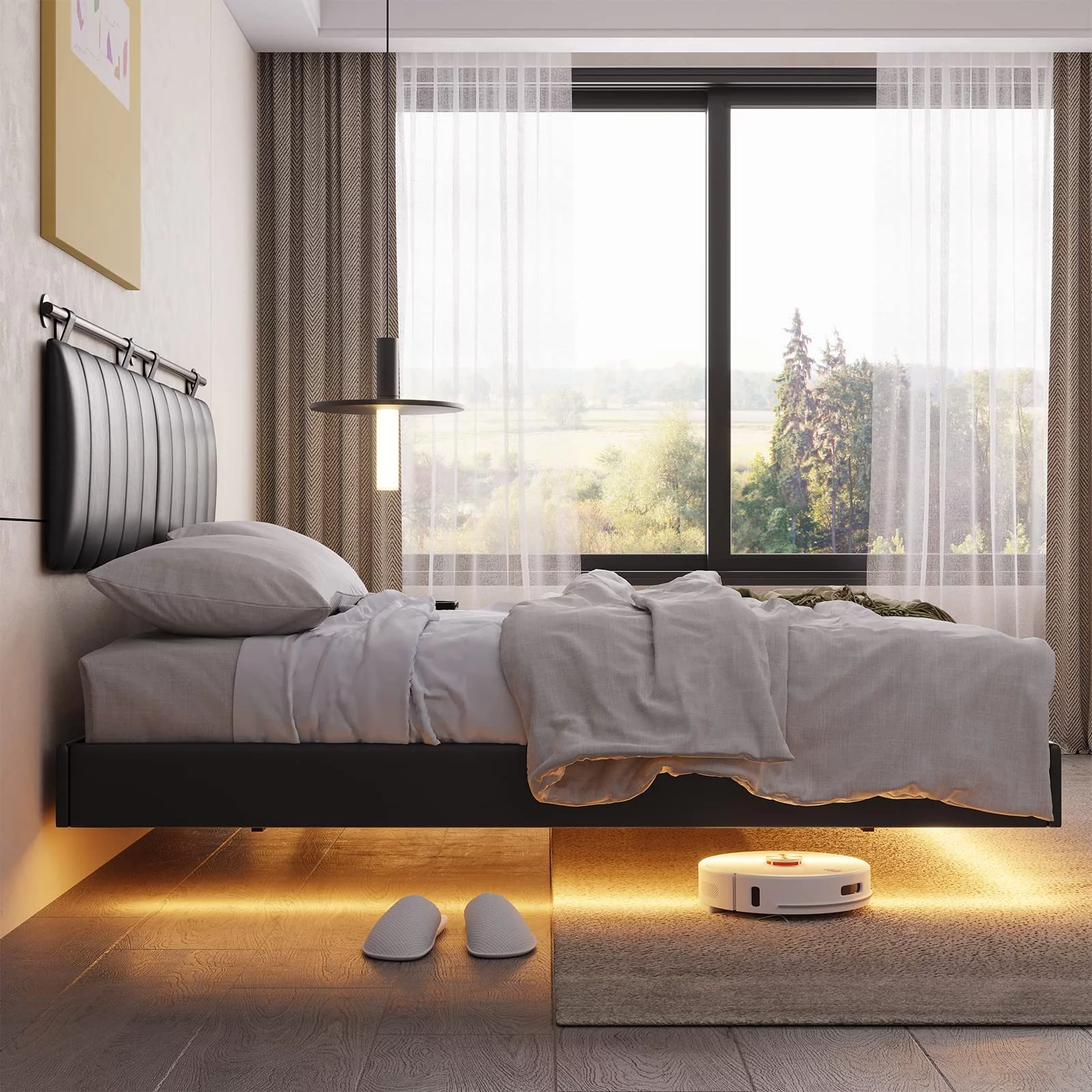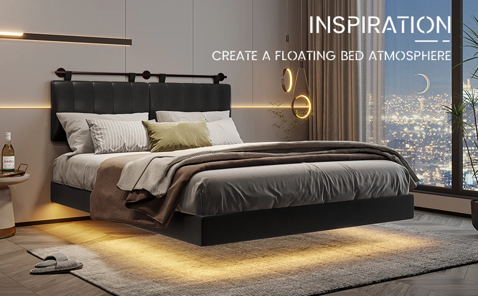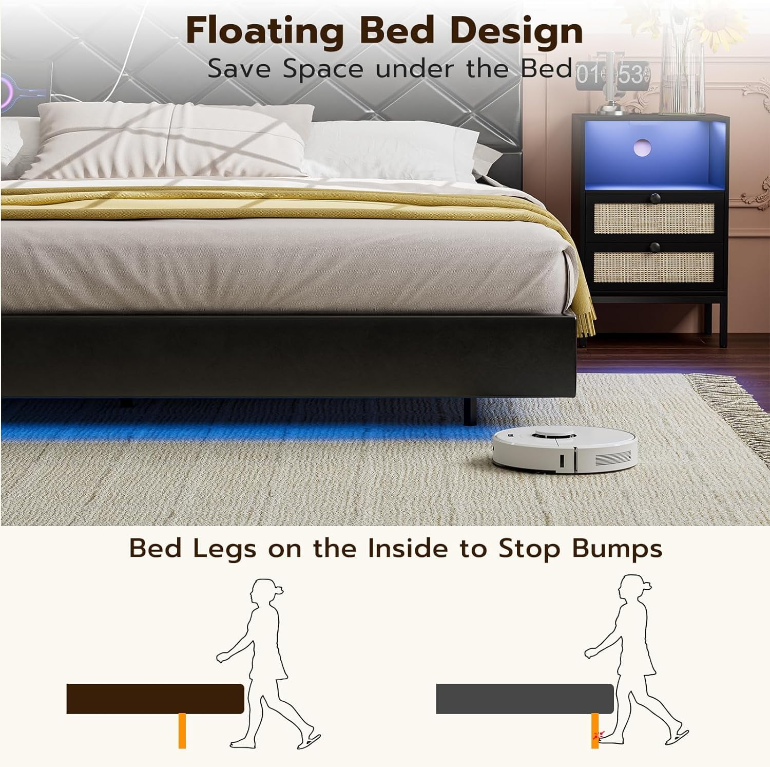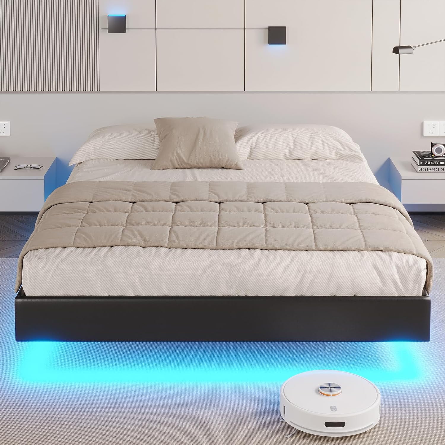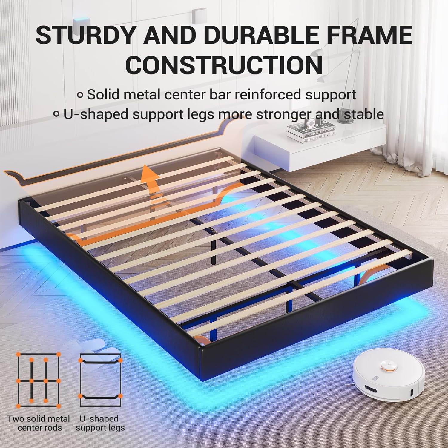 Floating Bed Frame Queen Size Faux Leather Upholstered Platform Bed Frame with LED Lights, No Headboard, Black