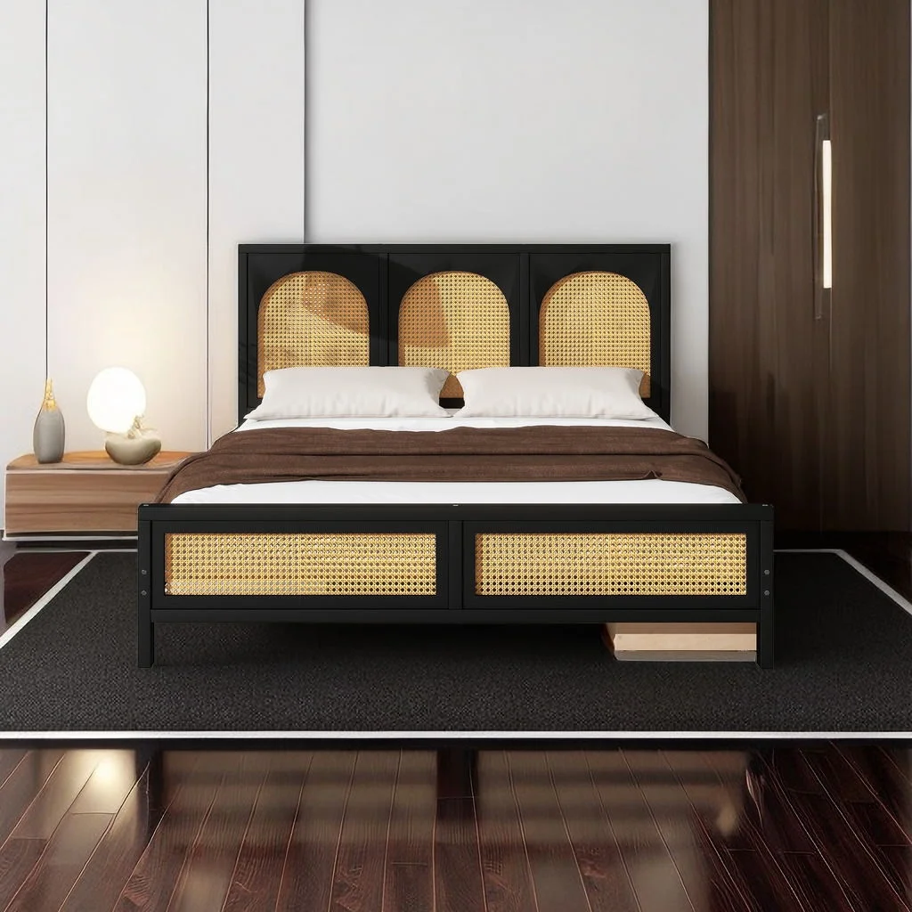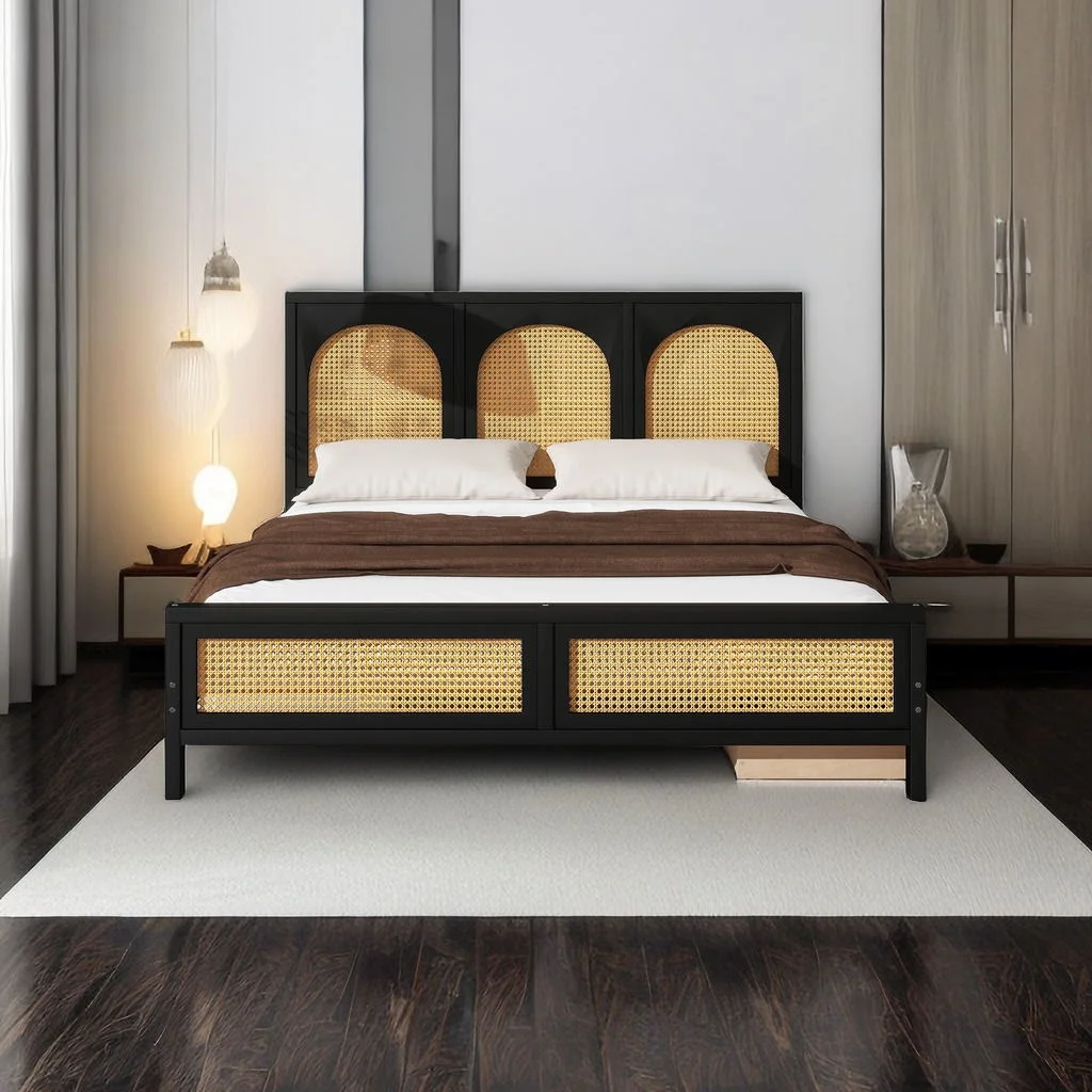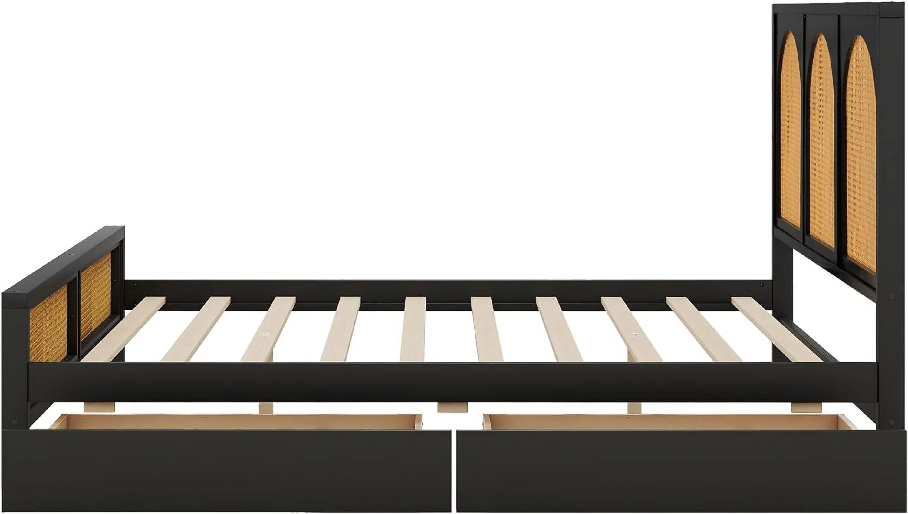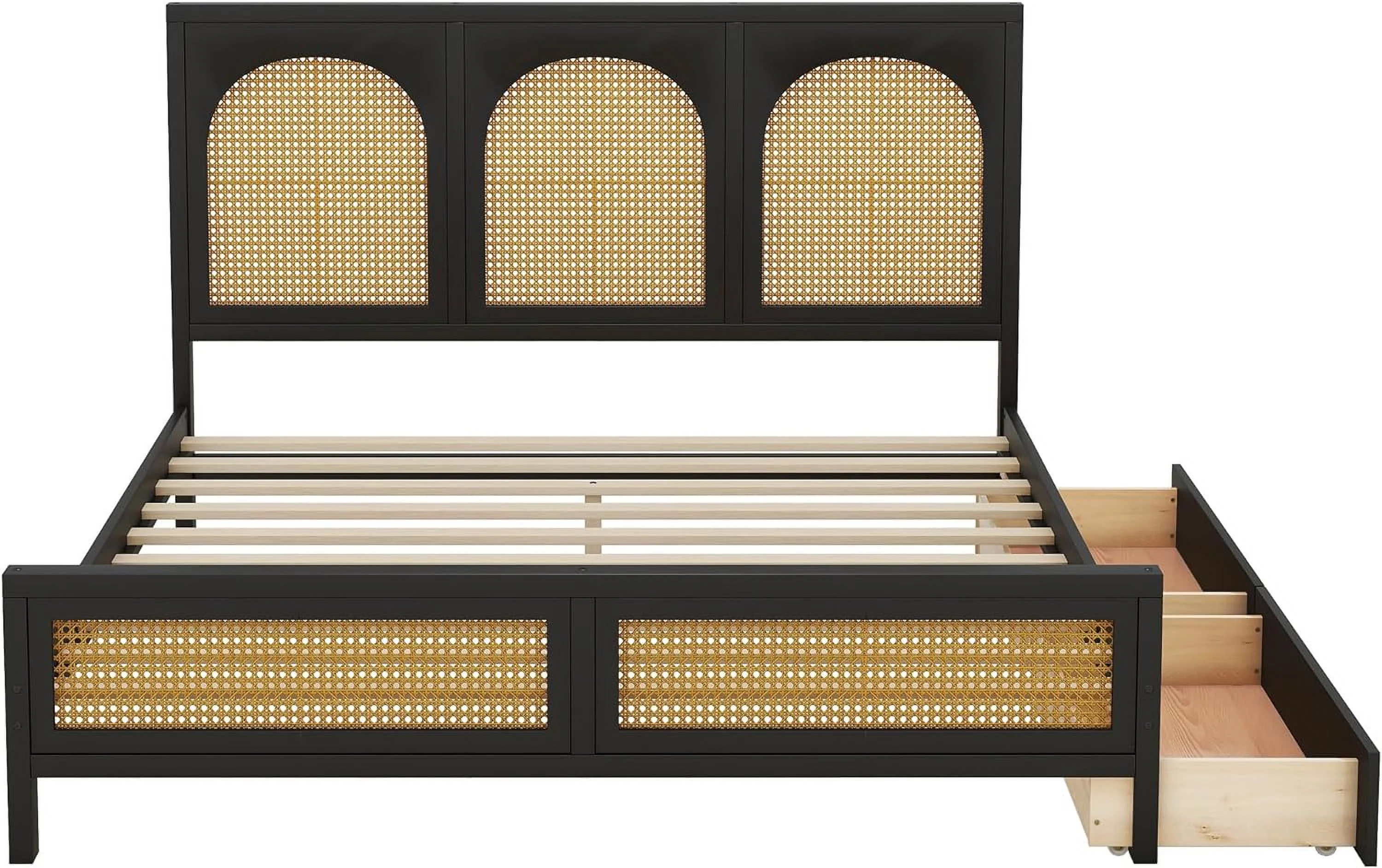 Queen Size Wood Storage Platform Bed with 2 Drawers, Rattan Headboard and Footboard