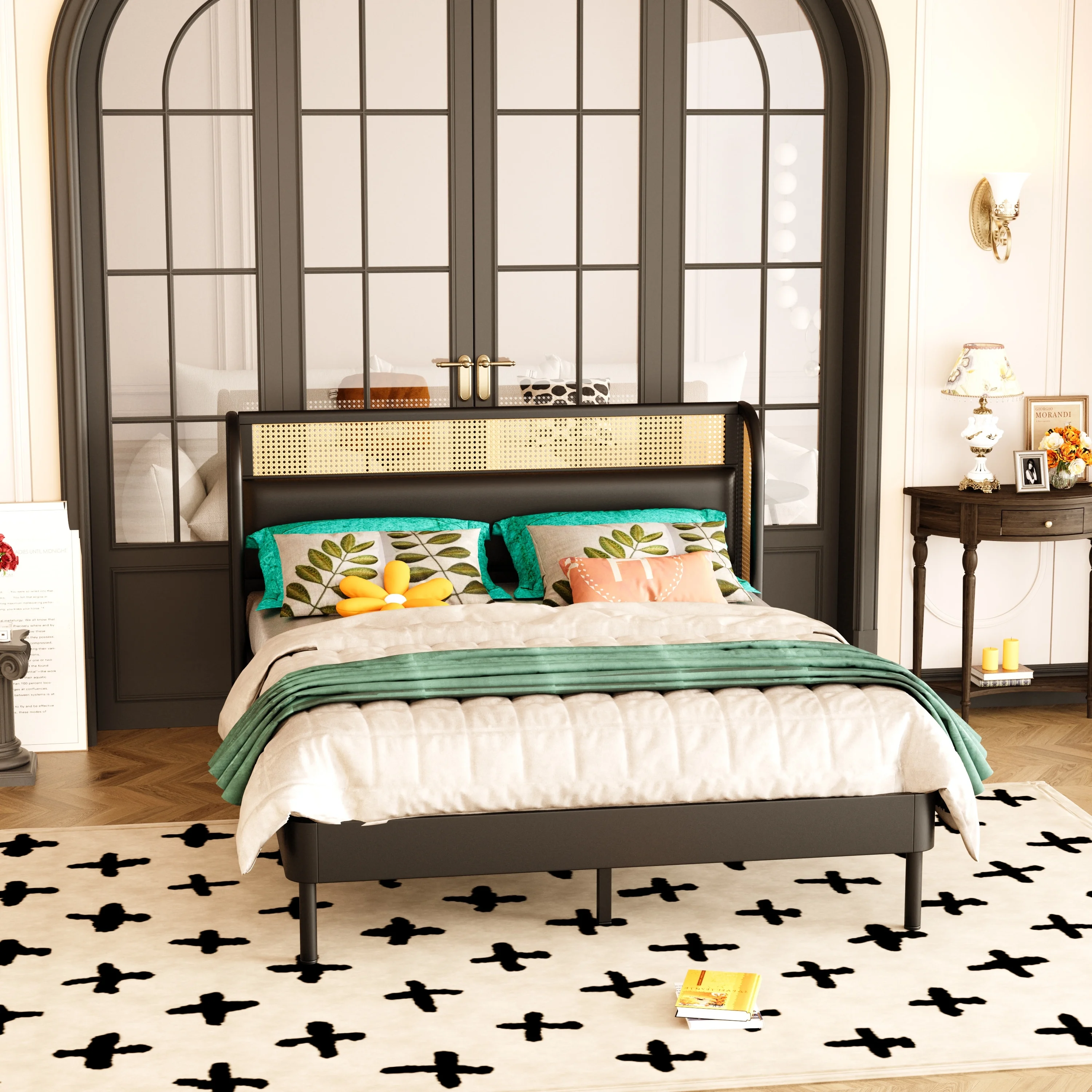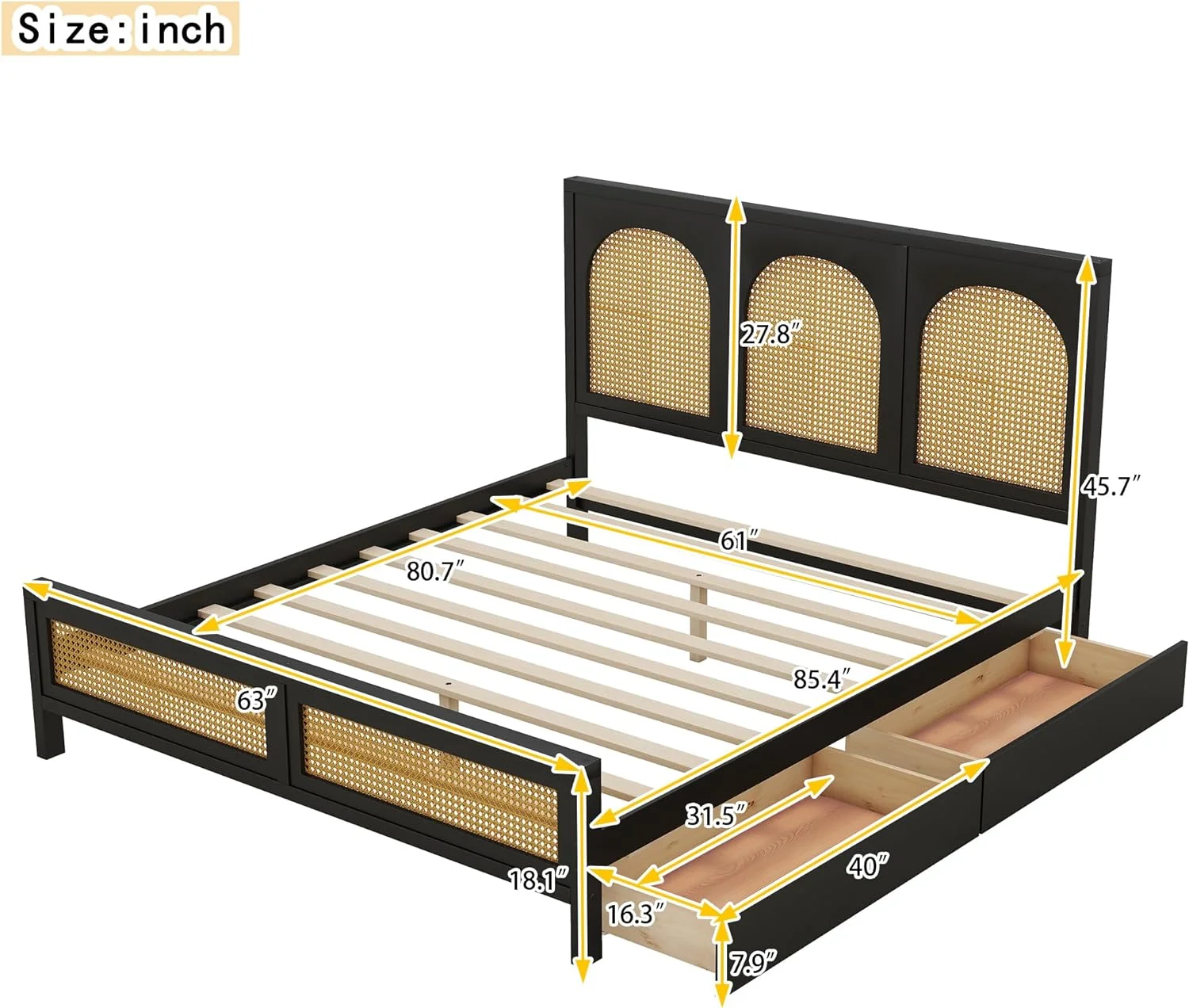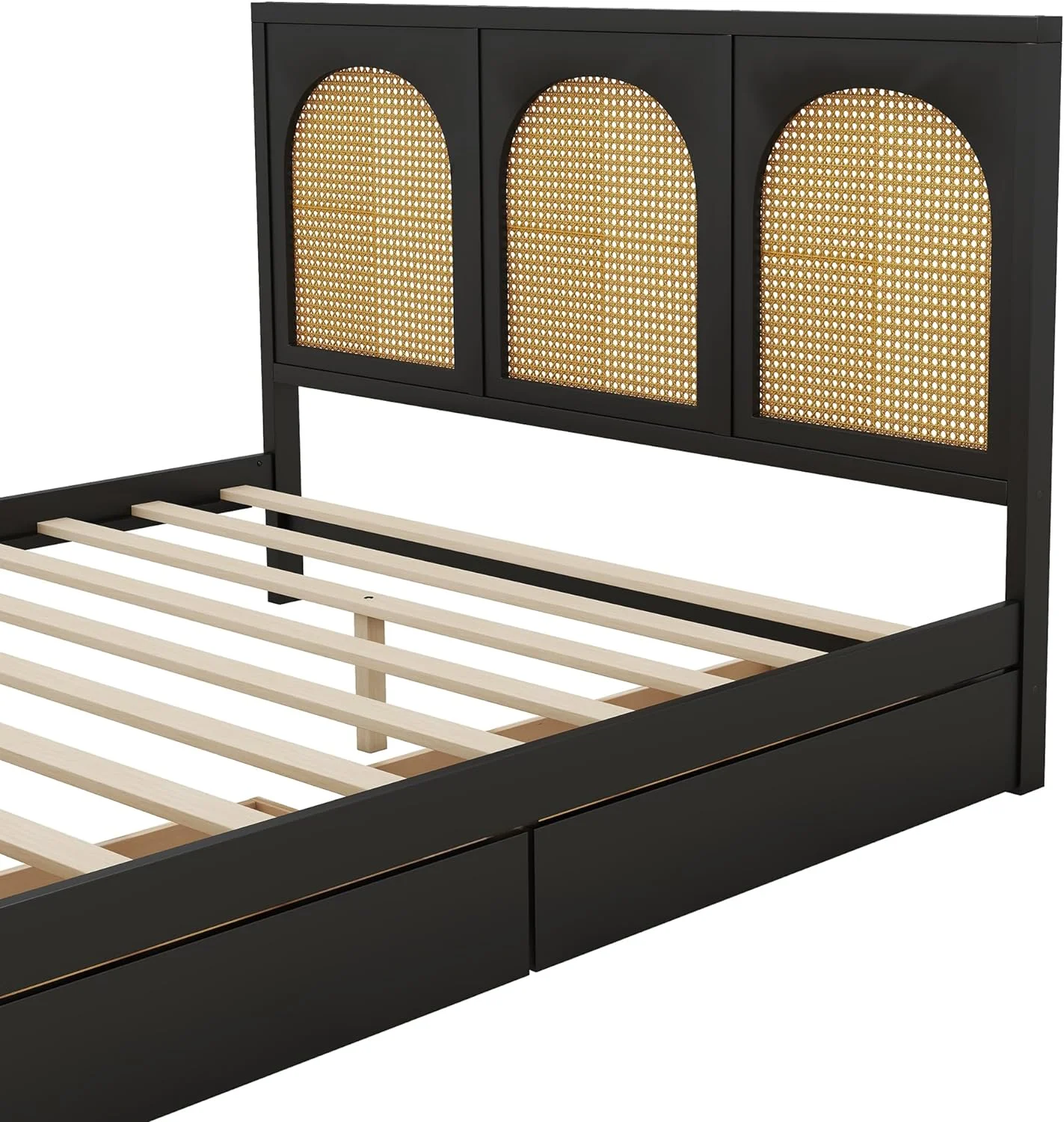 Queen Size Wood Storage Platform Bed with 2 Drawers, Rattan Headboard and Footboard