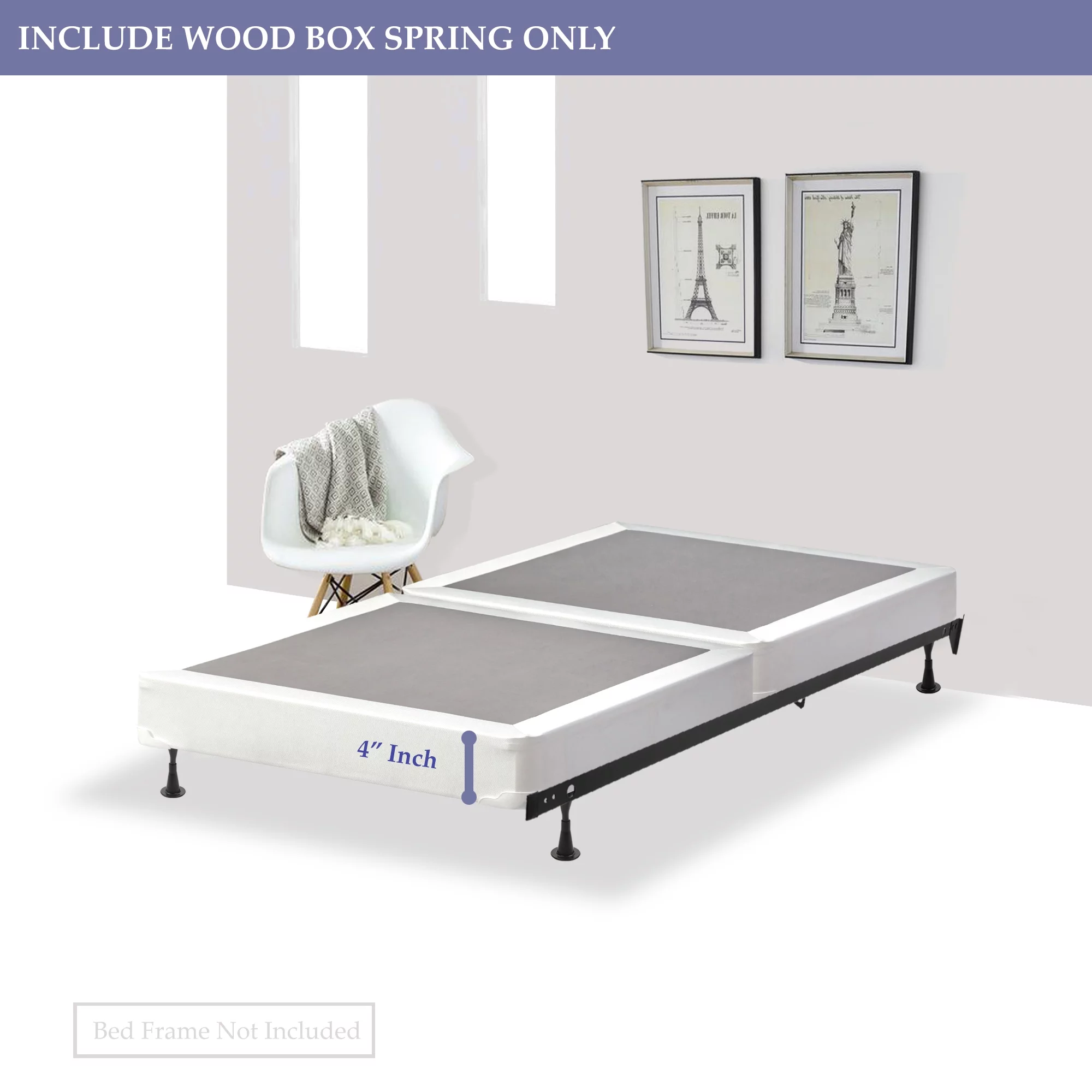 Wayton, 4" Split Sturdy Fully Assembled Wood Box Spring for Mattress, Twin, White