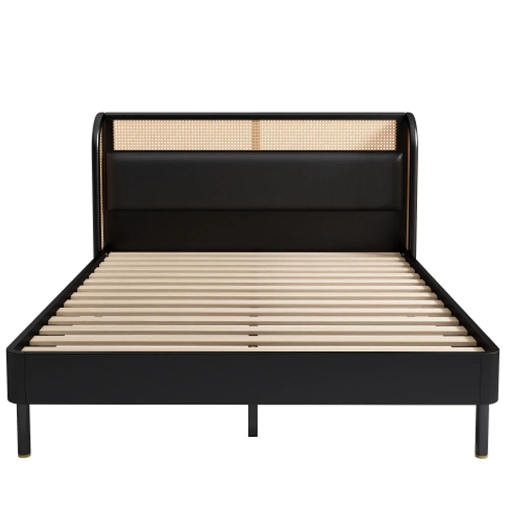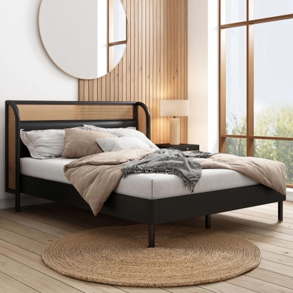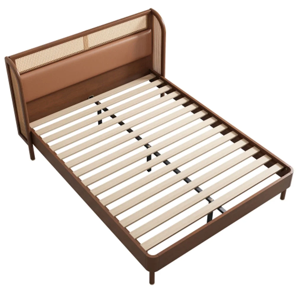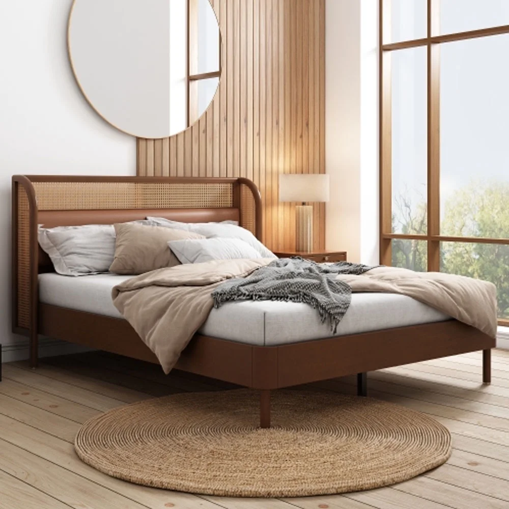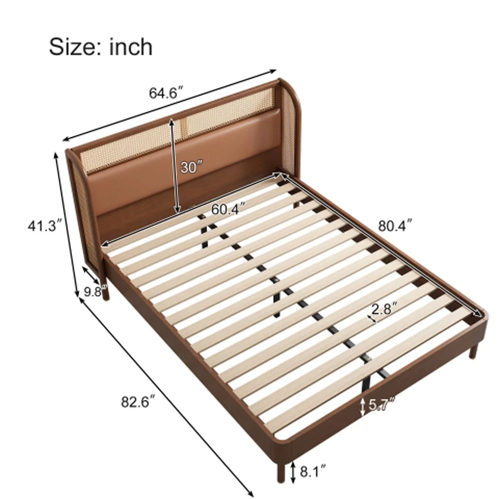 Queen Size Modern Cannage Rattan Wood Platform Bed with PU Leather Headboard Walnut - Queen
