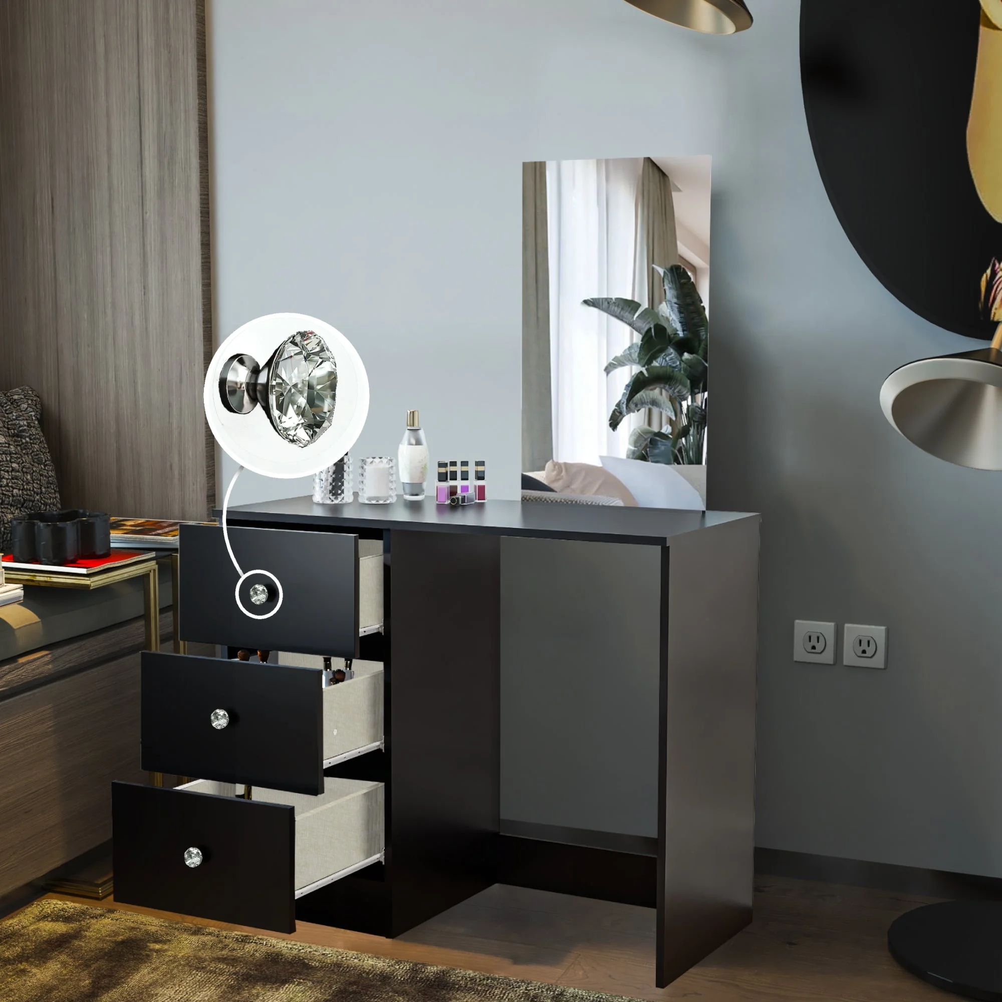 Boahaus Kira MINI Modern Makeup Vanity Table, 3 Drawers, Mirror, Crystal Knobs, Black, for Bedroom