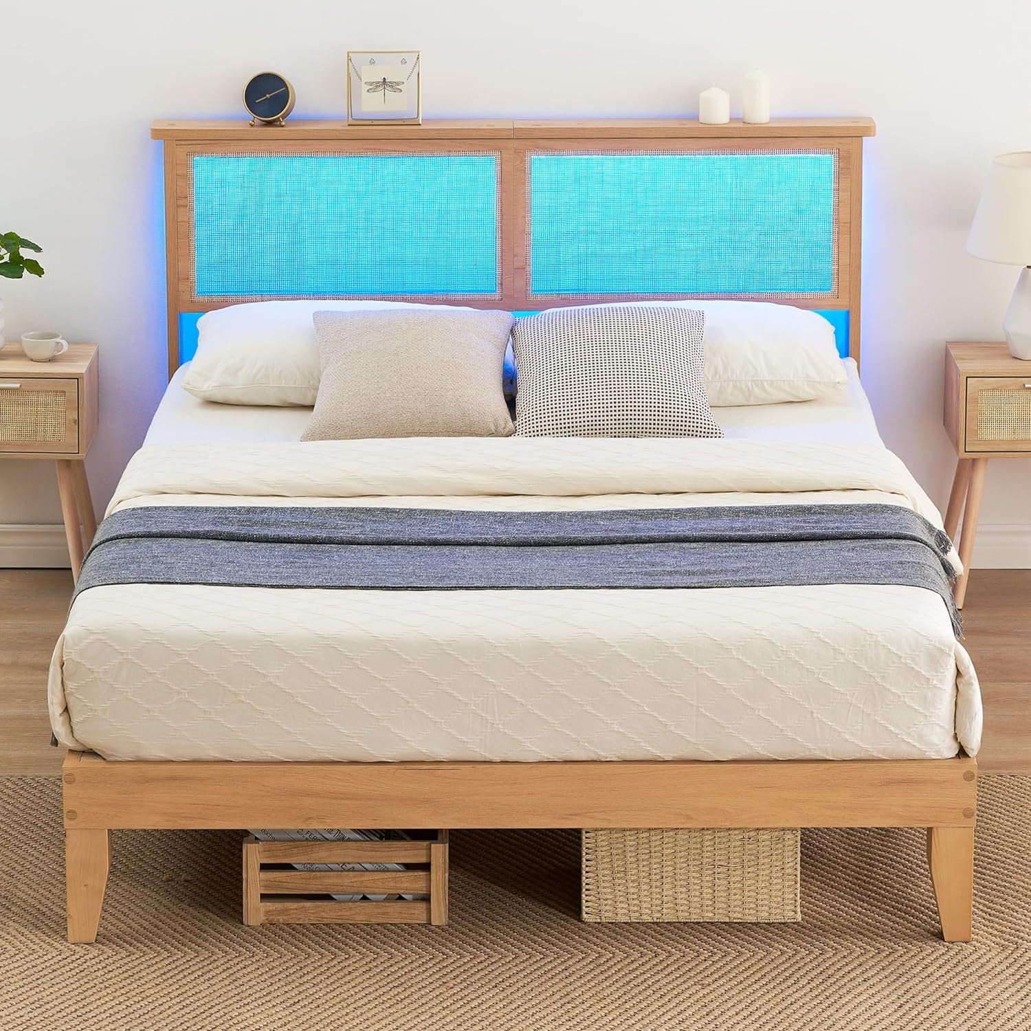 Queen Size Modern Cannage Rattan Wood Platform Bed with PU Leather Curved Wingback Headboard, No Box Spring Neede Walnut - Queen