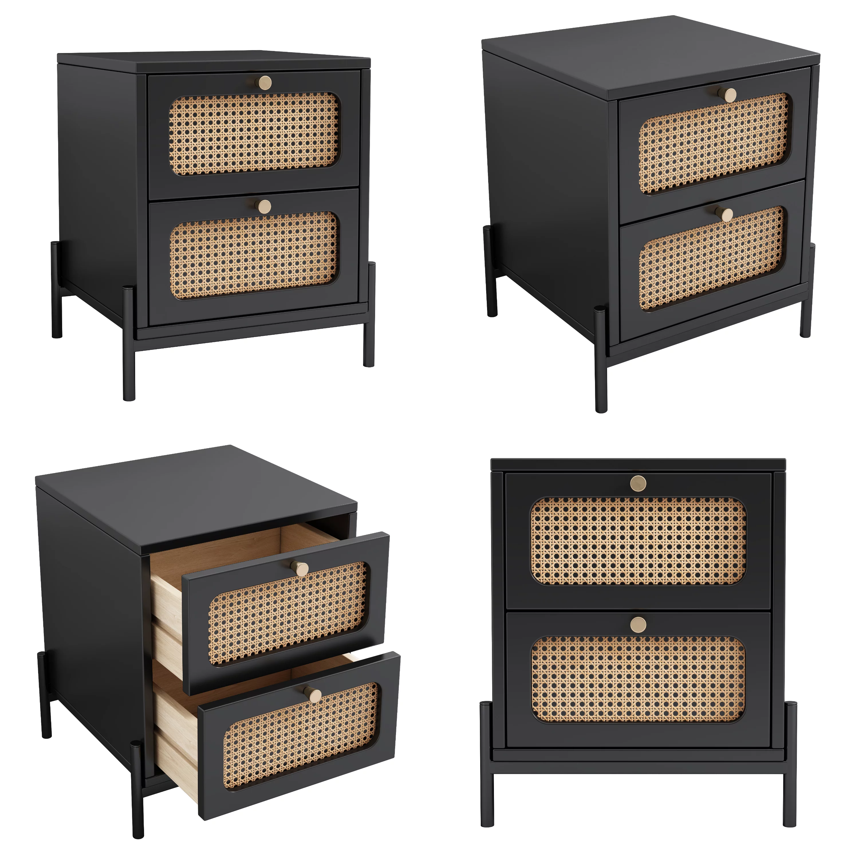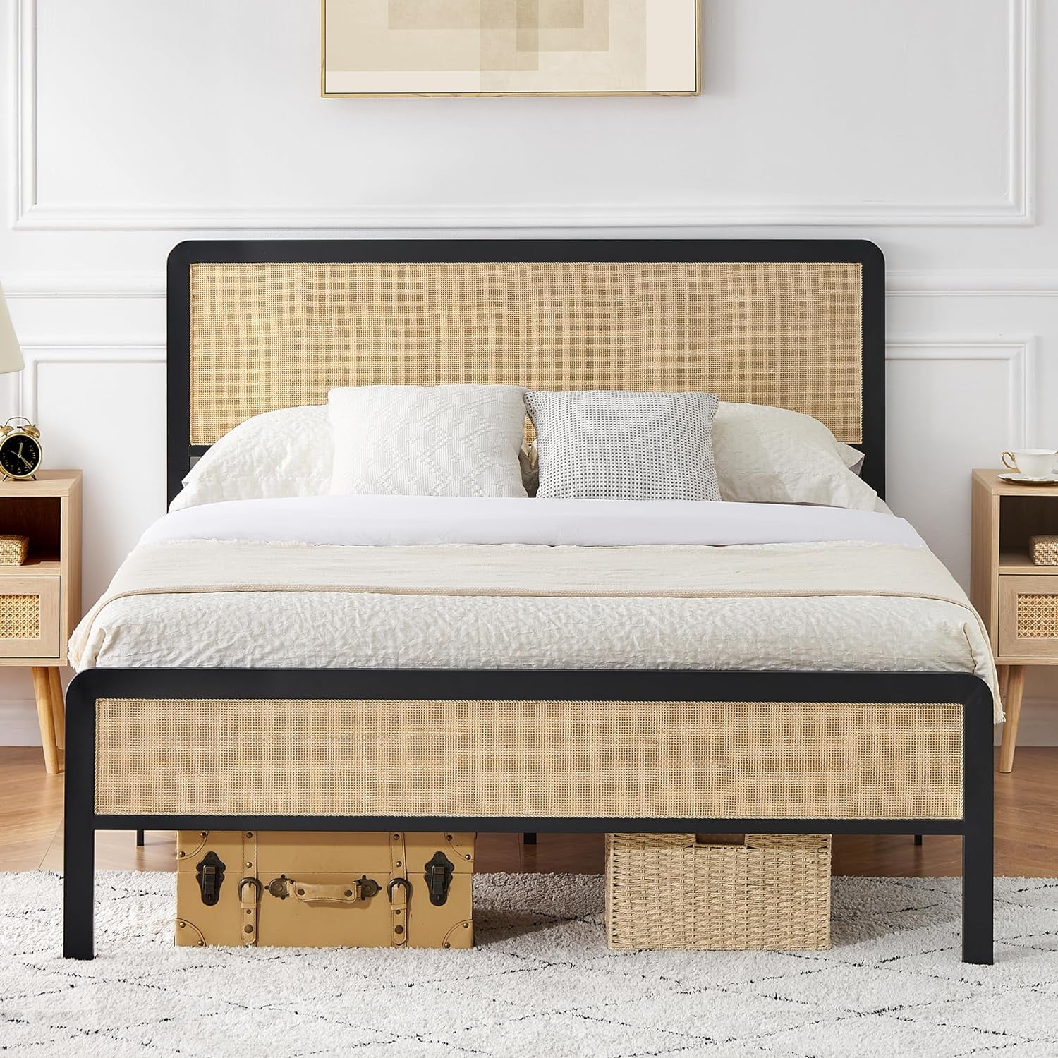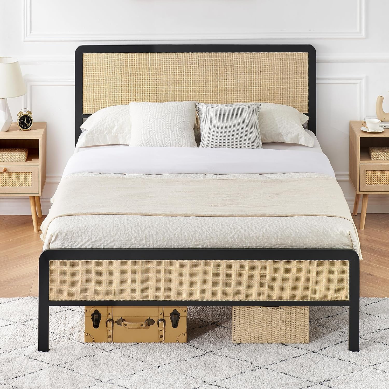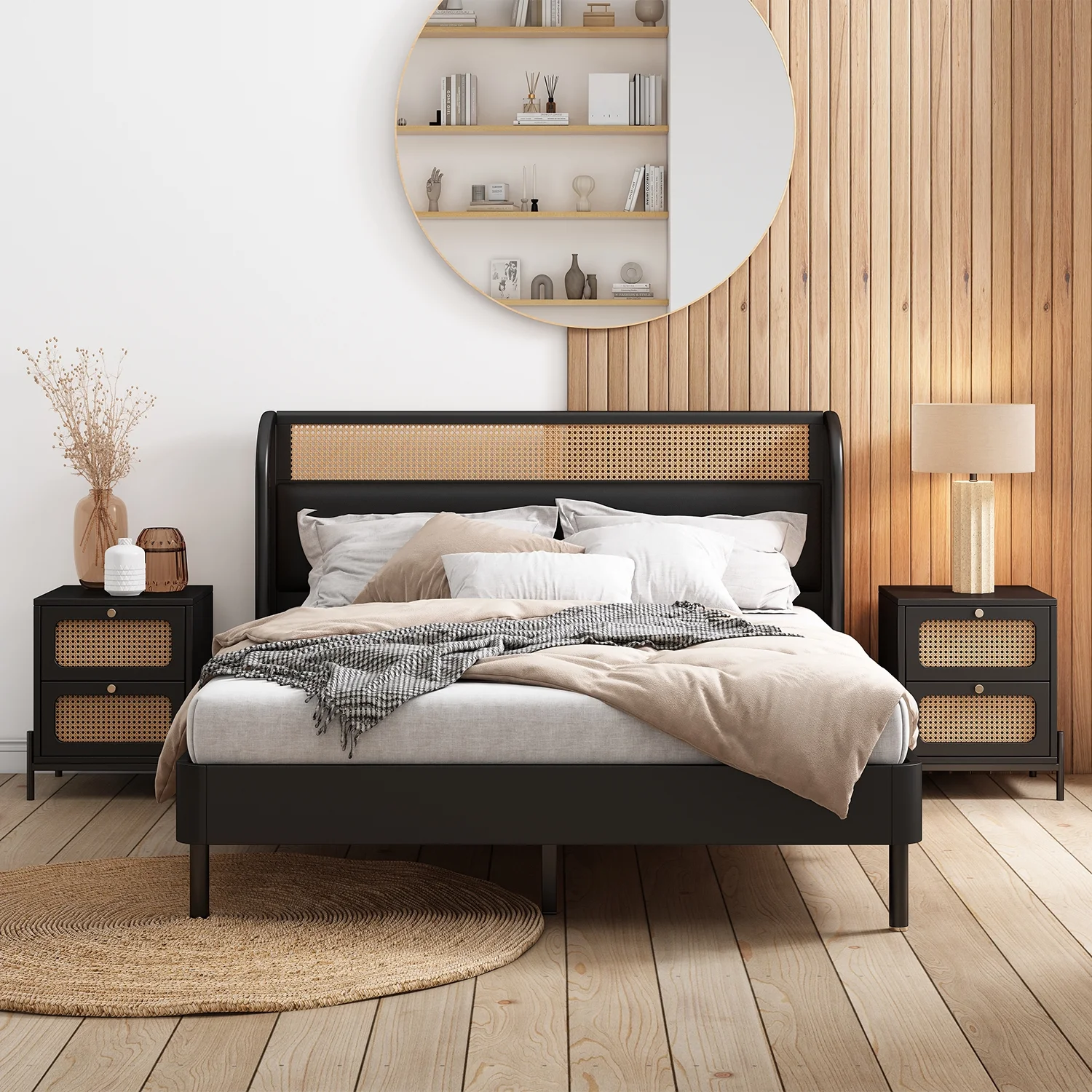 CoSoTower 3 Pieces Modern Cannage Rattan Platform Queen Bed + Nightstand*2, Black