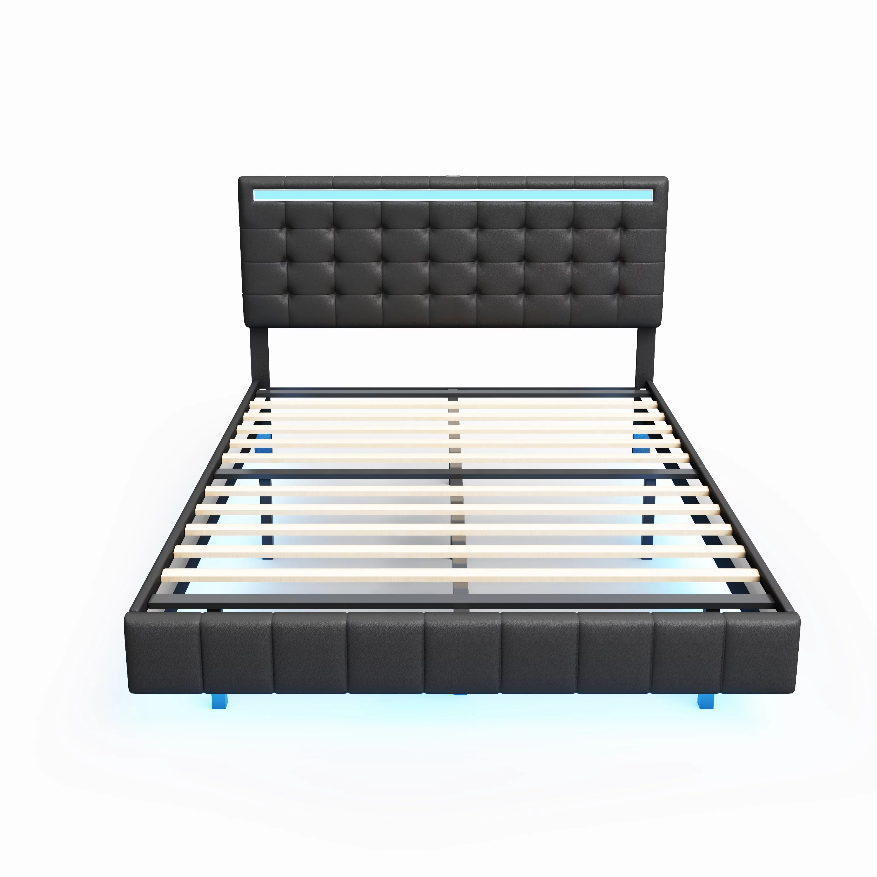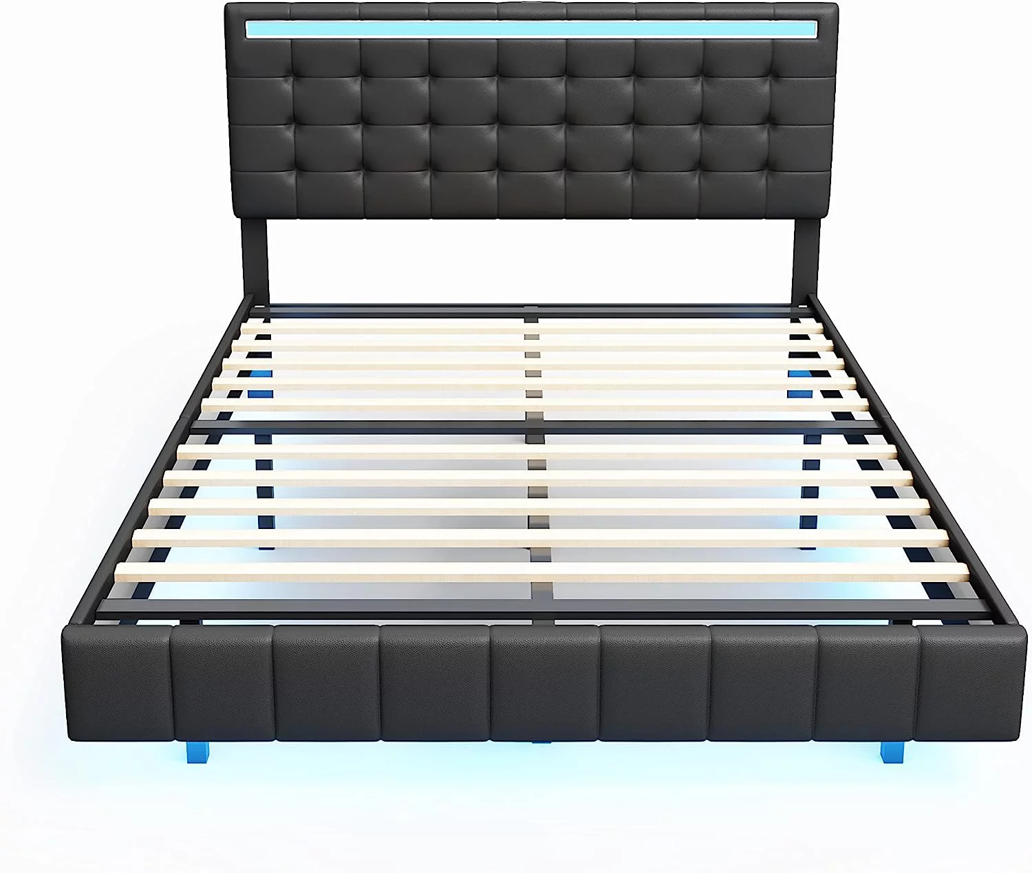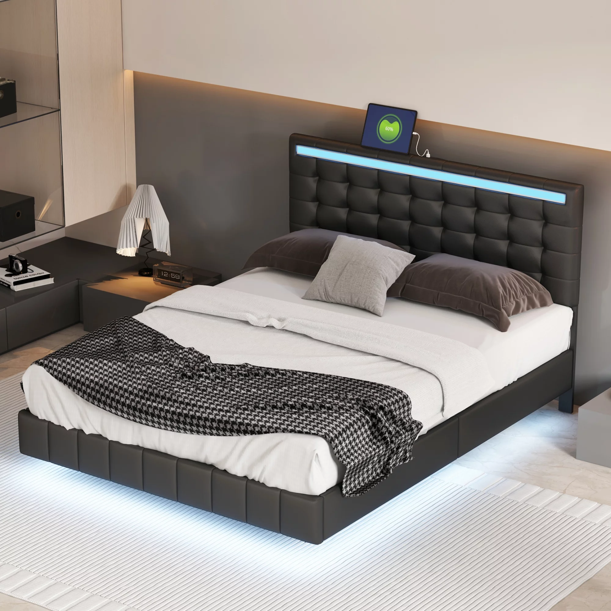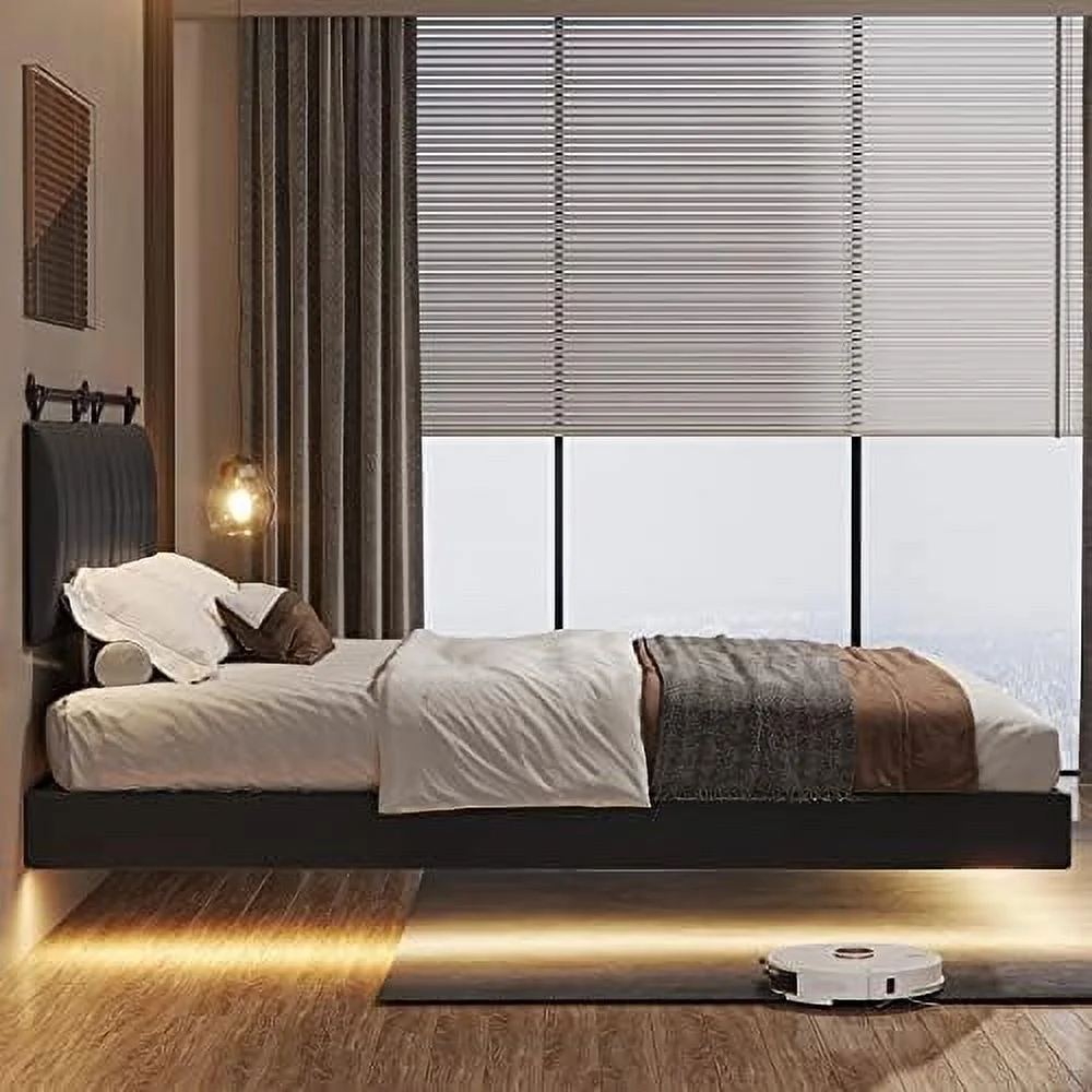 Queen Size Floating Bed Frame with LED Lights and USB Charging,Cosymart Modern Upholstered Platform LED Bed Frame,Black