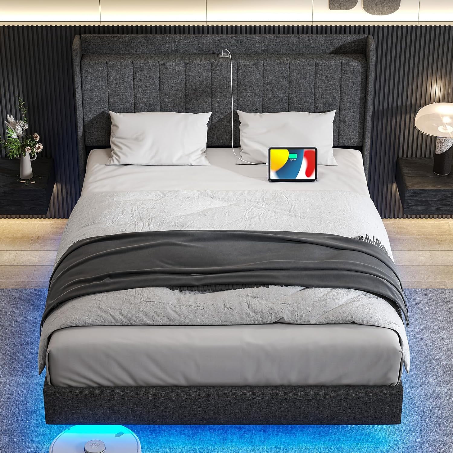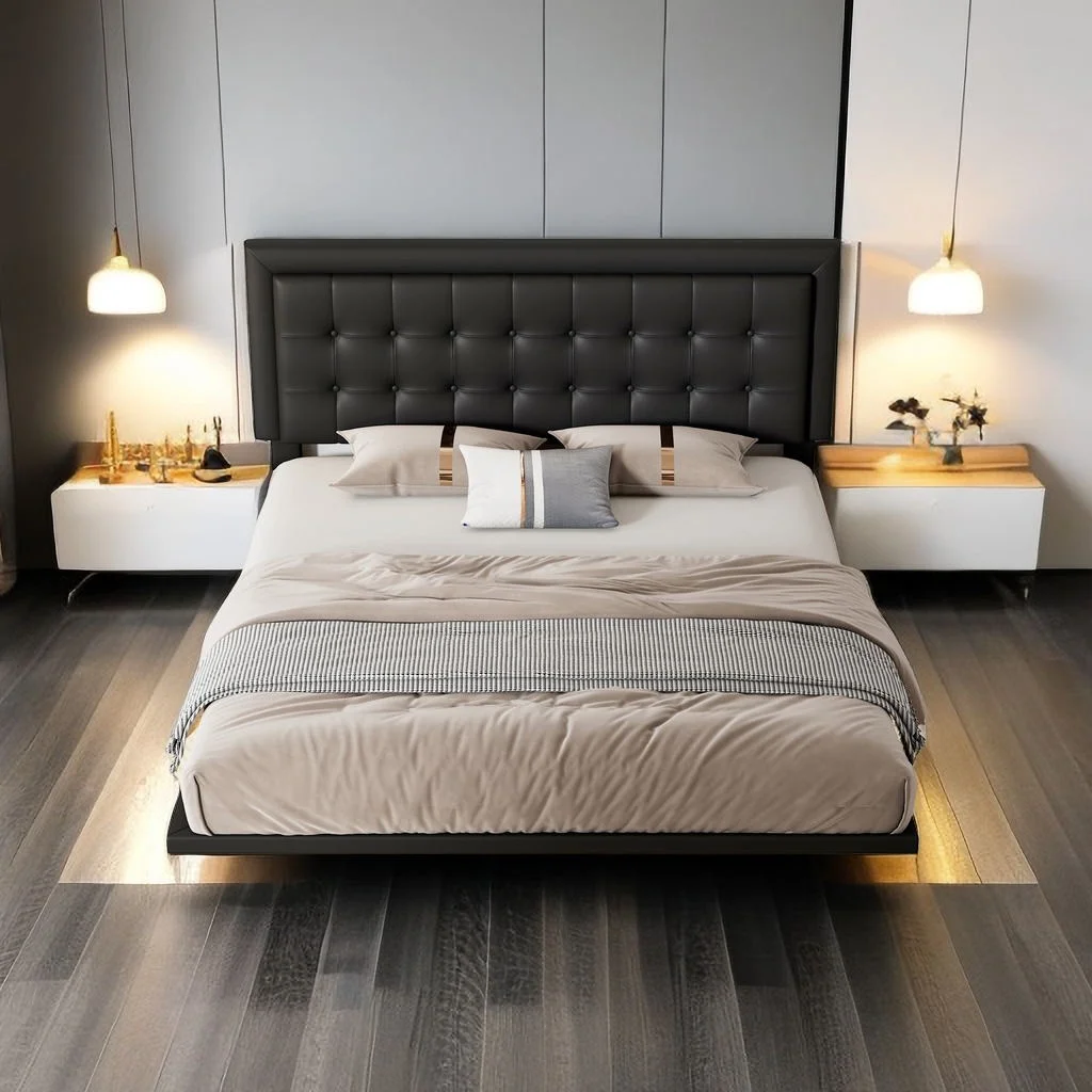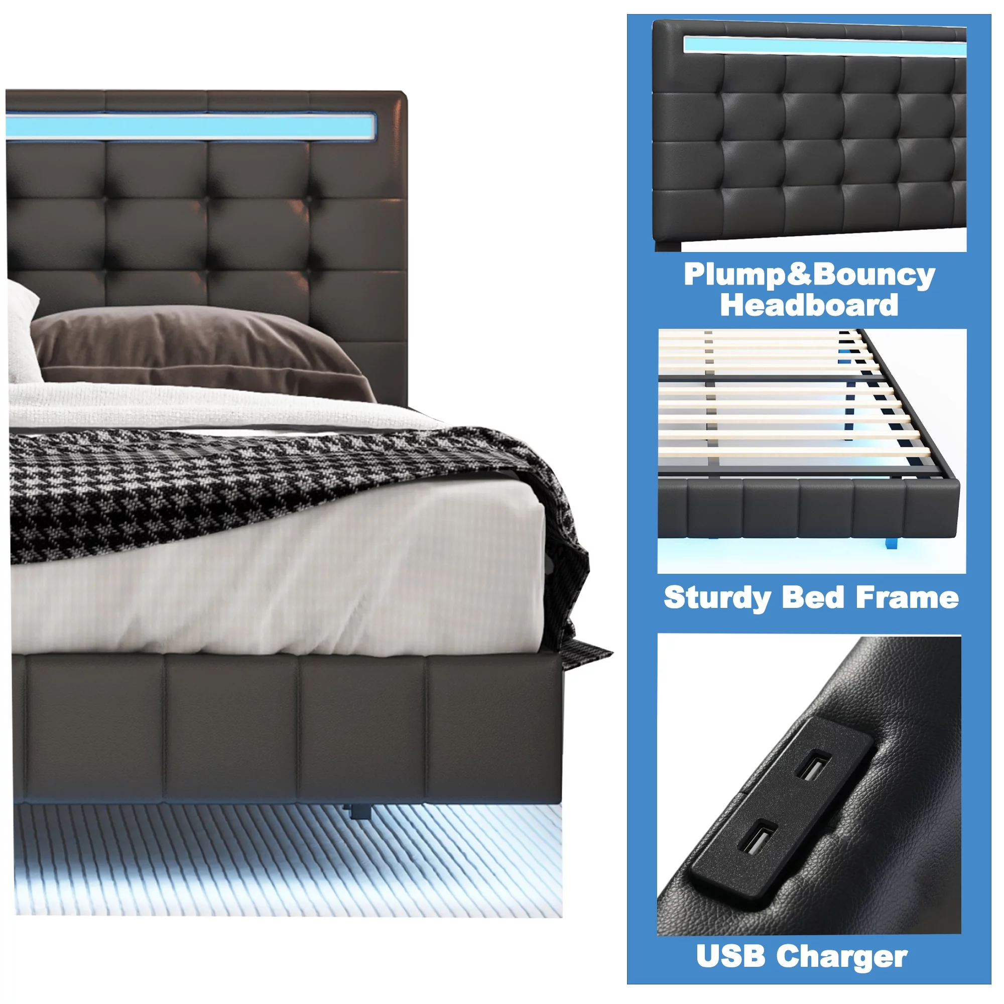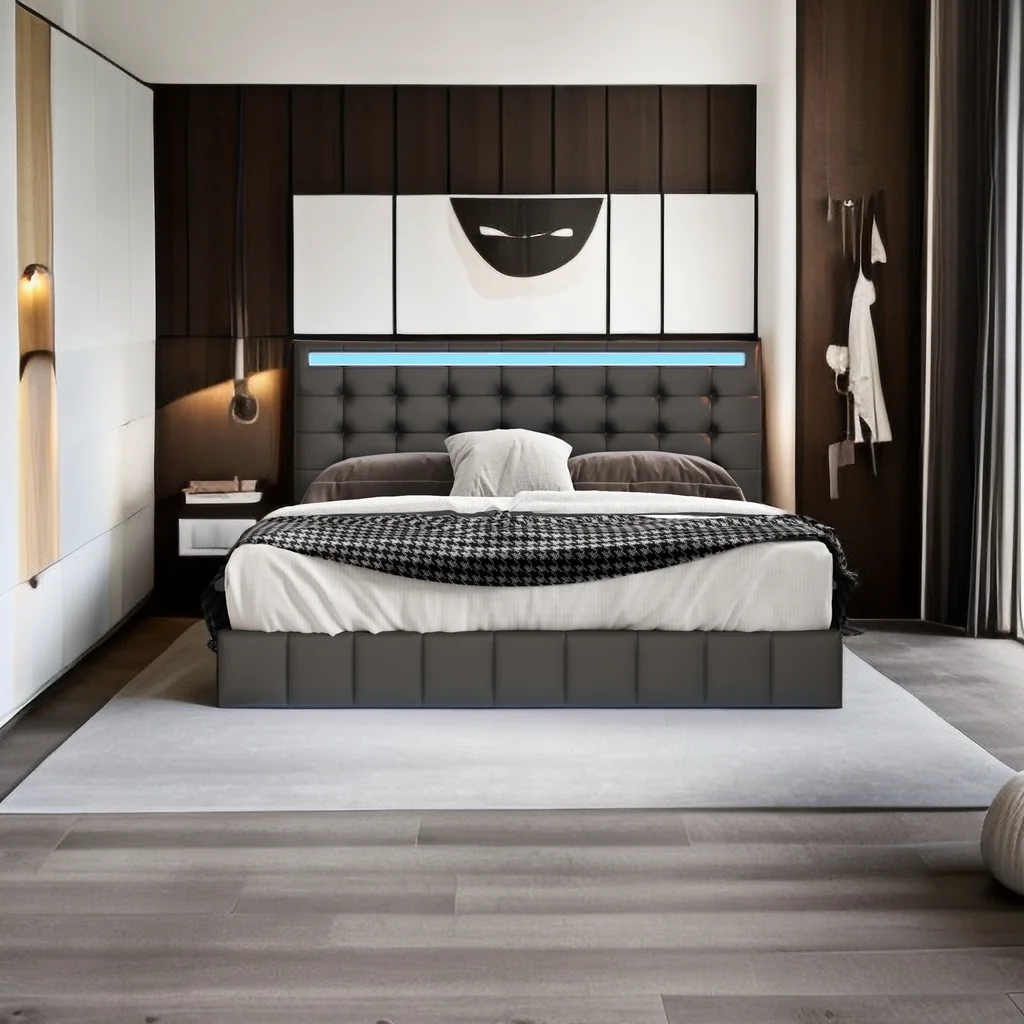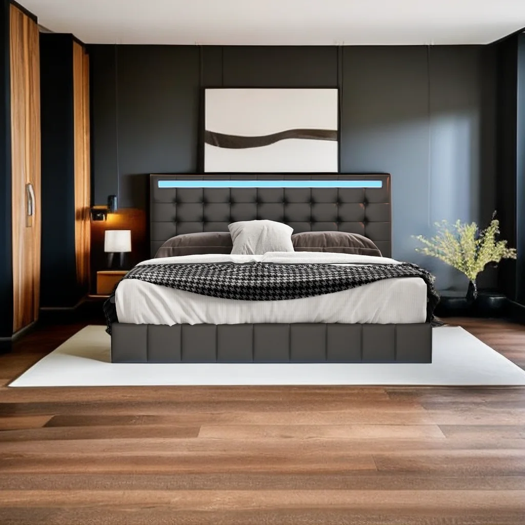 Queen Size Floating Bed Frame with LED Lights and USB Charging,Cosymart Modern Upholstered Platform LED Bed Frame,Black
