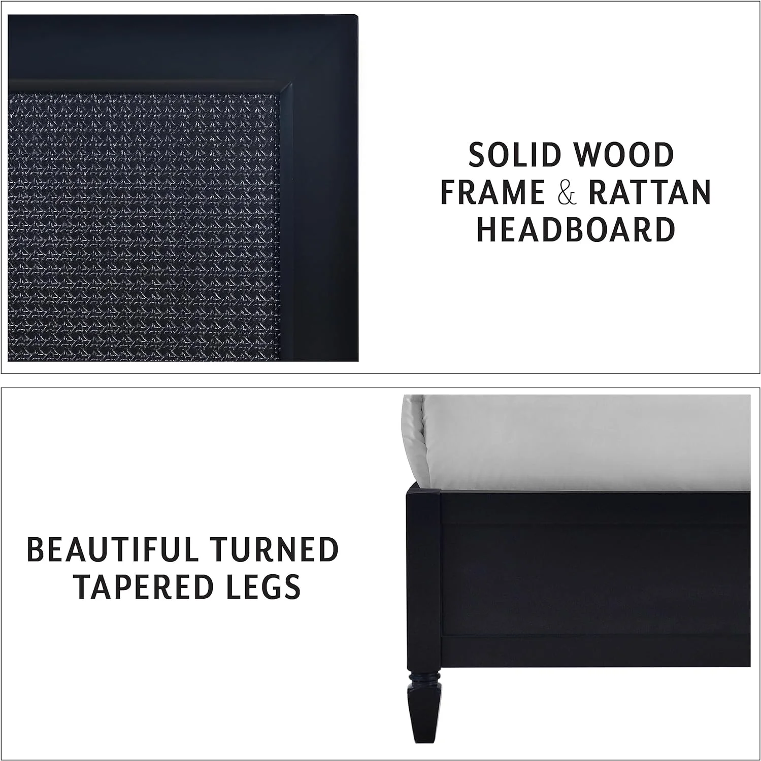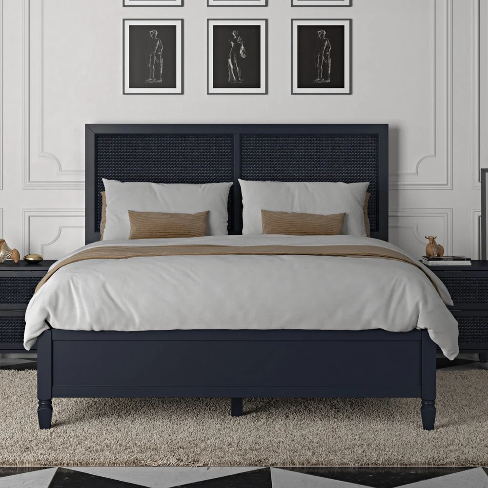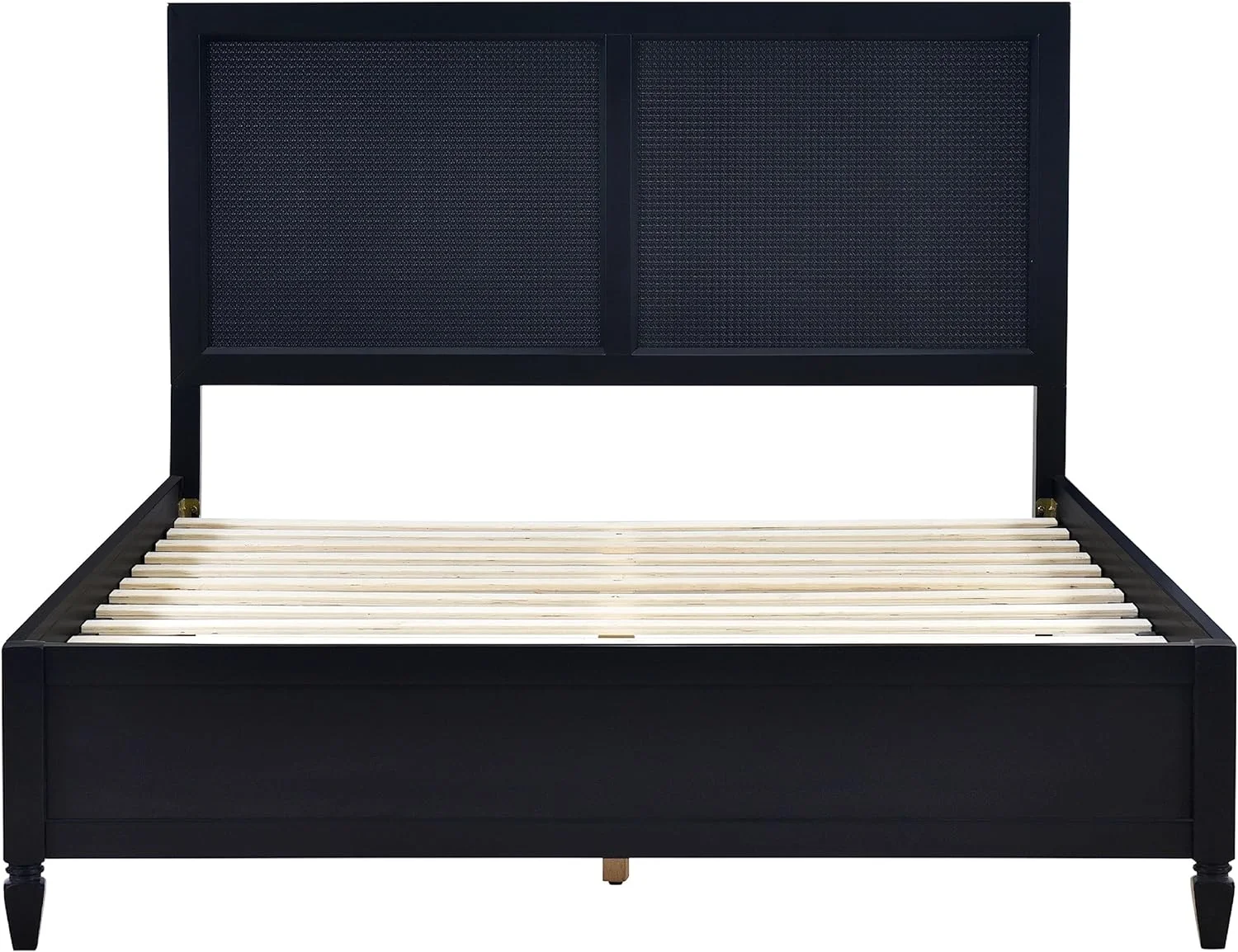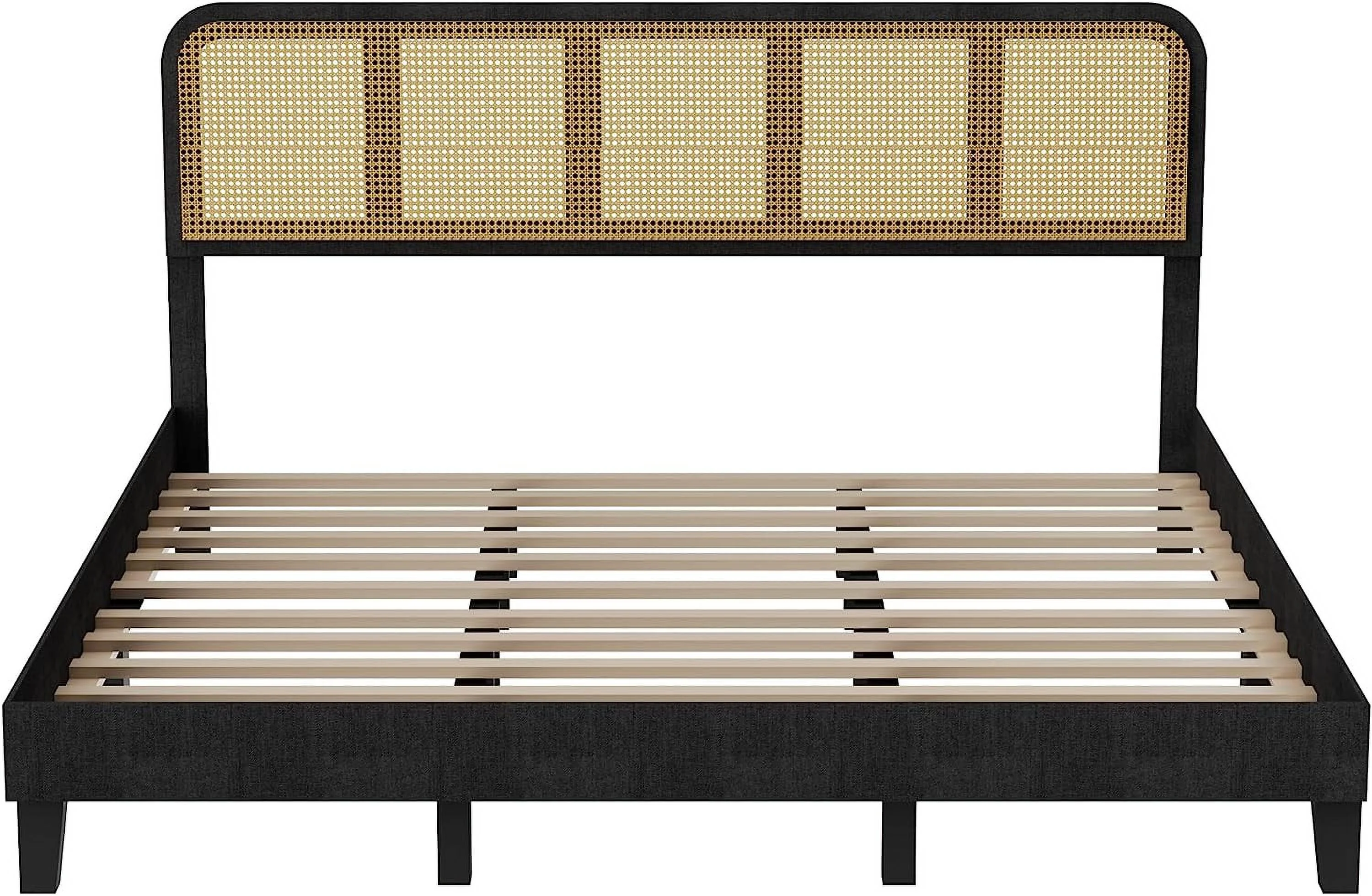 DG Casa Cove Queen Bed Frame - Black Wood Upholstered Platform, Full Slat, No Box Spring, Rattan Panels