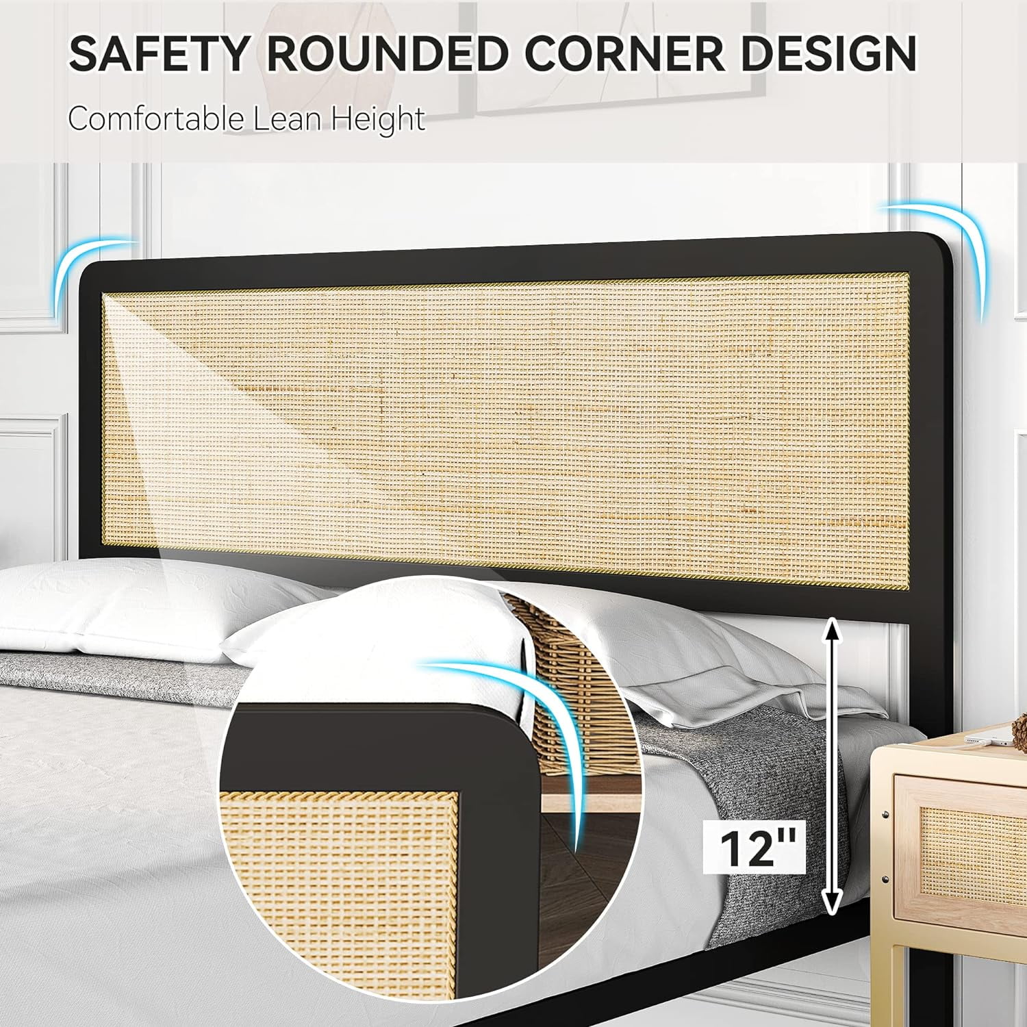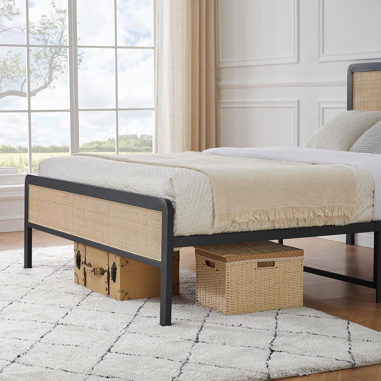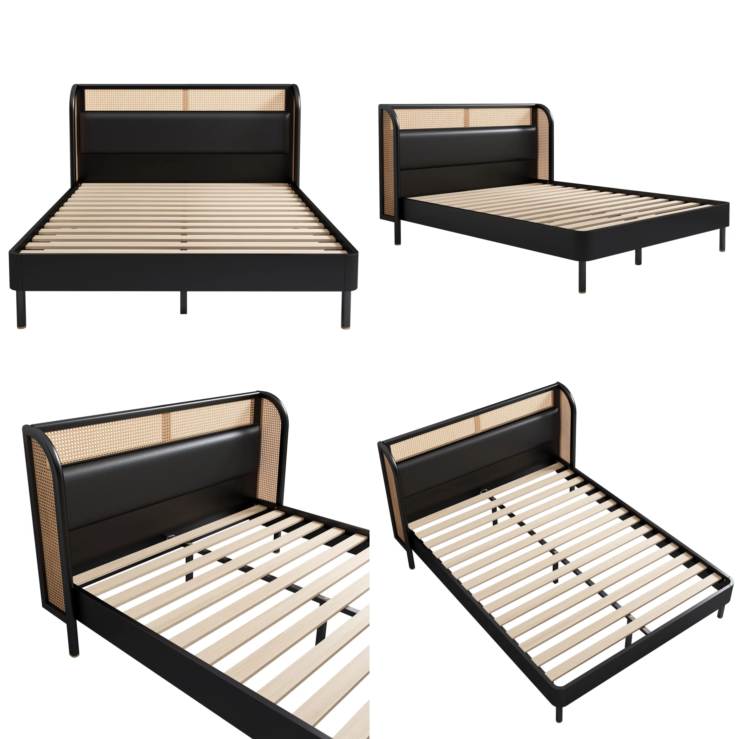 DG Casa Cove Queen Bed Frame - Black Wood Upholstered Platform, Full Slat, No Box Spring, Rattan Panels